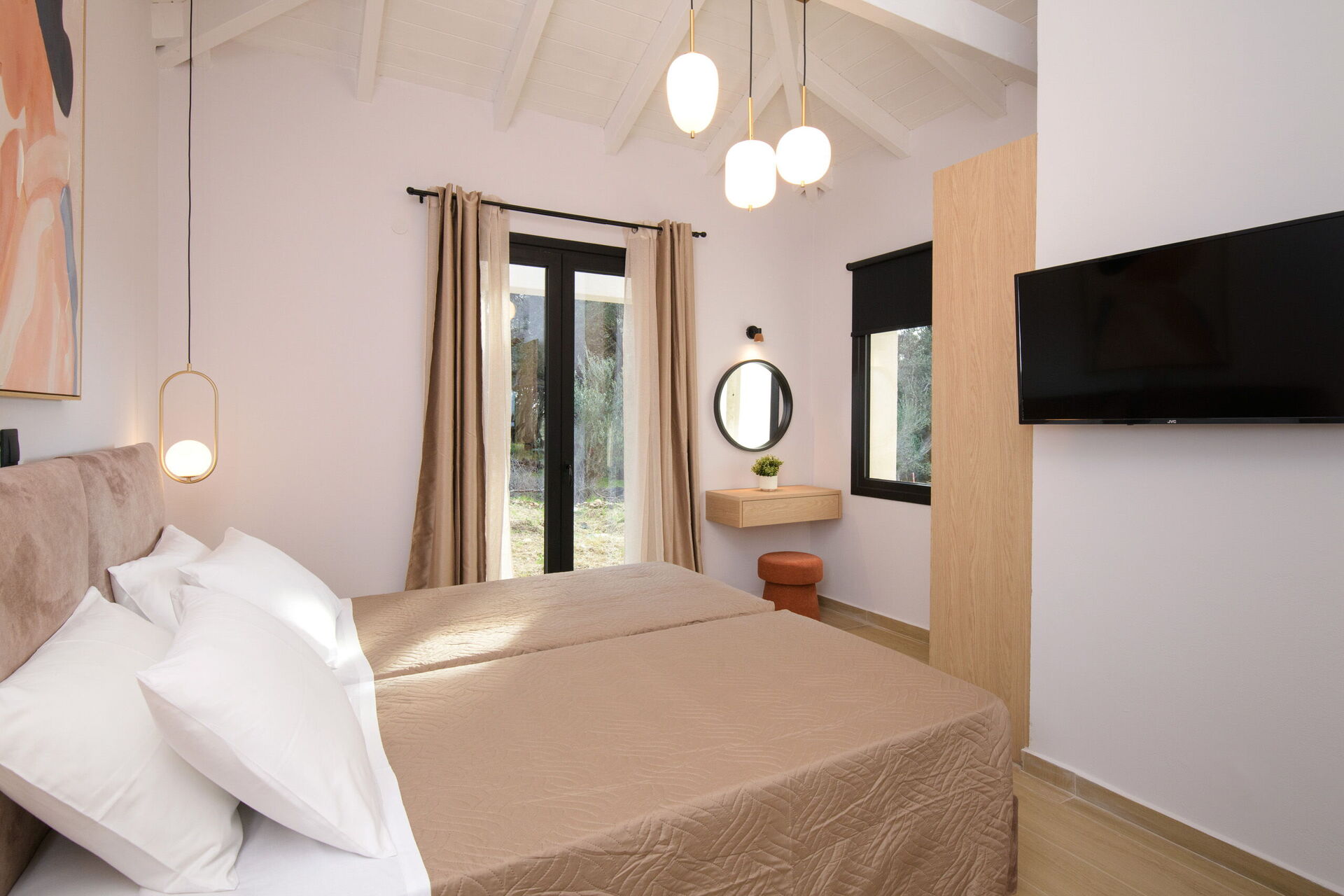 Nur knapp 1,5 km entfernt finden die Gäste die kristallklaren, flachen Gewässer des Strandes von Prasoudi vor, gefolgt von den unberührten Stränden von Paramonas und den spektakulären Dünen von Chalikounas. Wer in die Geschichte und die lokale Kultur eintauchen möchte, sollte einfach das Dorf Agios Mattheos (5 km) besuchen, das mit seinen authentischen Tavernen und malerischen Gassen lockt. Jahrtausende alte Geschichte wird in der nahegelegenen Festung Gardiki und der prachtvollen Kaiserresidenz Achilleion lebendig.