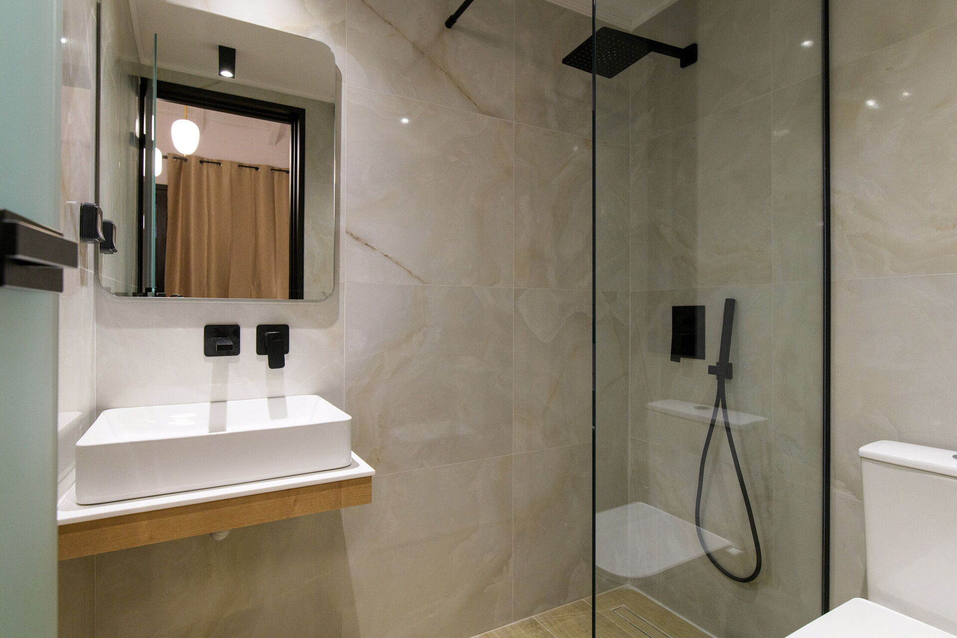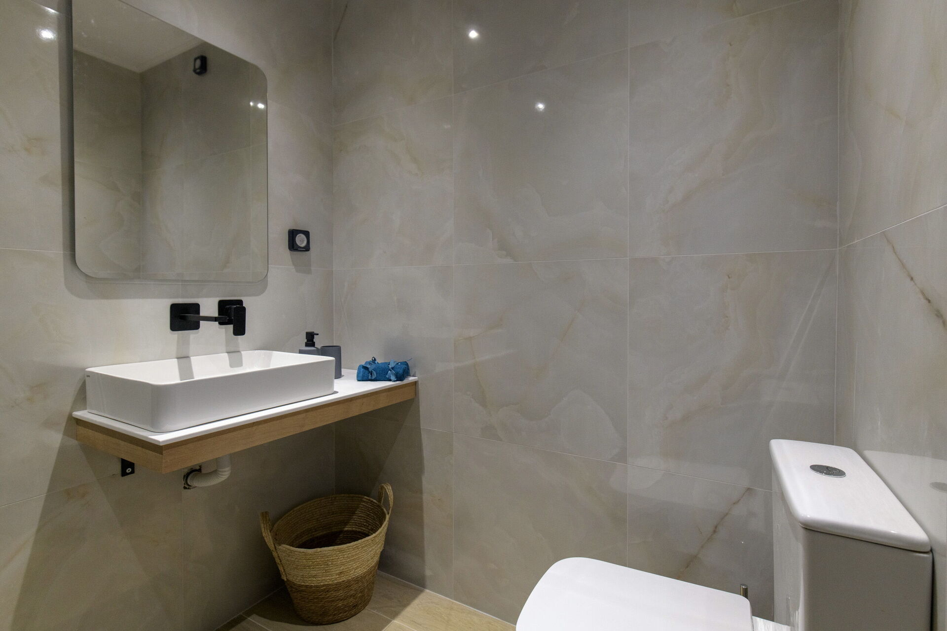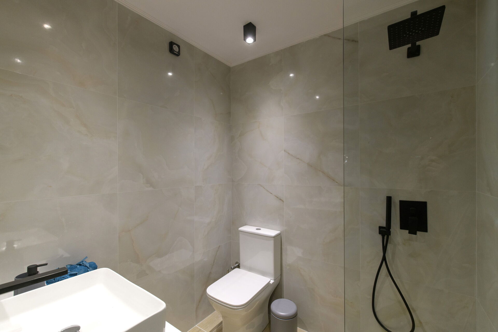 Erdgeschoss: Wohnbereich mit Wohnzimmer, Essbereich und Küche (Backofen, Gefrierschrank, Geschirrspüler, Espressomaschine), zwei Doppelzimmer mit jeweils privatem Duschbad.