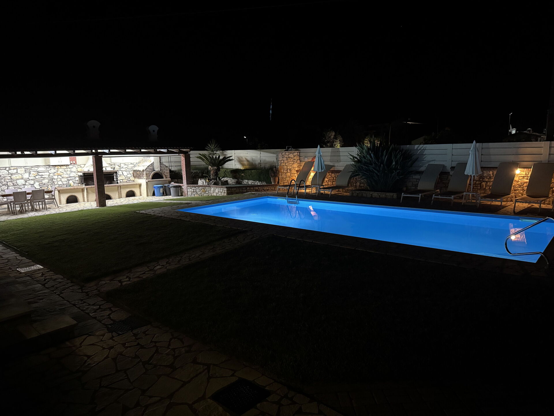 The villa is very well suited for a family or large group vacation. 2 minute walk to the main Acharavi town with restaurants, ice cream, bars, supermarkets, and shops. 10 minute walk or quick drive down to the beach. The nearby beaches are rocky (bring water shoes), or it’s a 5-10 minute drive up to Almyros beach which is sandy if that’s what you’re looking for. Corfu has a ton of different style beaches, so you have lots of options with a car. The villa has air conditioning with two units (one for each floor), so you’ll need to keep bedroom doors open to keep each room cool. AC is necessary in July while we were there (at least for our group of Americans). Highly recommended. As advertised. The large electrical wire over the pool really didn’t bother us during our stay.