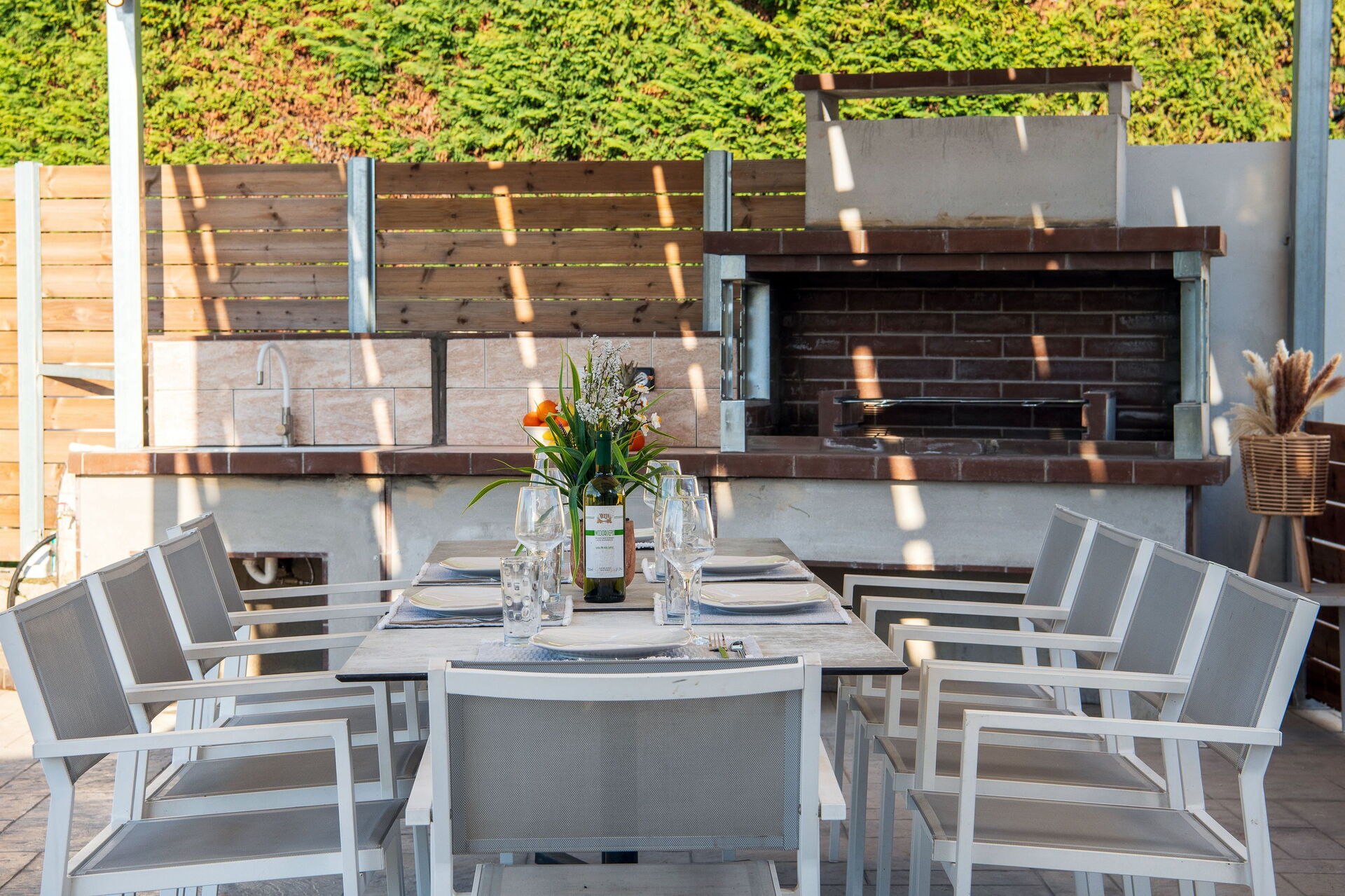 - Außenbereich mit Grill, Tisch und Stühlen für Mahlzeiten im Freien