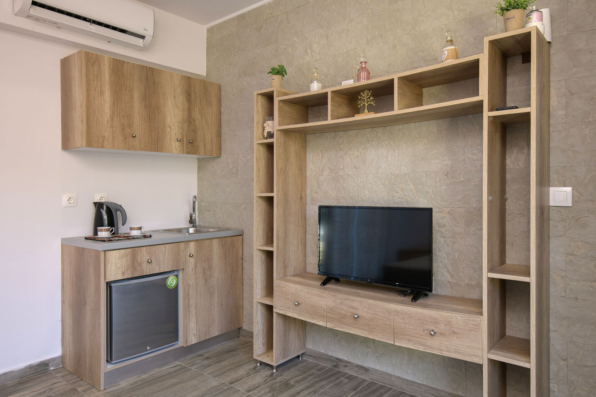 Erdgeschoss: Wohnzimmer (TV) mit Essbereich, Küche (Herd, Backofen, Gefrierschrank, Geschirrspüler, Mikrowelle, Kaffeemaschine, Toaster), Badezimmer (Waschmaschine), Zweibettzimmer mit privatem Bad mit Dusche.
