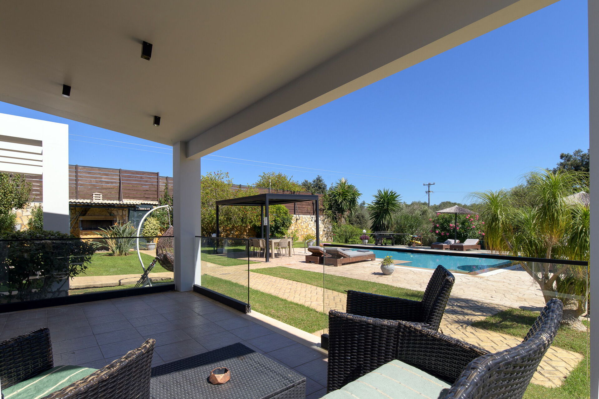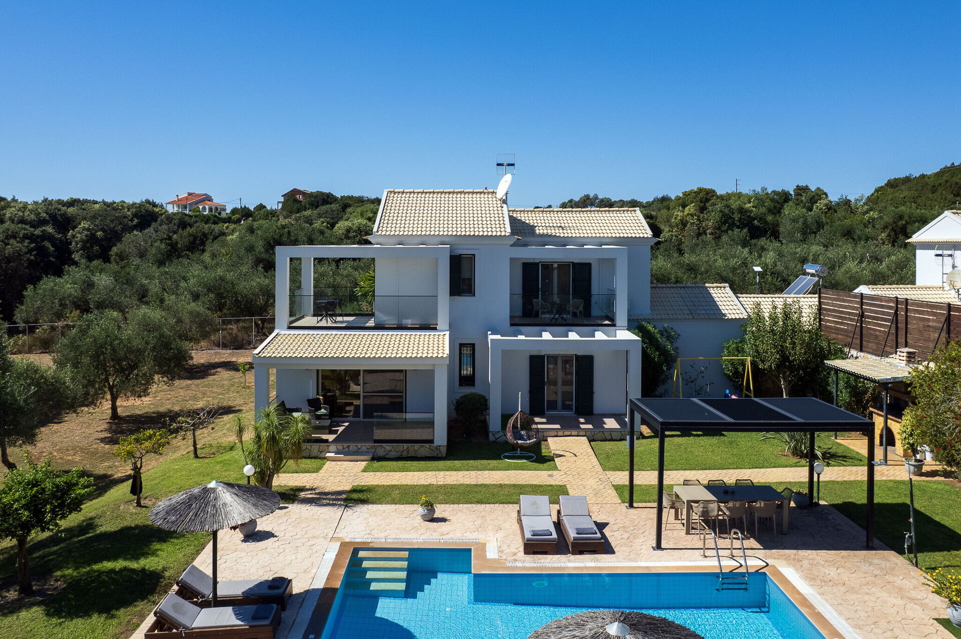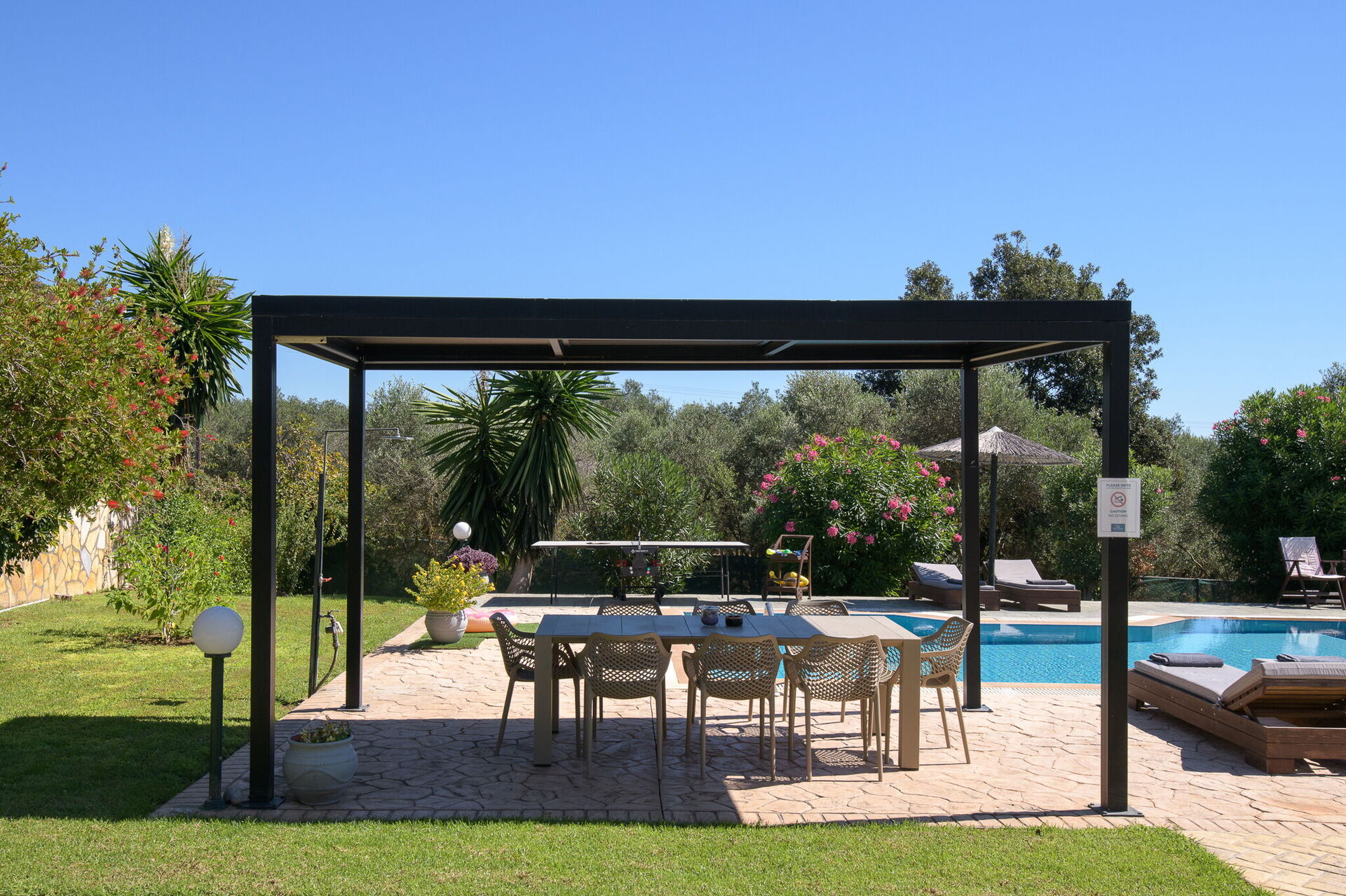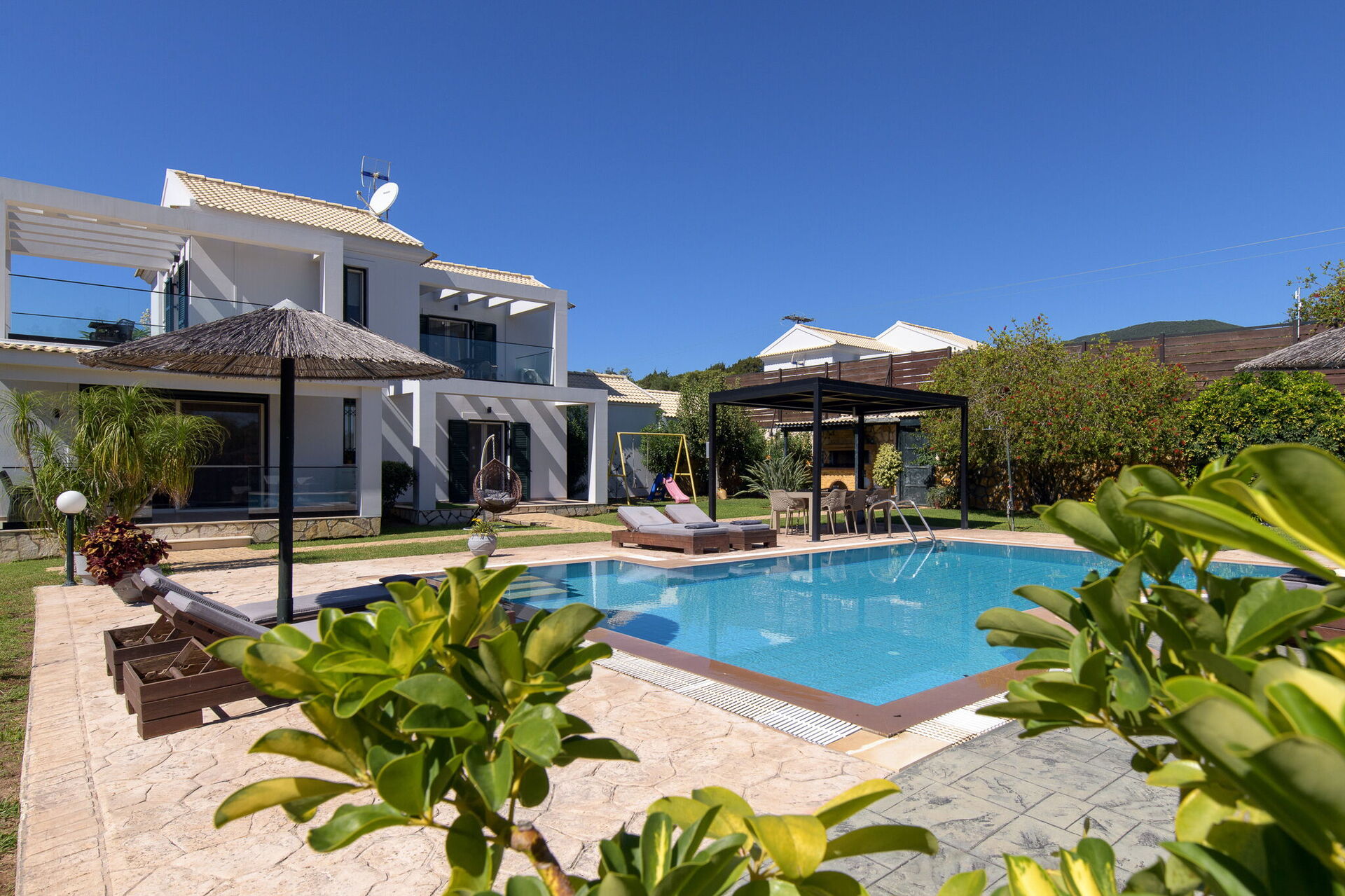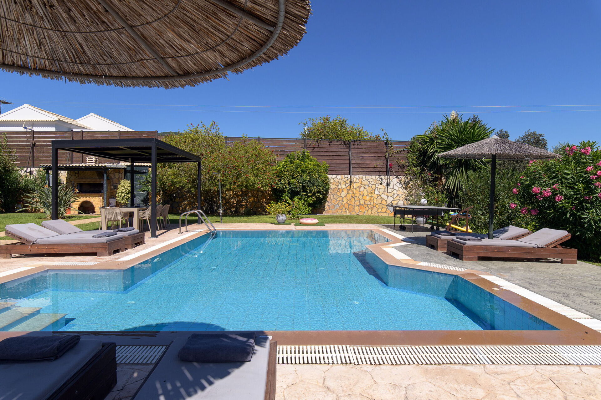 Die Außenbereiche bieten Gemeinschaftsbereiche, in denen die Gäste einen angenehmen Aufenthalt mit der Familie oder mit Freunden verbringen können, indem sie sich unter dem Pavillon entspannen oder im großen, ausgestatteten Schwimmbad -Bereich mit Sonnenterrasse unvergessliche Momente erleben.