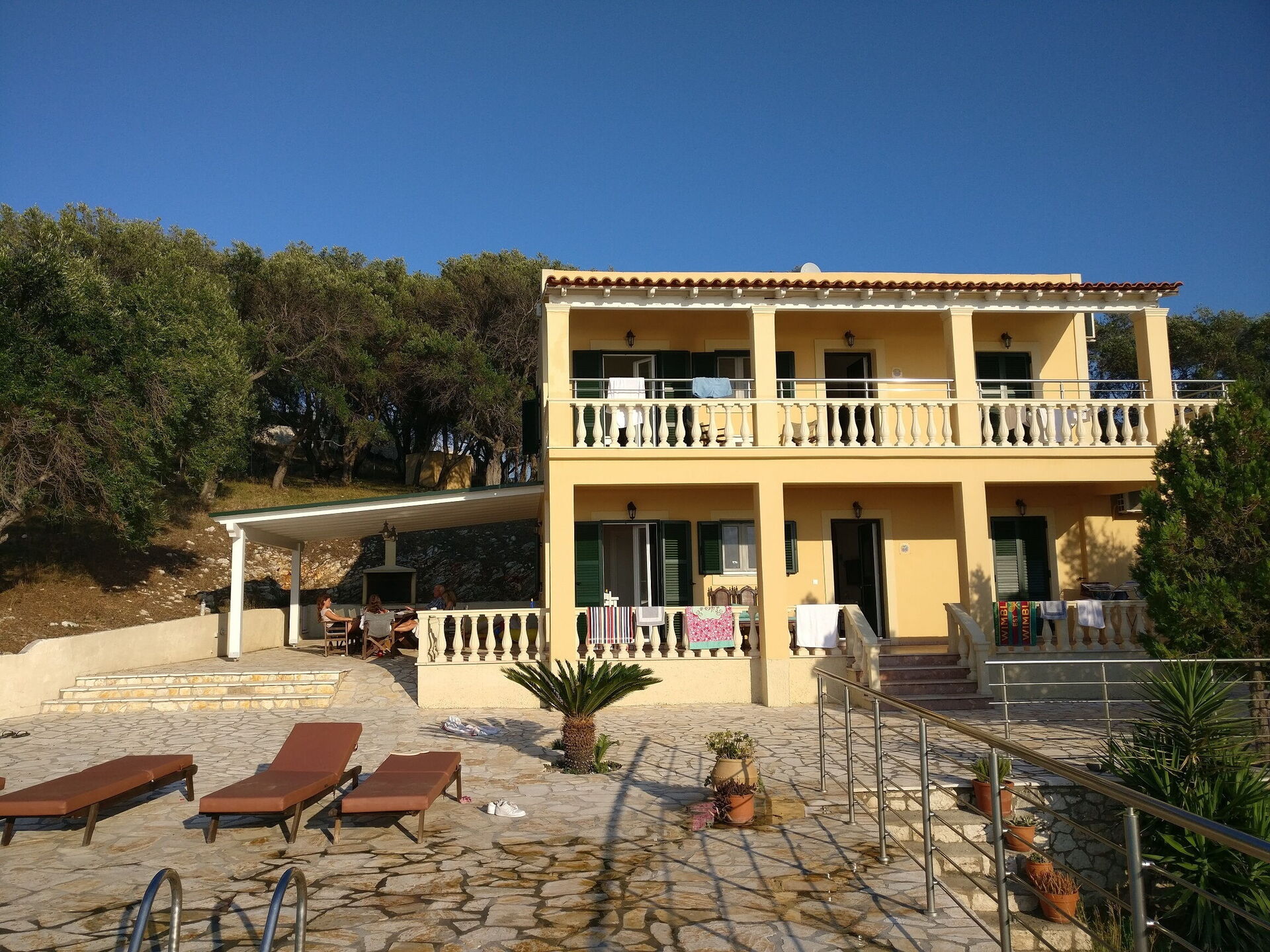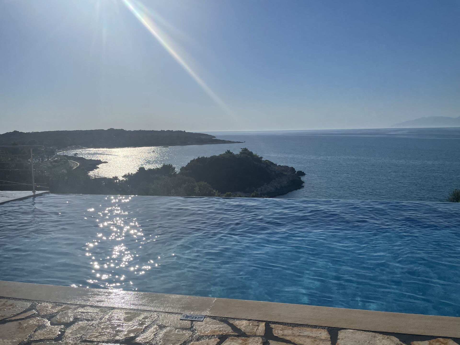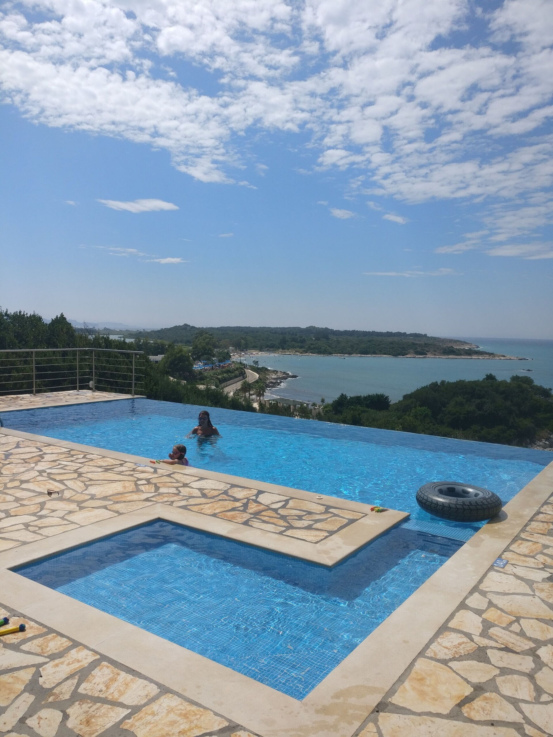 Our party of1 10 7 adults and 3 children 8 to14 spent 10 days at this beautiful Villa.With incredible Views across the sea and to Albania.The outdoor was perfect for our BBQ’s with plenty of seating undercover.The infinity pool and Jacuzi were just a magnet for everyone.We could have done with some more sun shades though 3 was just not enough for 10 people..Situated just minutes walk away from a mini market and supermarket as well as a couple of Tavernas.The lovely beach was also just a short walk away.We had a great stay.A couple of suggestions.Another bin for recycling and some bin liners would be helpful.Also an information book with emergency telephone numbers and local information ie Taxi phone numbers would b also have been helpful