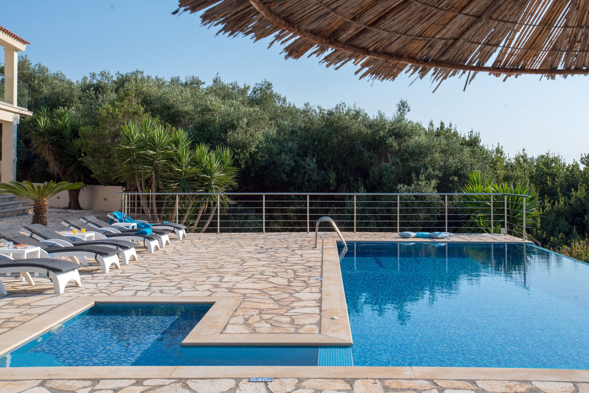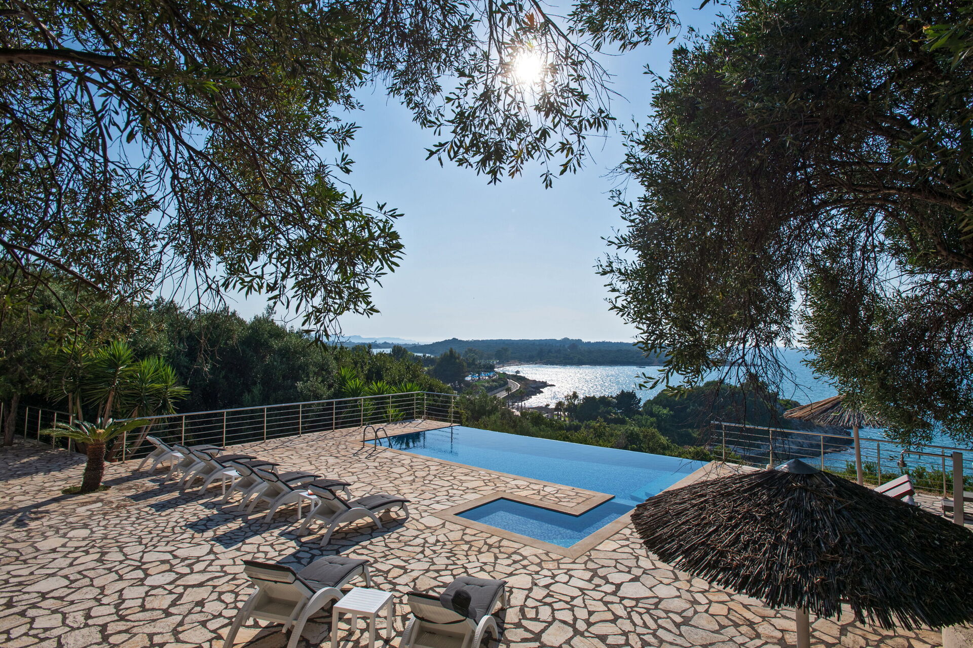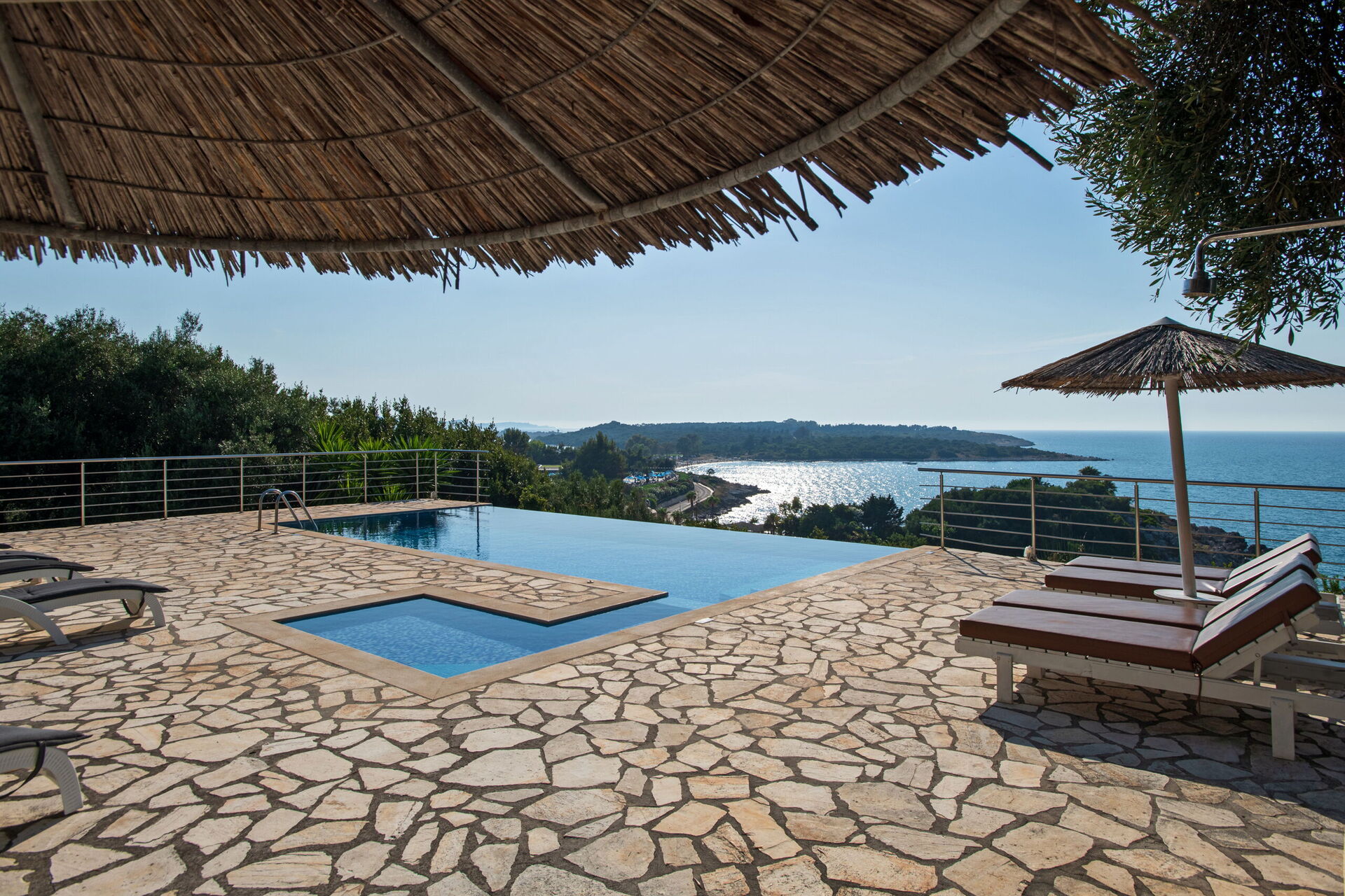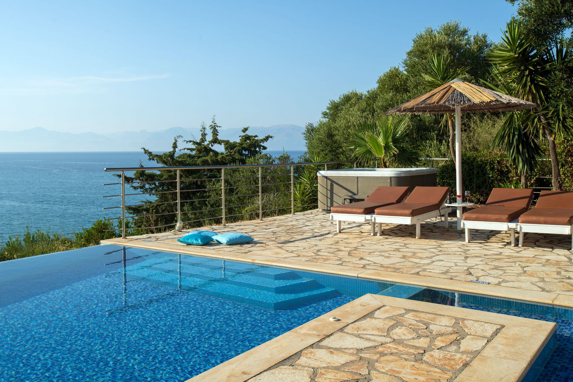 Our party of1 10 7 adults and 3 children 8 to14 spent 10 days at this beautiful Villa.With incredible Views across the sea and to Albania.The outdoor was perfect for our BBQ’s with plenty of seating undercover.The infinity pool and Jacuzi were just a magnet for everyone.We could have done with some more sun shades though 3 was just not enough for 10 people..Situated just minutes walk away from a mini market and supermarket as well as a couple of Tavernas.The lovely beach was also just a short walk away.We had a great stay.A couple of suggestions.Another bin for recycling and some bin liners would be helpful.Also an information book with emergency telephone numbers and local information ie Taxi phone numbers would b also have been helpful