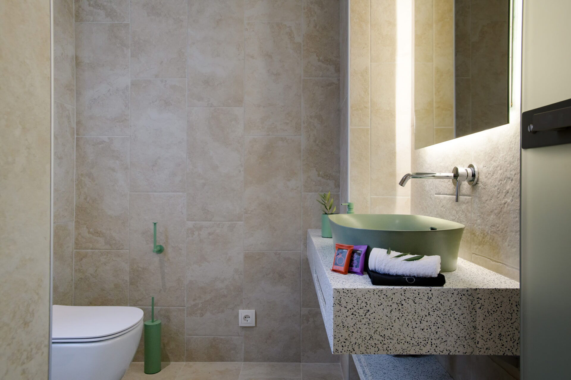 Erdgeschoss: Heller Wohnbereich bestehend aus Wohnzimmer (Smart-TV) mit Essbereich und Küche (Herd, Backofen, Gefrierschrank, Geschirrspüler, Mikrowelle, Kaffeemaschine, Toaster), Badezimmer, Doppelzimmer mit privatem Bad mit Dusche, Doppelzimmer (auf Anfrage in ein Zweibettzimmer umwandelbar) mit privatem Bad mit Dusche.