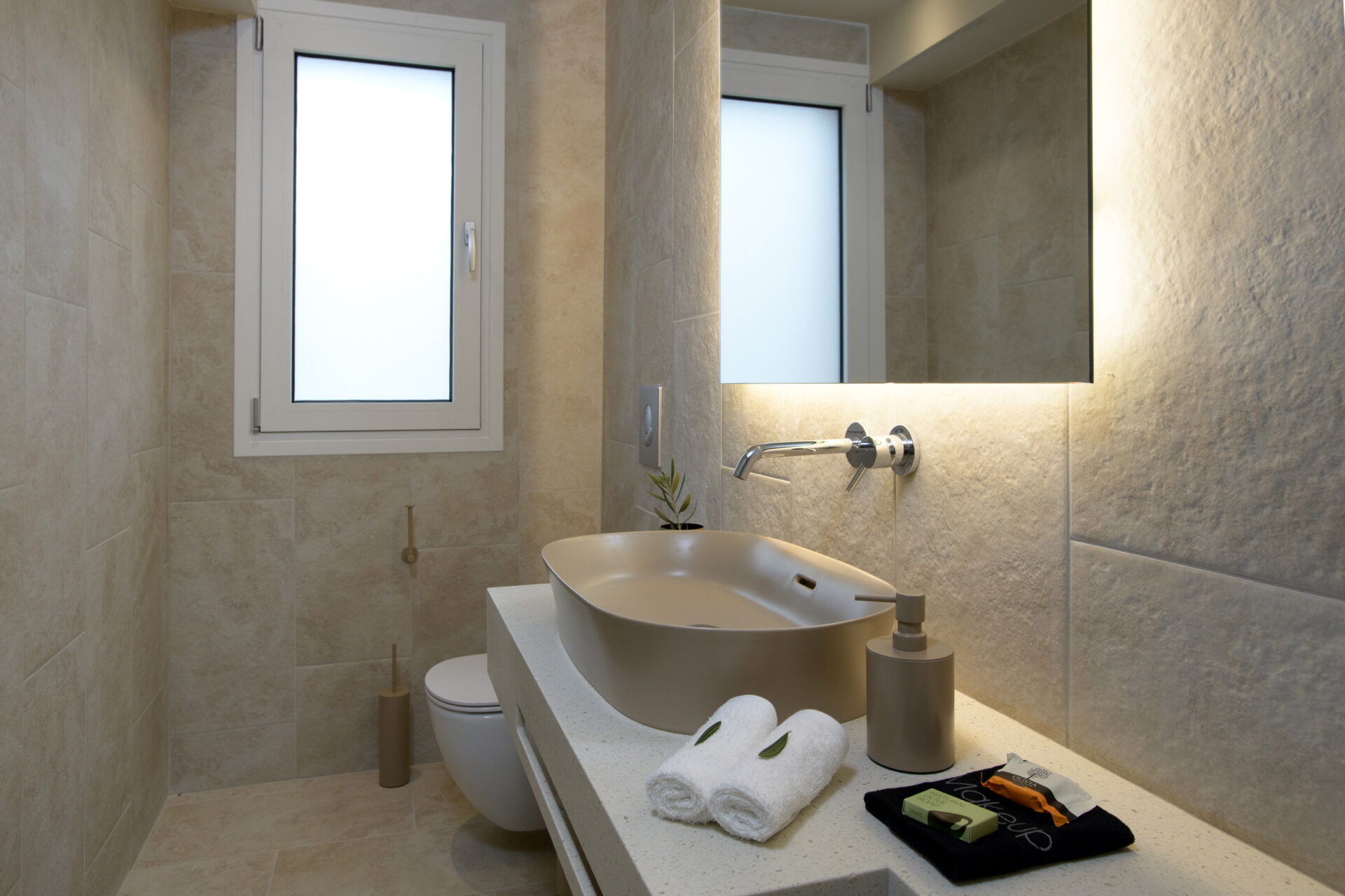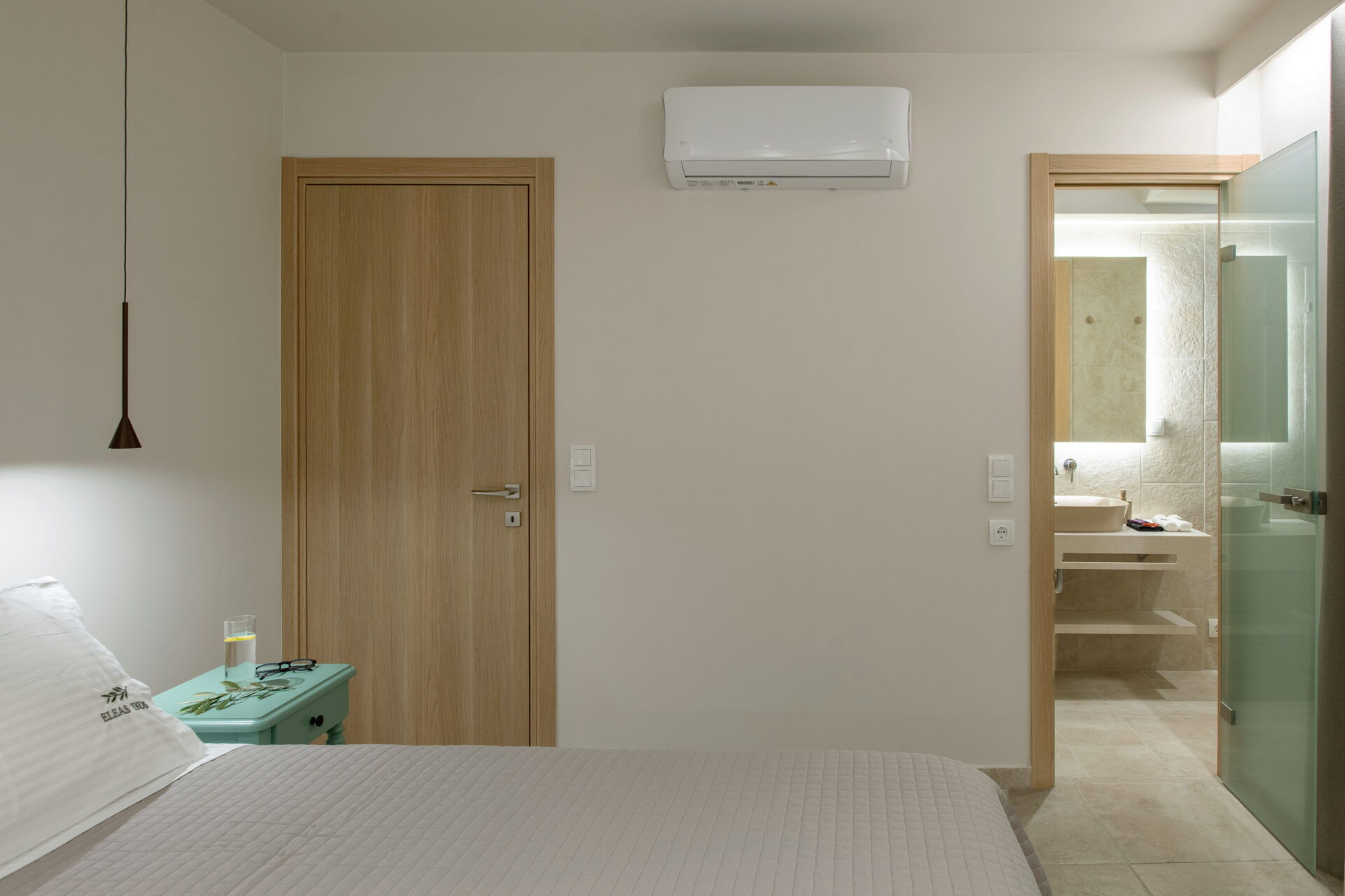 Erster Stock: Doppelzimmer mit privatem Bad mit Dusche, Doppelzimmer (auf Anfrage in ein Zweibettzimmer umwandelbar) mit privatem Bad mit Dusche. Klimaanlage in allen Schlafzimmern und im Wohnzimmer.