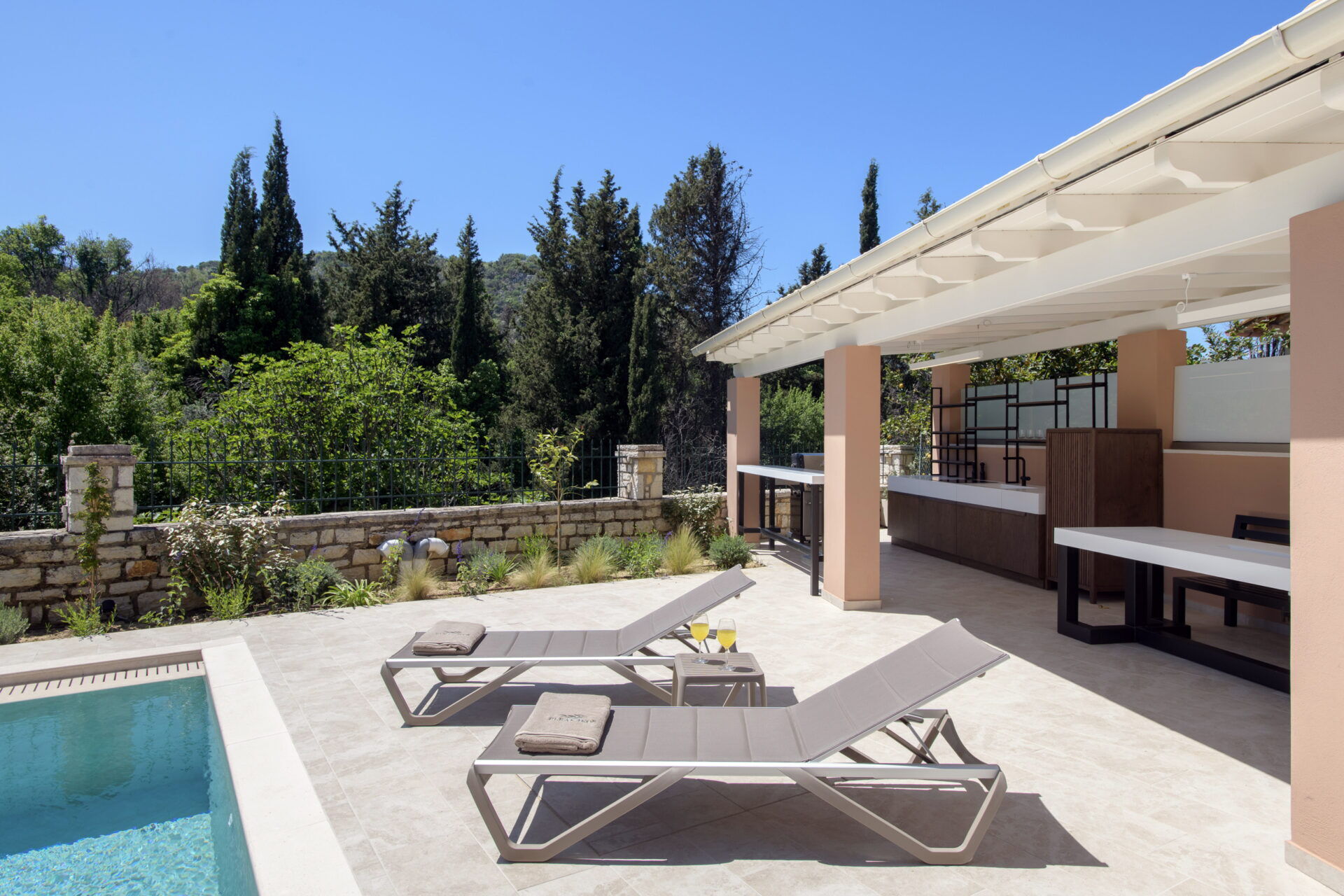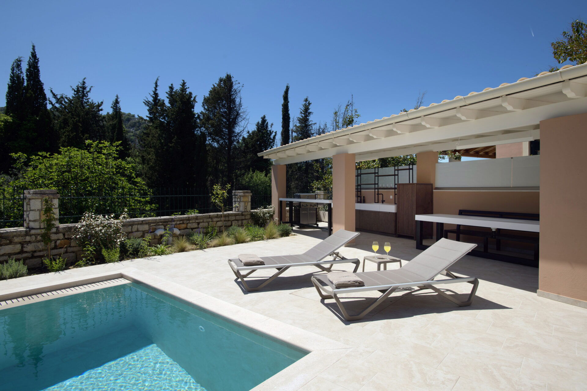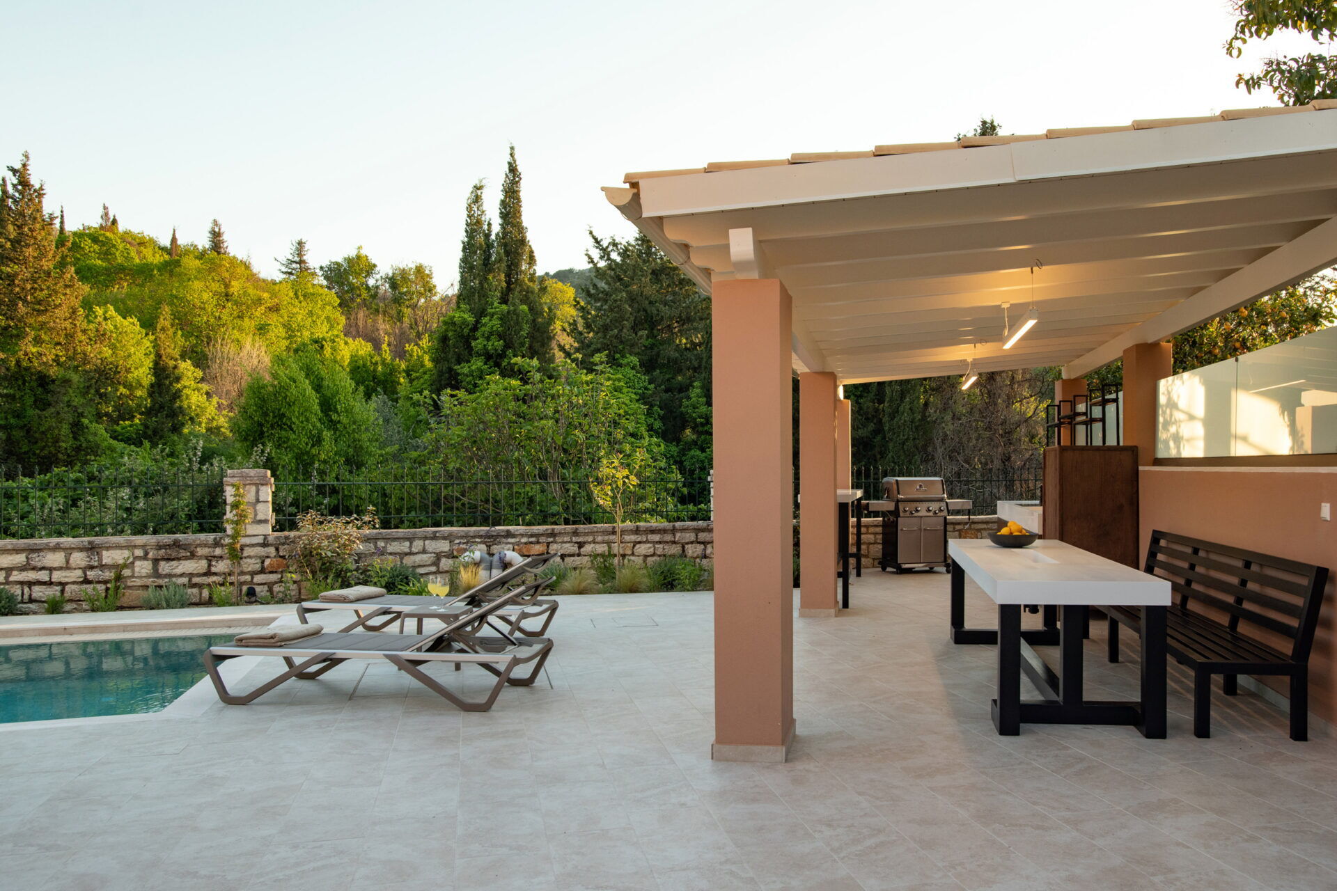 Im Außenbereich bietet die Villa Eleas Ikos ihren Gästen einen möblierten Bereich mit Außenküche und Grill zum Essen und Entspannen im Freien. Ein wunderschönes Schwimmbad mit Panoramablick auf die Berge und die umliegende Landschaft rundet das Anwesen ab. Diese wunderschöne Villa ist perfekt für ein Familientreffen oder für eine kleine Gruppe von Freunden, die gemeinsam Urlaub auf Korfu machen möchten: Die Villa liegt im ruhigen Dorf Loutses am Fuße des Berges Pantokrator (einem beliebten Wanderziel) und ist nur wenige Kilometer von Korfus ältesten Dörfern, wie beispielsweise „Alt-Perithia“, entfernt.