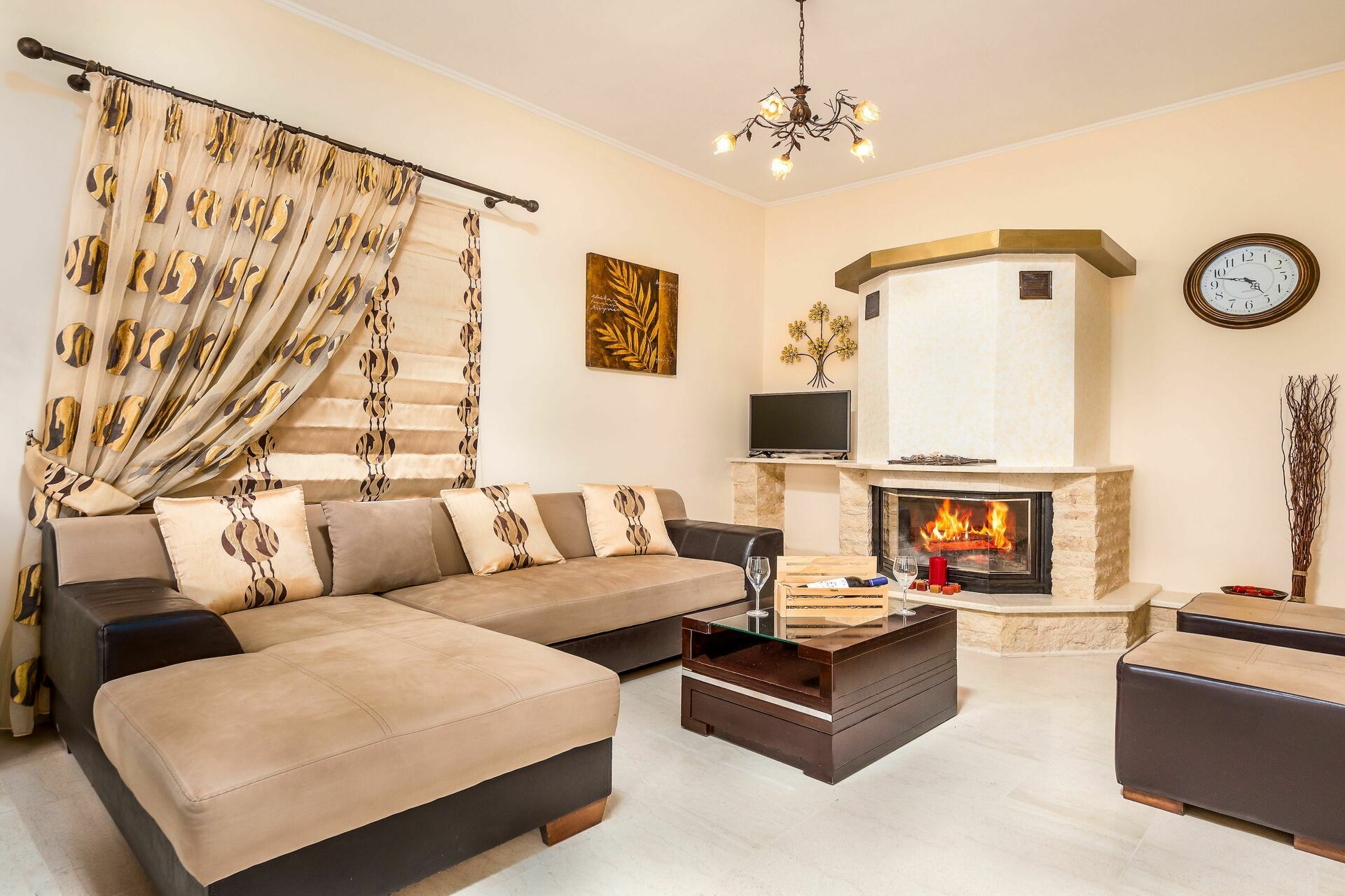 Das Wohnzimmer ist groß genug um auch abends Zeit zusammen im Haus zu verbringen. Die Terasse ist toll und es gibt viele Sitz- und Liegemöglichkeiten. In fünf bis zehn Minuten ist man mit dem Auto am Strand. Im Ort, der in unter zehn Minuten fussläufig zu erreichen ist, gibt es eine schöne Taverne (Harrys).