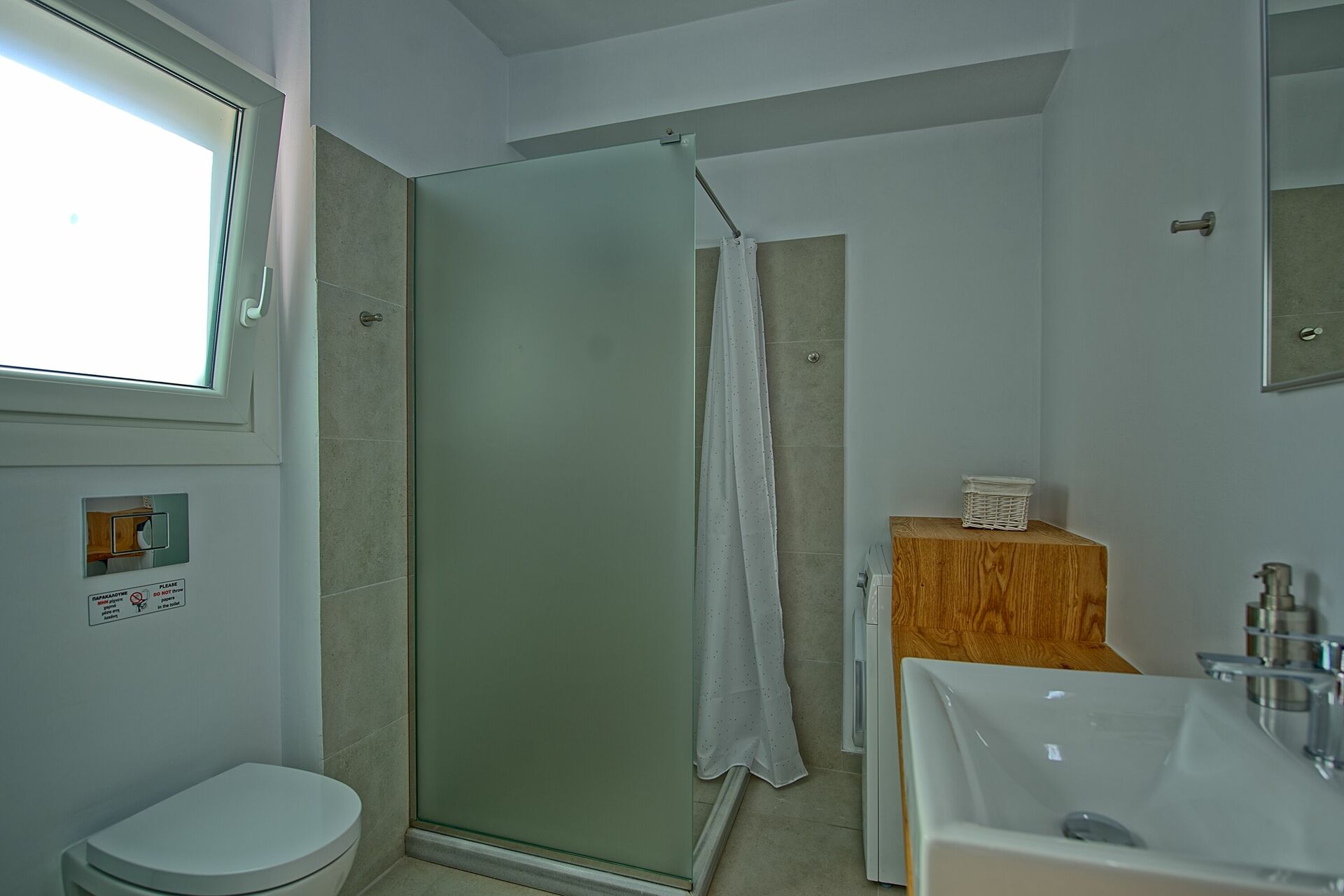 Im Erdgeschoss befindet sich ein geräumiges Wohnzimmer (Sofas, Wi-Fi, Klimaanlage) mit angrenzender Küche (voll ausgestattet) sowie 2 Schlafzimmer (beide mit Bad), ein Schlafzimmer hat ein Doppelbett + ein Sofa (welches in ein Einzelschlafsofa verwandelt werden kann), während das andere Schlafzimmer ein Zweibettzimmer ist. Das Obergeschoss ist identisch mit dem Untergeschoss, mit Ausnahme des Hauptschlafzimmers welches nur ein Doppelbett und kein zusätzliches Sofabett hat. Die großen Terrassen auf beiden Etagen bieten einen magischen Blick auf das Meer und die albanische Küste.