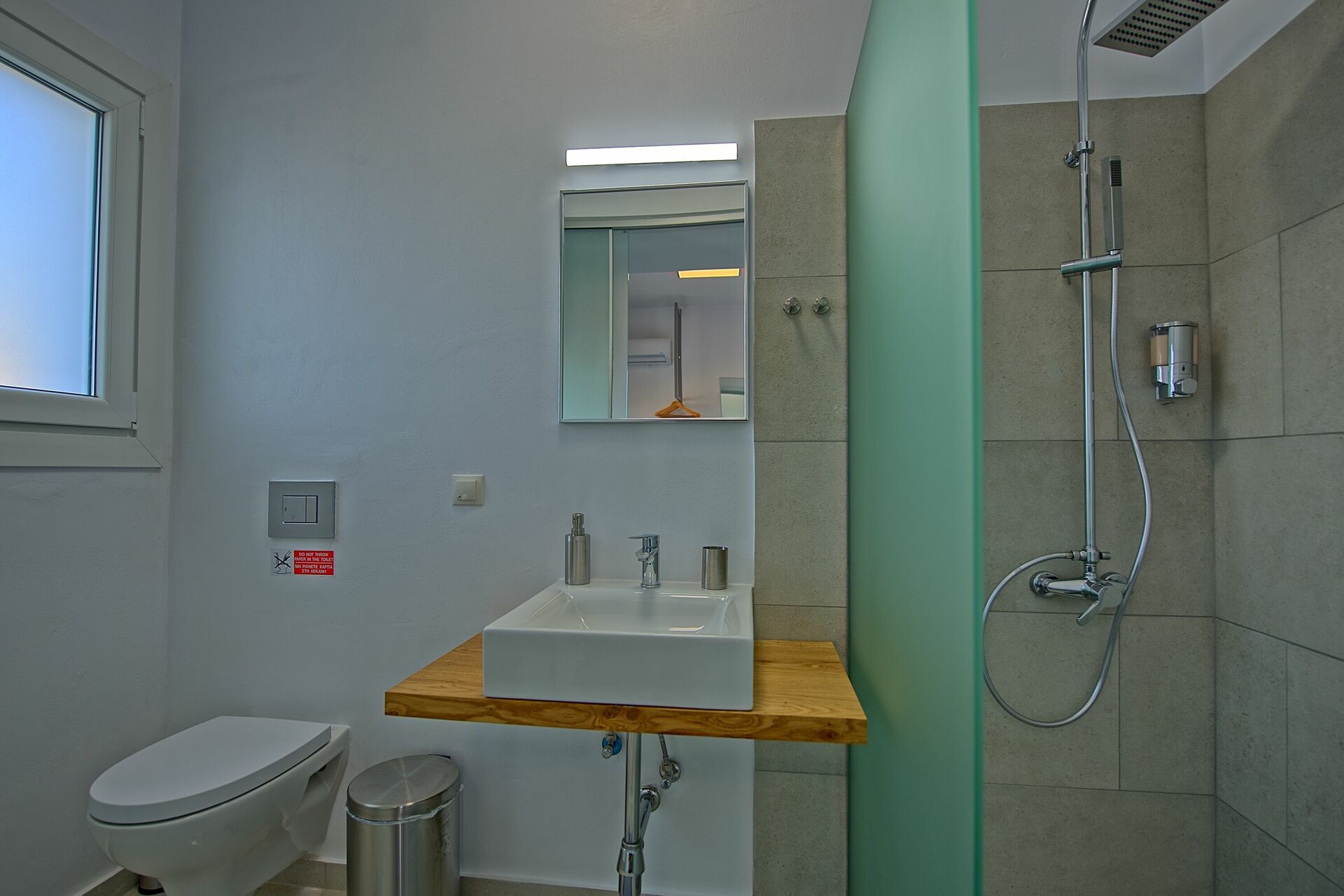 Erster Stock: (über eine seitliche Außentreppe erreichbar) Hauptschlafzimmer (Doppelbett, Klimaanlage) mit Bad mit Dusche, Zweibettzimmer (Klimaanlage) mit en-suite Duschbad, Wohnzimmer mit Kochnische, große Terrassen.
