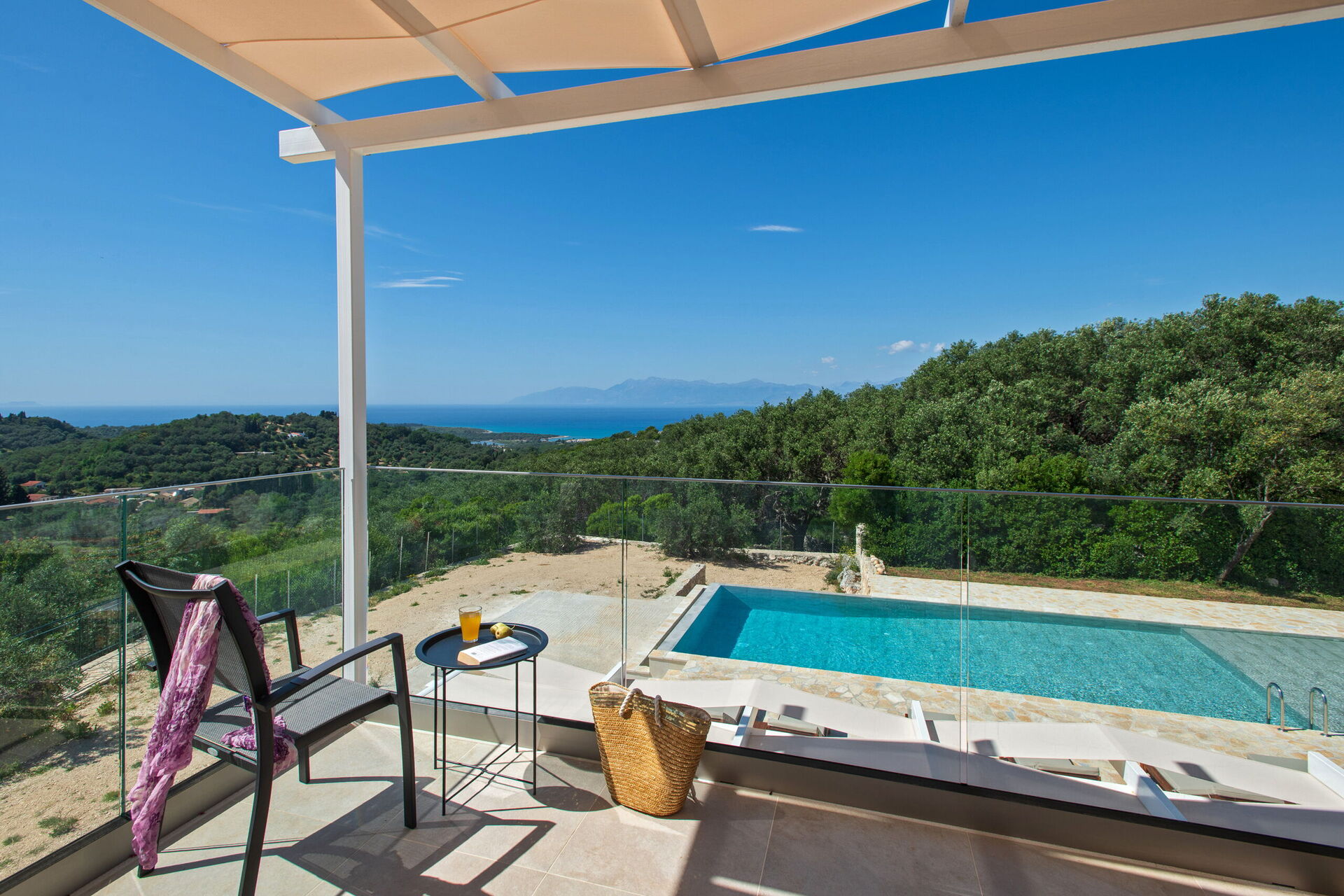 Villa Sunset ist eine brandneue Villa mit privatem Panorama Schwimmbad am Meer von Korfu zwischen den Dörfern Kassiopi und Acharavi.