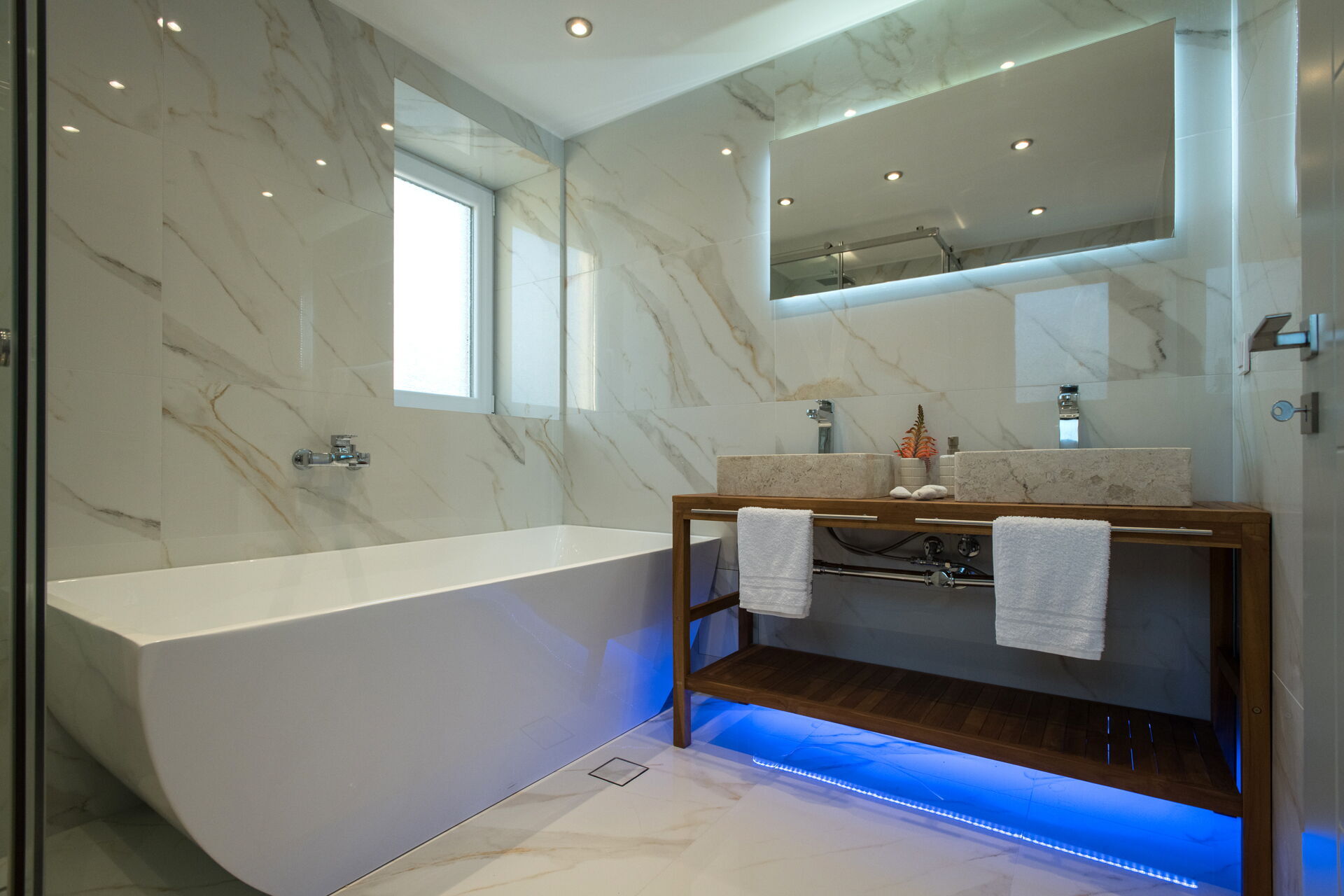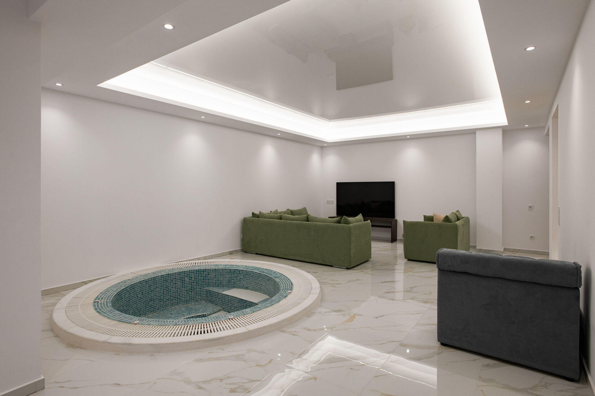 Untere Etage (von innen und außen zugänglich): Spa-Bereich mit innenliegender, runder Whirlpoolwanne (2 Meter Durchmesser; 6 Sitzplätze; auf 36° C beheizbar); Badezimmer mit Dusche; Doppelschlafcouch.
