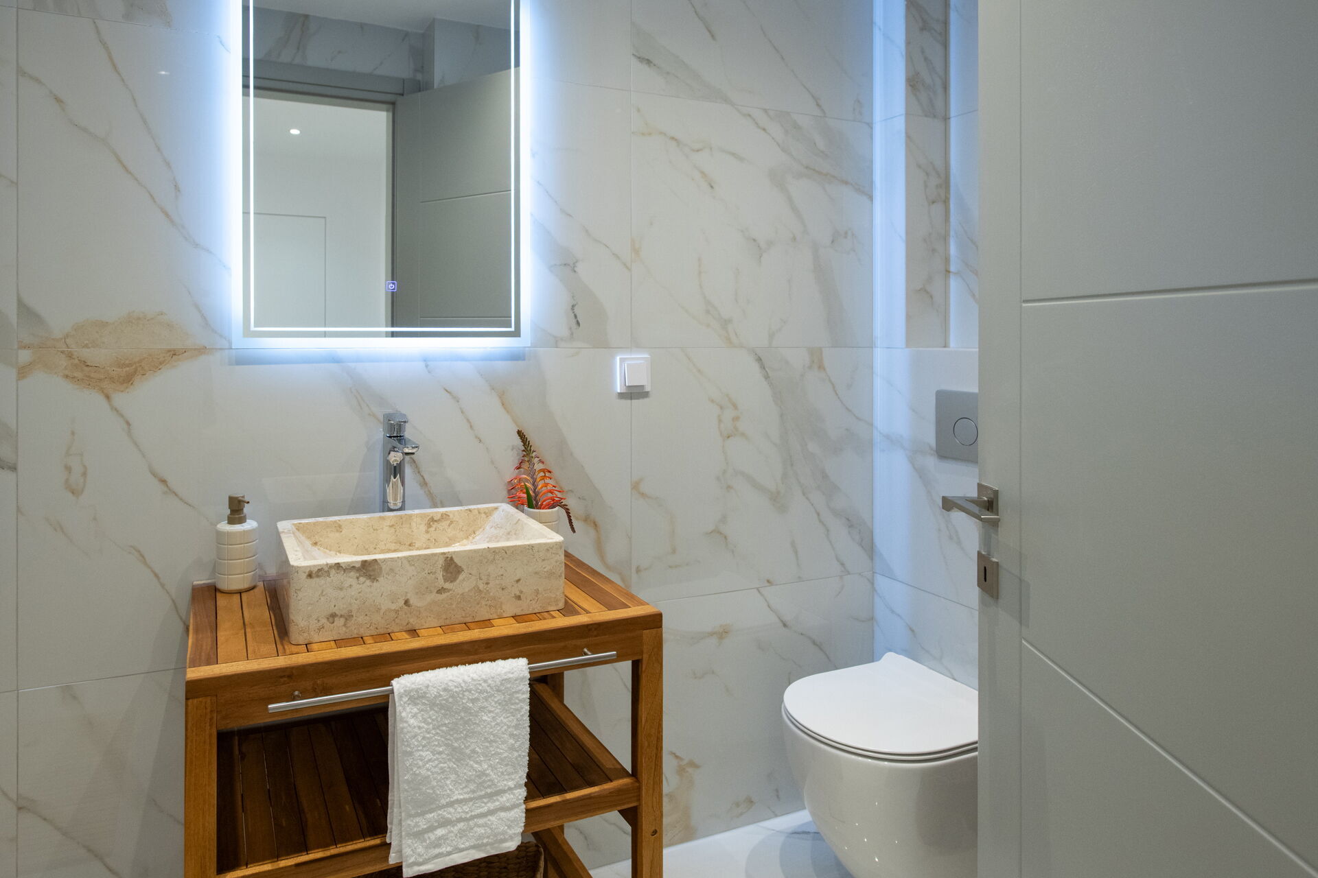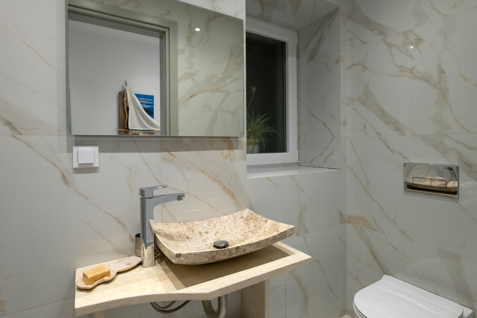Erdgeschoss: großer und heller Wohnbereich bestehend aus Wohnzimmer (Smart-TV) mit Essbereich und Küche (Backofen, Gefrierschrank, Kühlschrank, Geschirrspüler, Mikrowelle, Espressomaschine, Kaffeemaschine American, Toaster), Toilette, Doppelzimmer mit privatem Badezimmer mit Dusche.