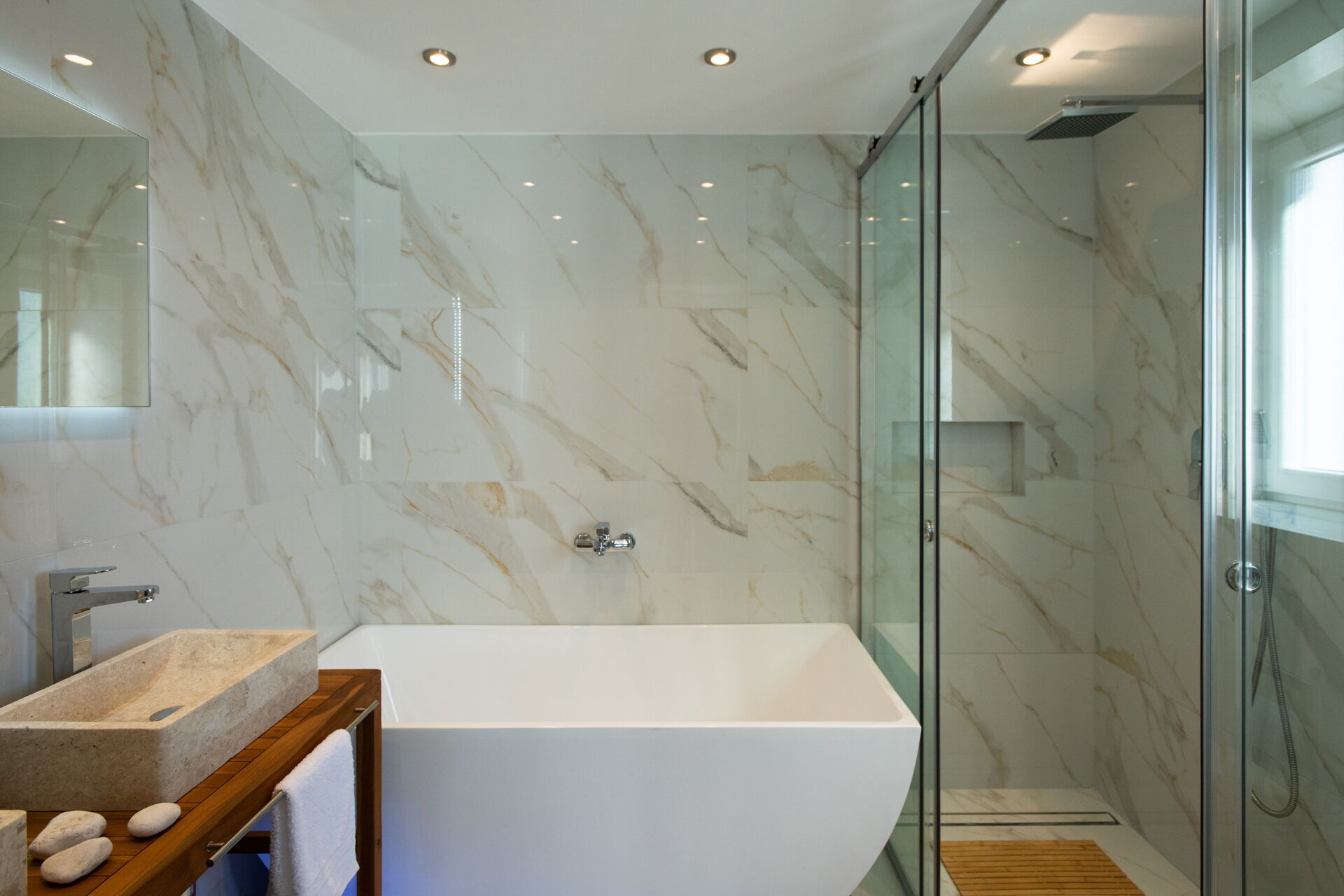 Die Villa erstreckt sich über drei Etagen, verfügt über 3 Schlafzimmer und große Gemeinschaftsräume, zu denen auch ein Wellnessbereich mit interner Hydromassagewanne gehört (im unteren Stockwerk der Villa). Diese Villa bietet bequem Platz für bis zu 6/8 Personen in einer sehr exklusiven Umgebung mit Panoramablick.