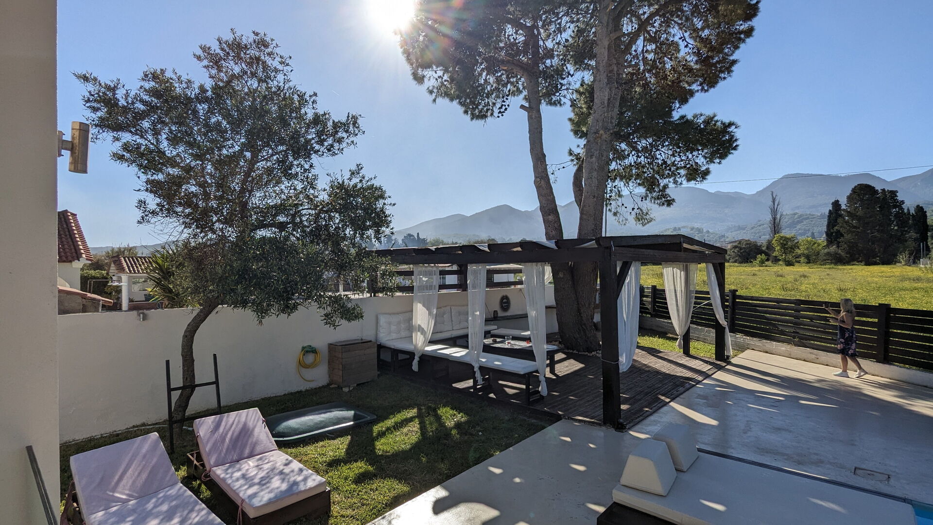 Beautiful view over the nearby mountain range. Easy walking distance to the beach, even for families with children. Stunning garden to relax in. The wooden terrace needs rebuilding (Owner said this would happen in the next couple of months). We loved being here with our children and would come back. Not if there will be a pool in the future though. The beach and other pool options are in such close vicinity that we would not want to have extra water usage nor the danger of a pool for kids in the garden.