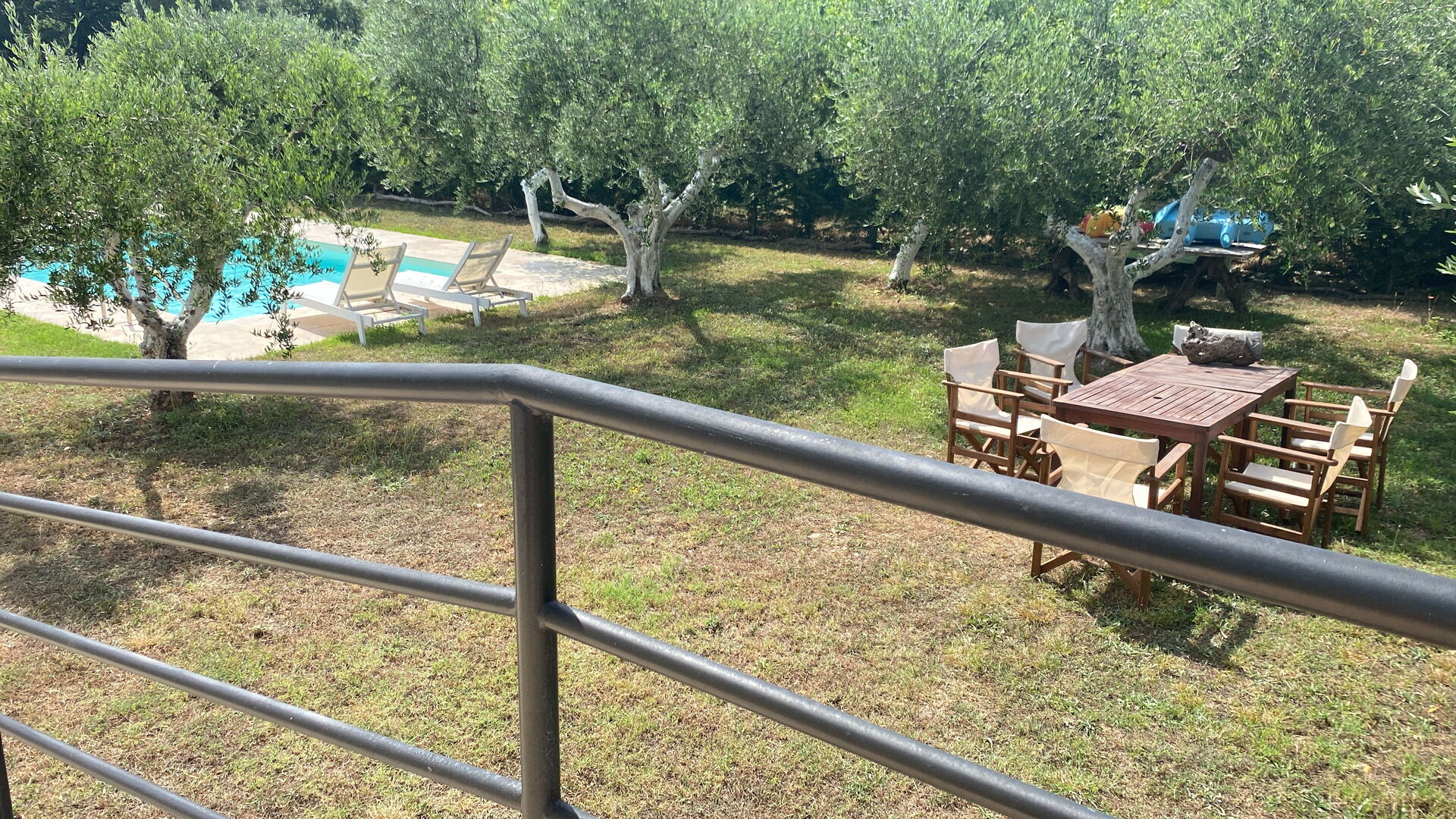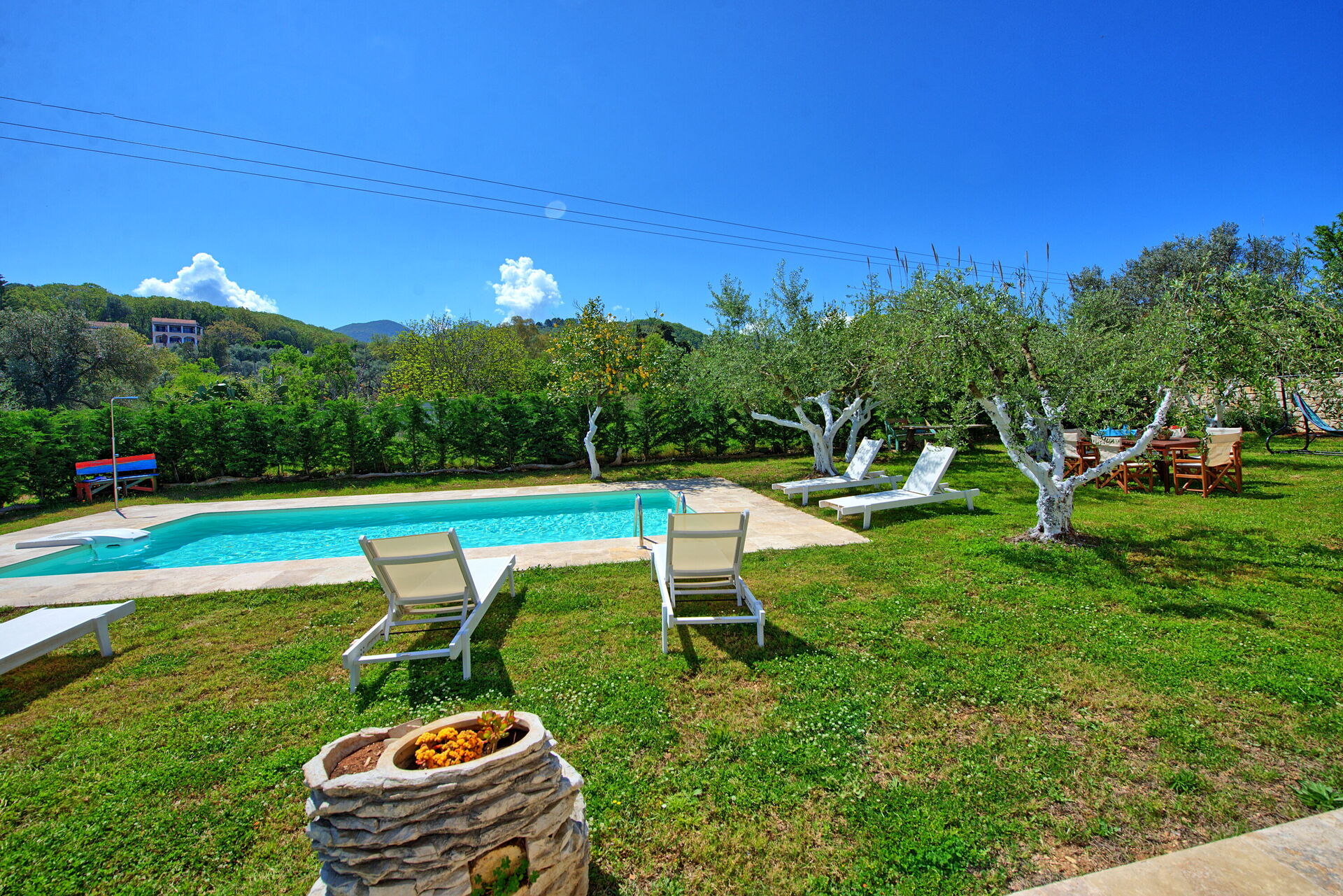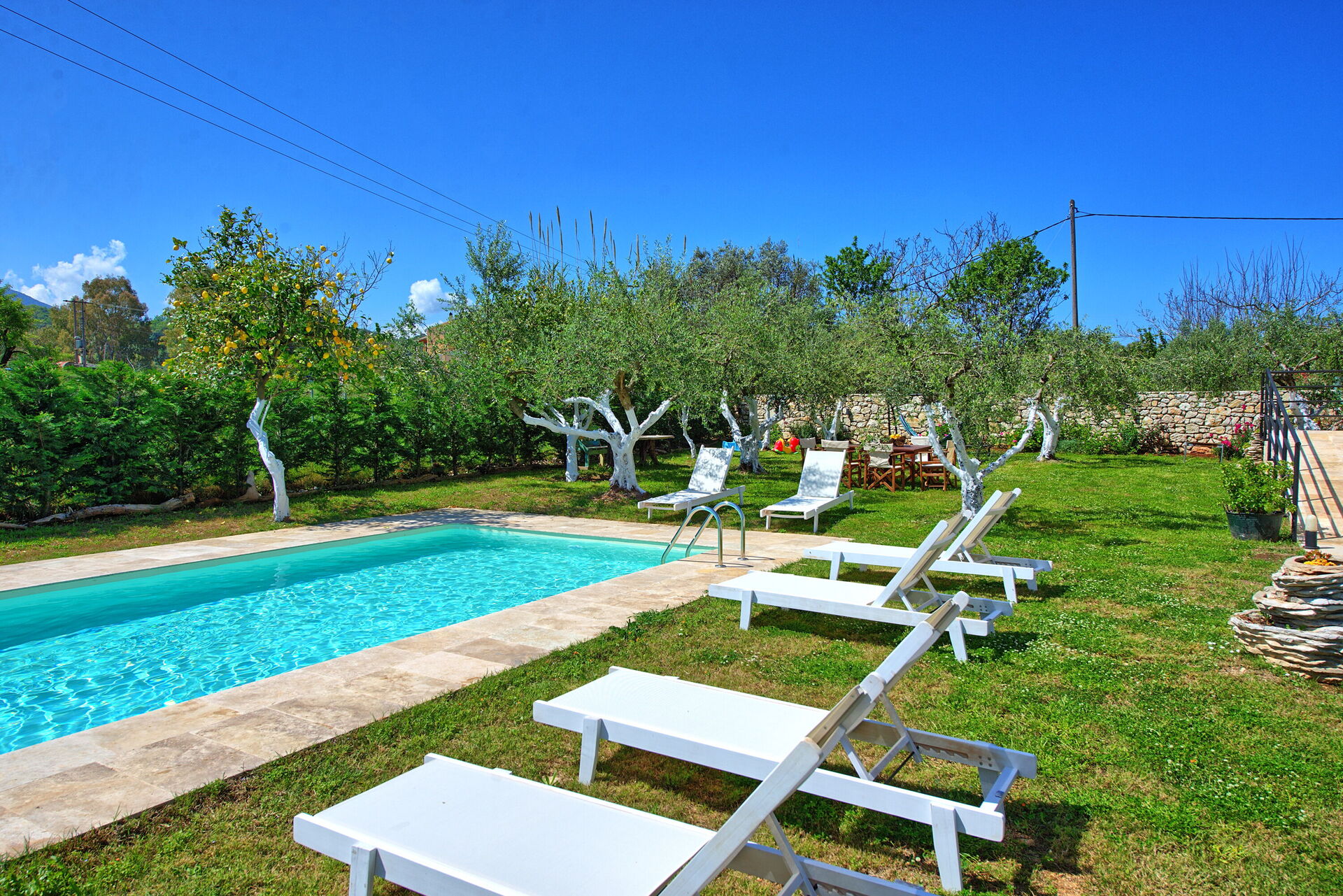 A significant highlight is the inviting outdoor dining area nestled beneath ancient olive trees. This picturesque setting offers delightful natural shade while offering a serene view of the pool. Equipped with a table and chairs, it's the ideal place to savor meals and moments together.