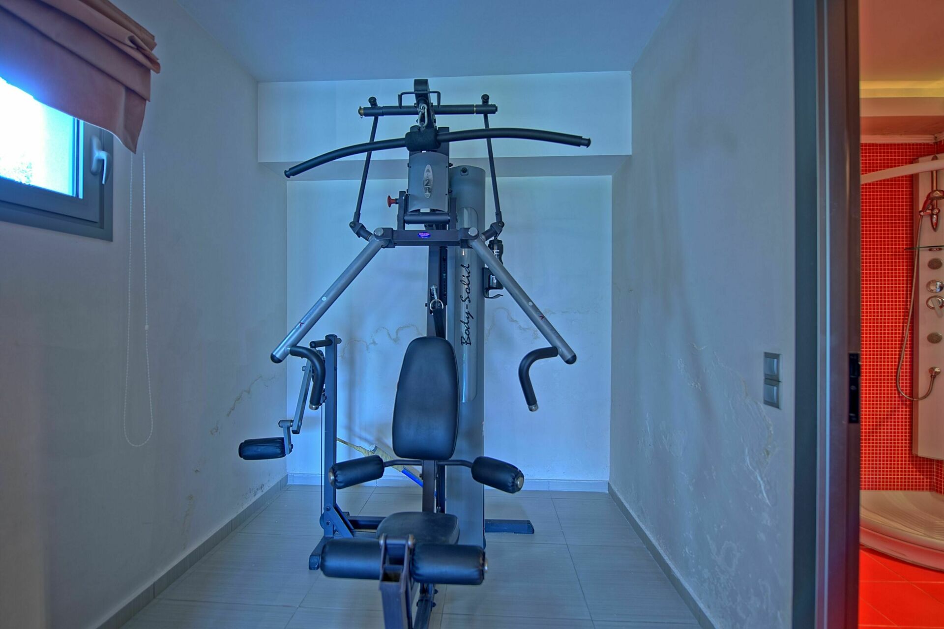 Erdgeschoss: Wohnbereich (Sat-TV) und Fitnessecke (Laufband, Kraftgerät), Schlafzimmer mit Doppelbett, Bad mit Dusche (ohne Fenster), Zimmer mit Waschmaschine.