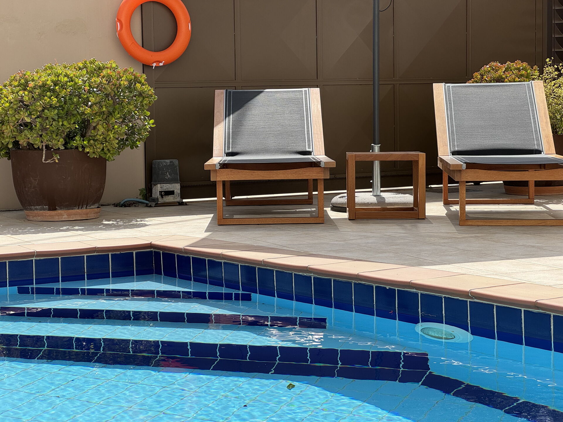 The pool looks great, sunbeds are there, and there is also a barbecue with a terrace that looks cool.