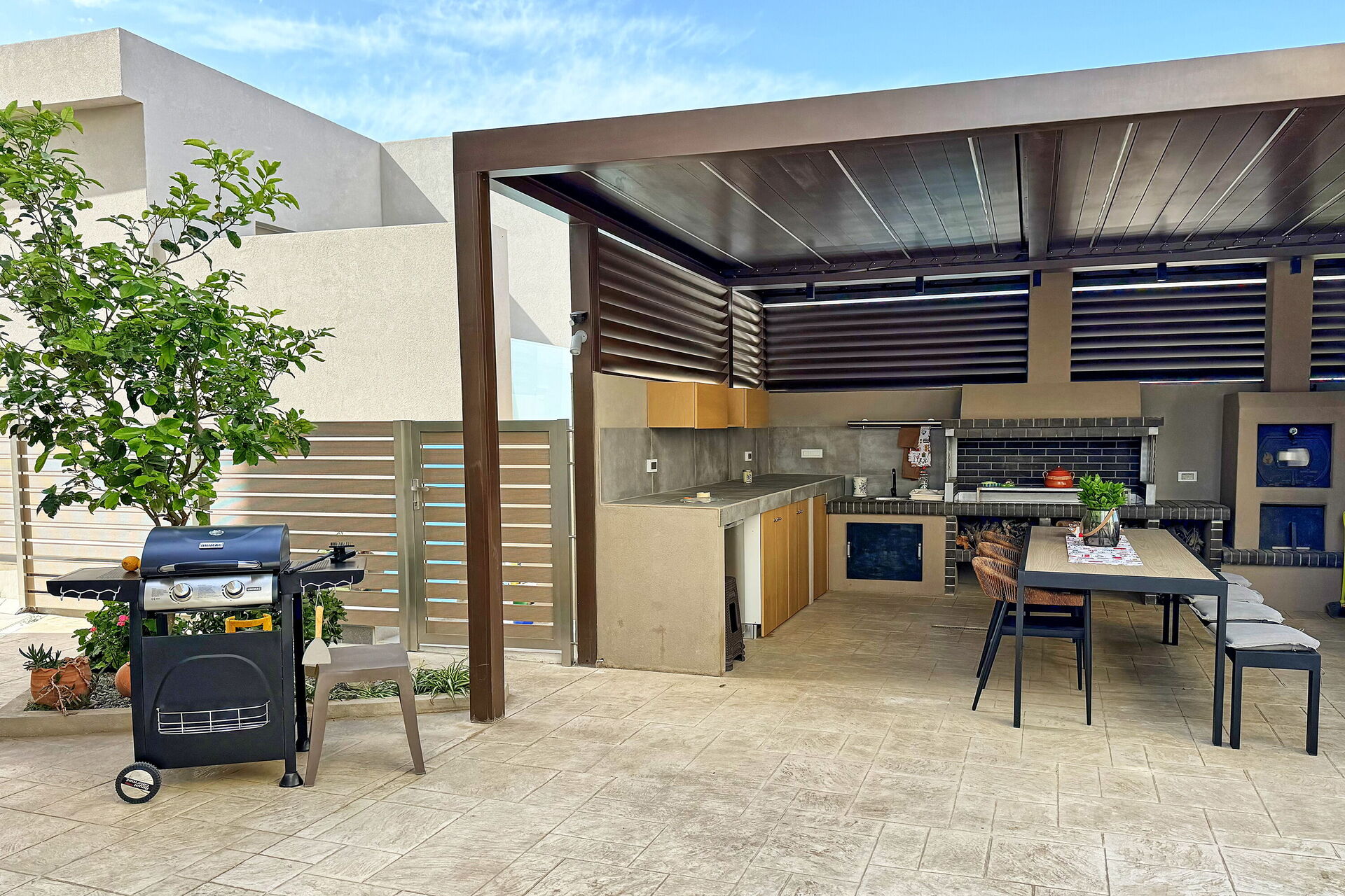 Im Erdgeschoss der Villa gibt es einen überdachten Außenbereich mit Grill und Holzofen zum Kochen und Essen im Freien; Ein unregelmäßig geformtes Schwimmbad steht den Gästen exklusiv zur Verfügung und bietet eine Abkühlung in den sonnigen mediterranen Sommern.