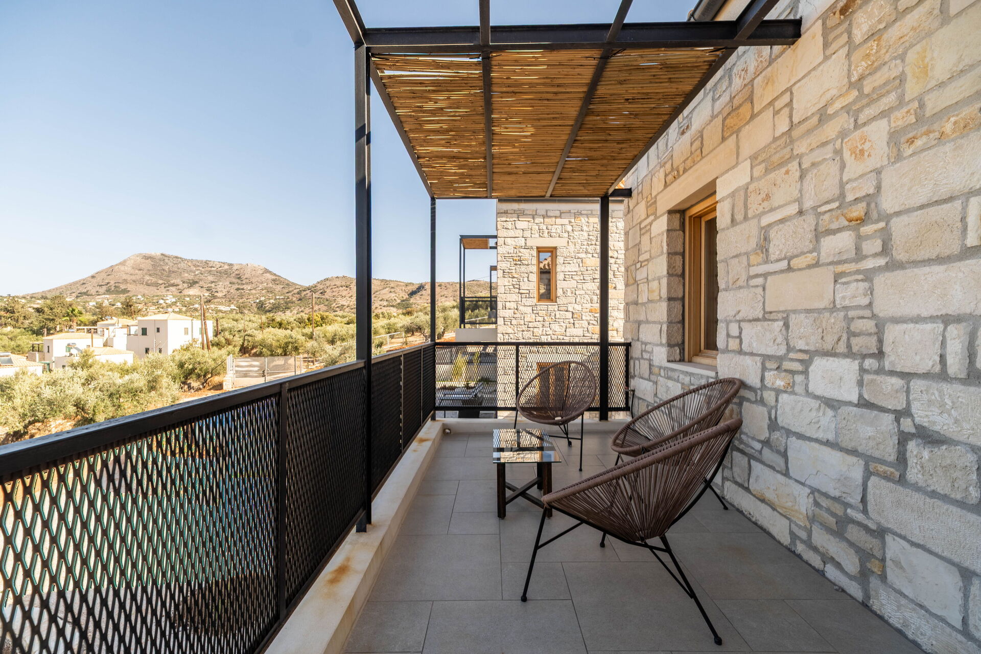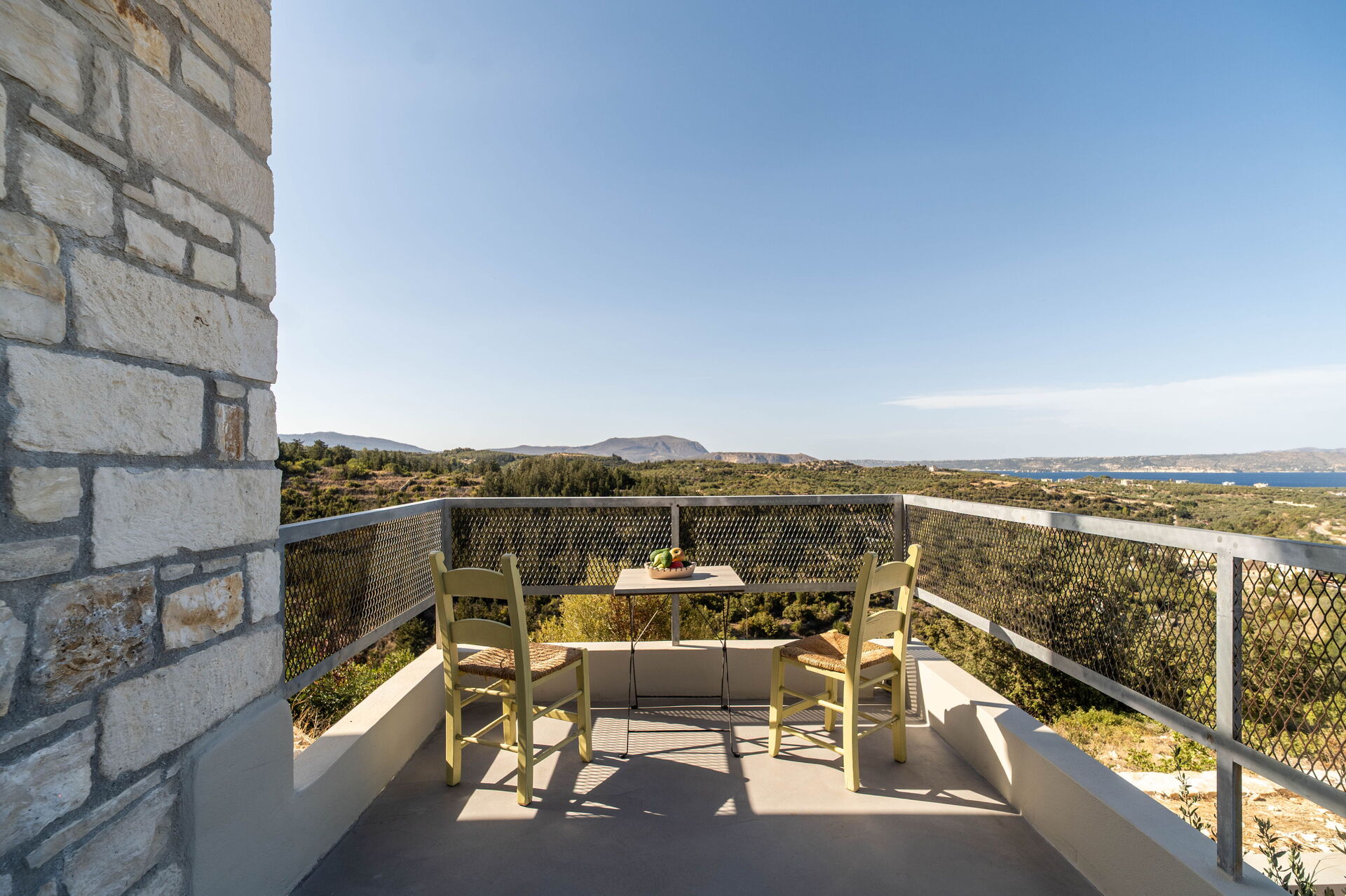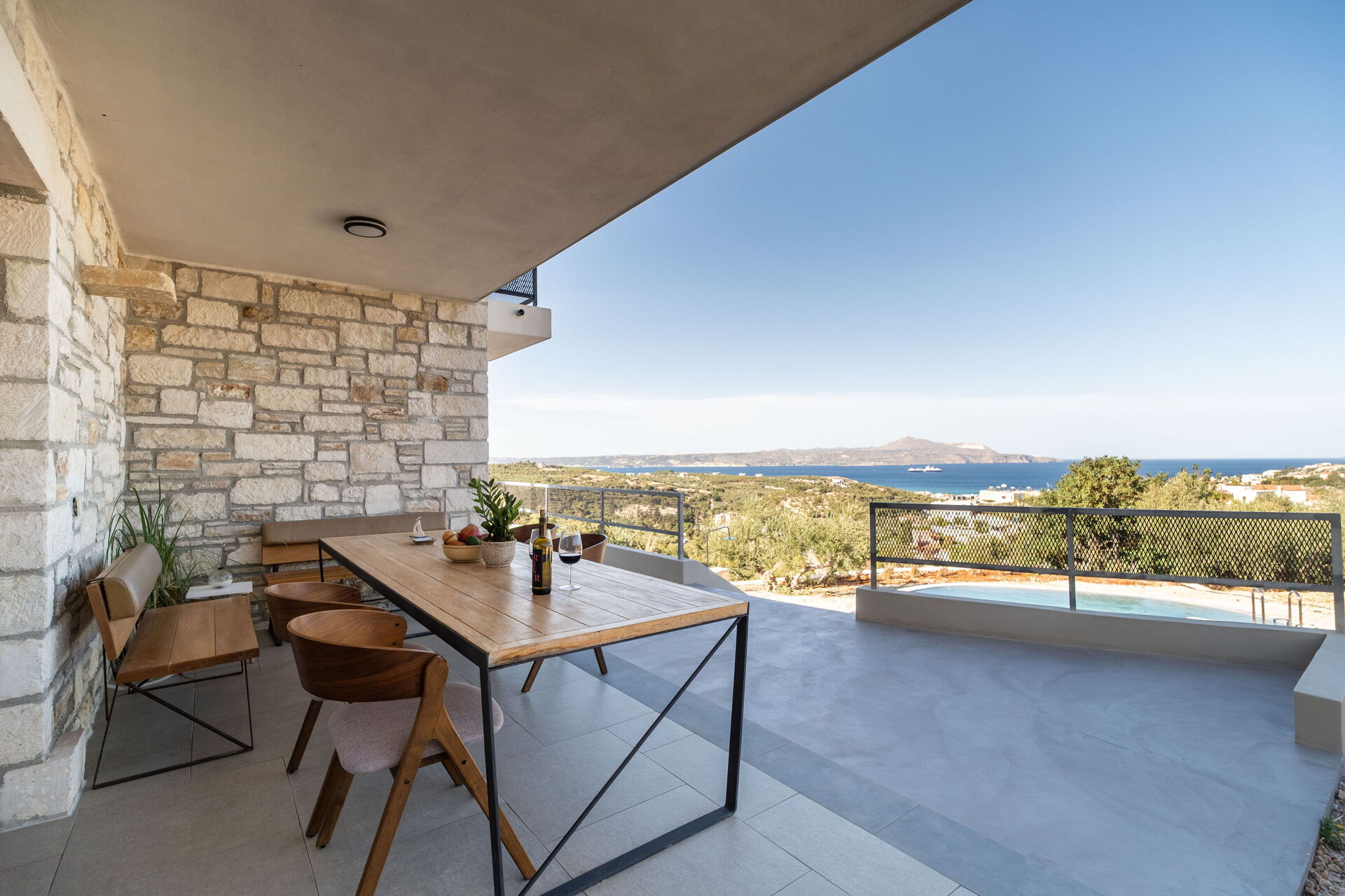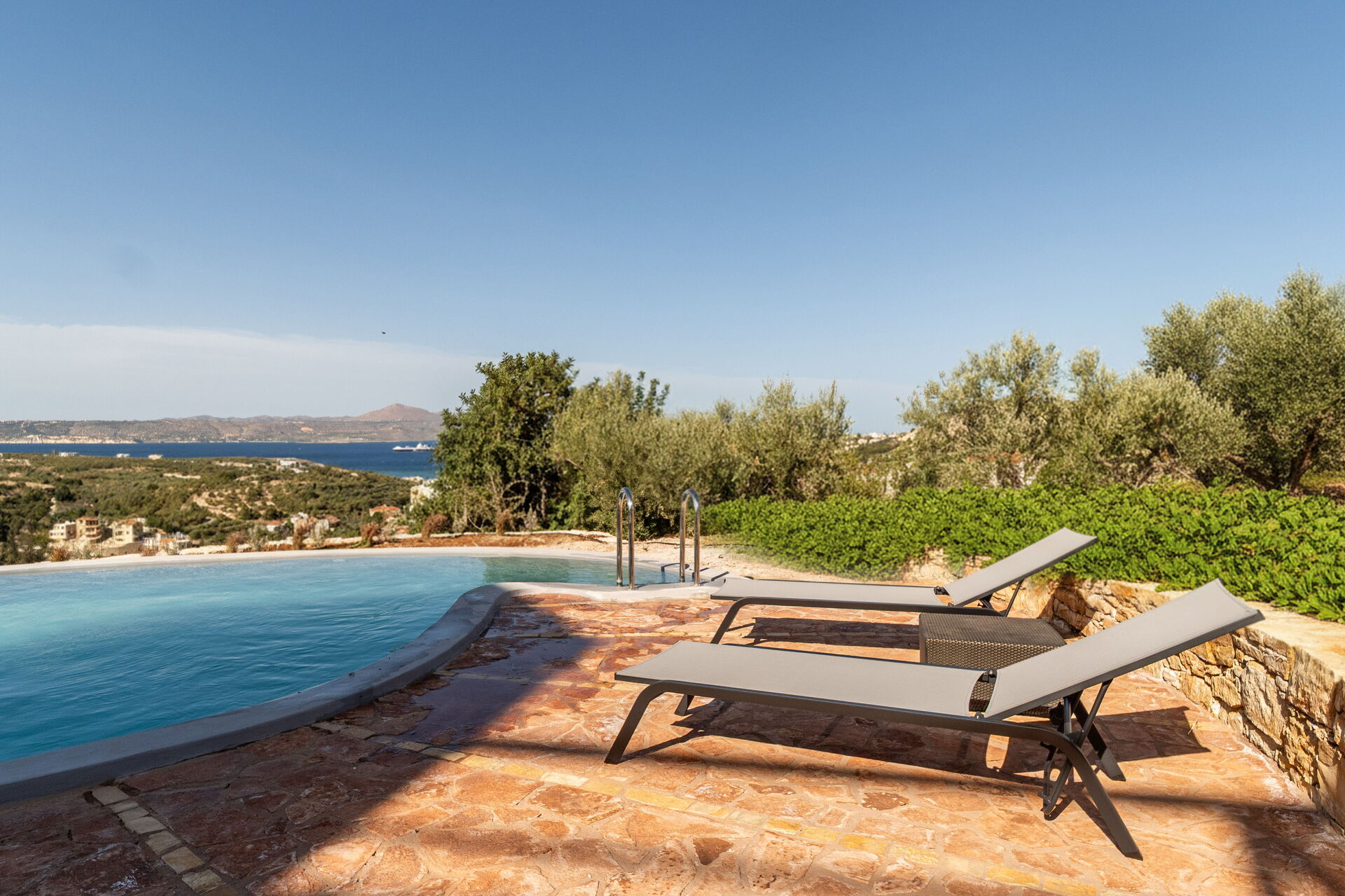Im Außenbereich erwartet die Gäste ein möblierter Bereich mit Grill und Tisch für Mahlzeiten im Freien, ein privates Schwimmbad zum Abkühlen an heißen Sommertagen und zum Genießen der Ruhe und Stille der Landschaft. Ein herrlicher Panoramablick auf das kristallklare kretische Meer rundet das Angebot ab.