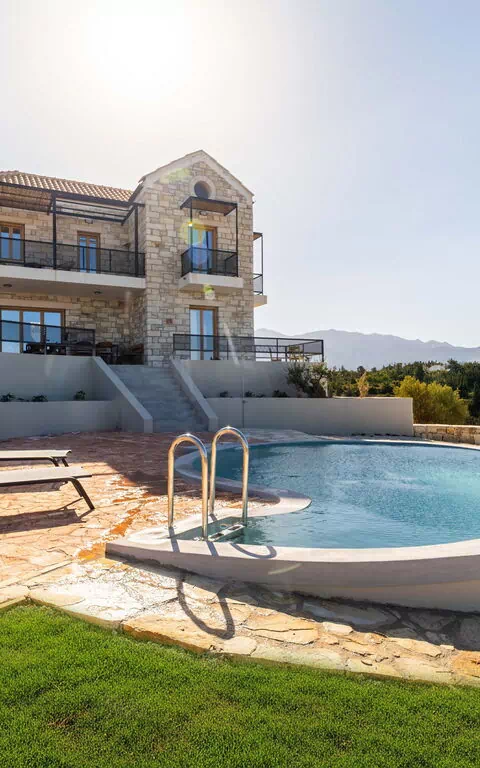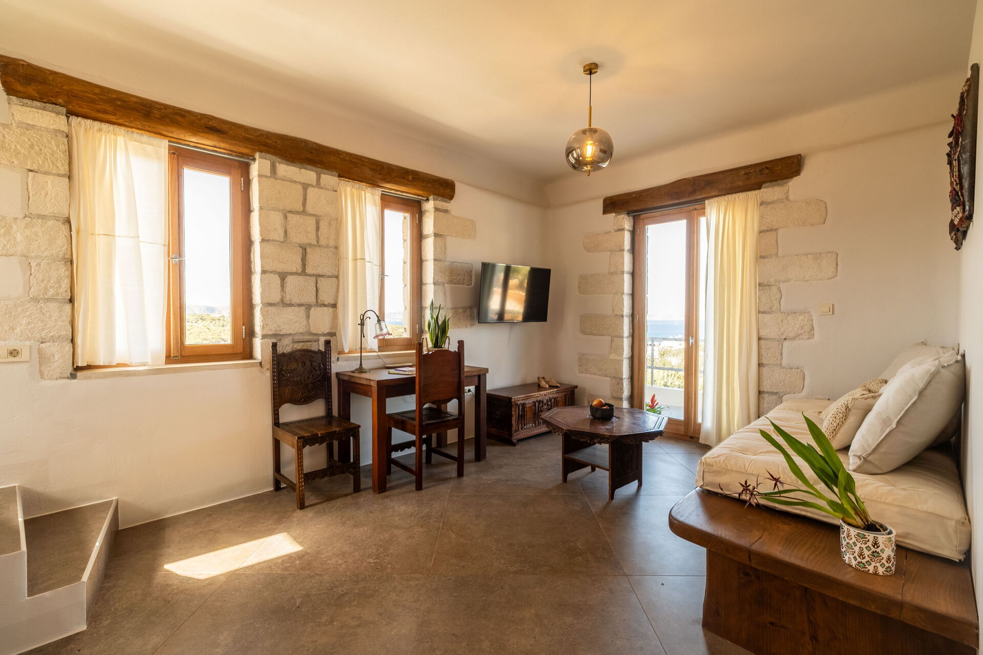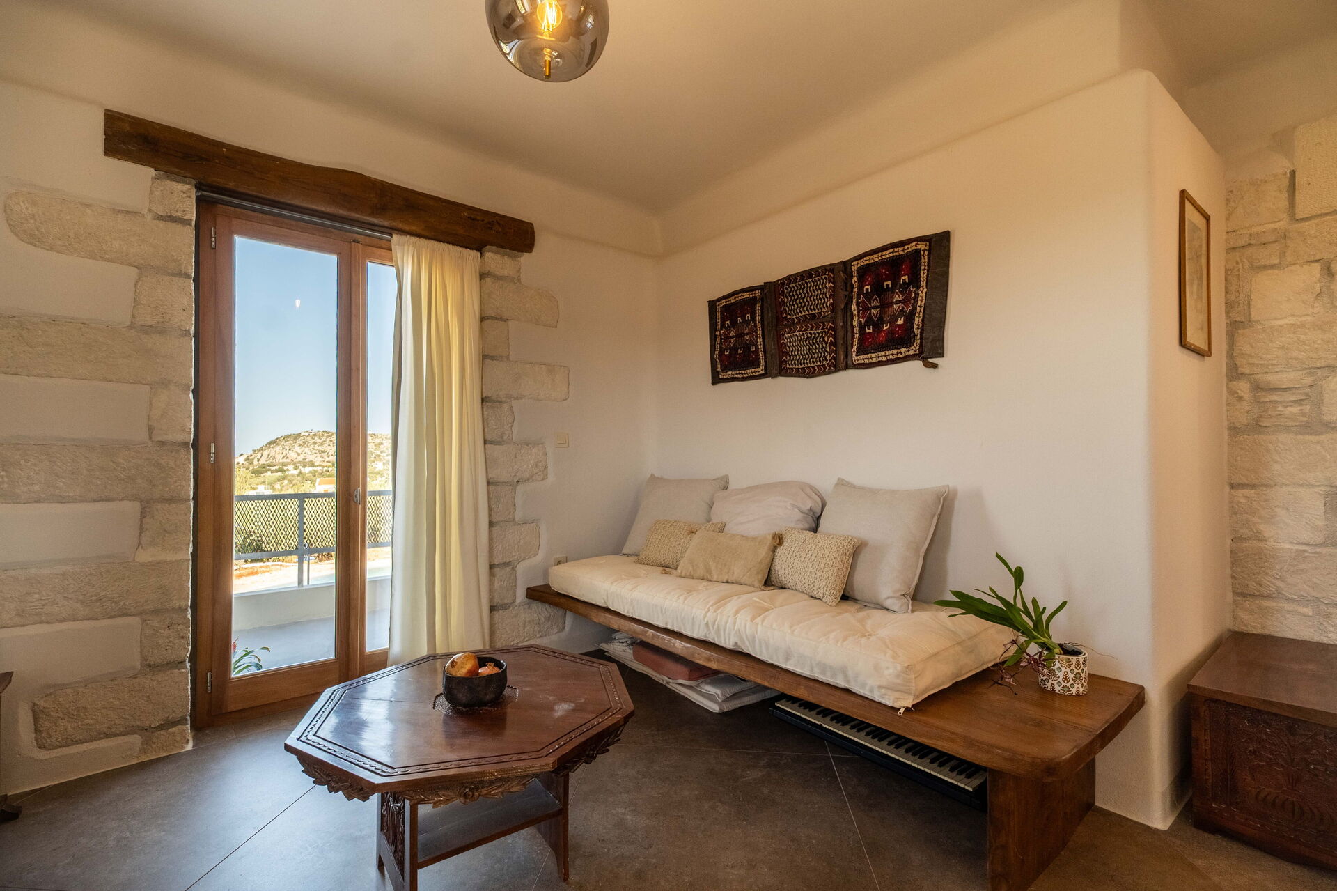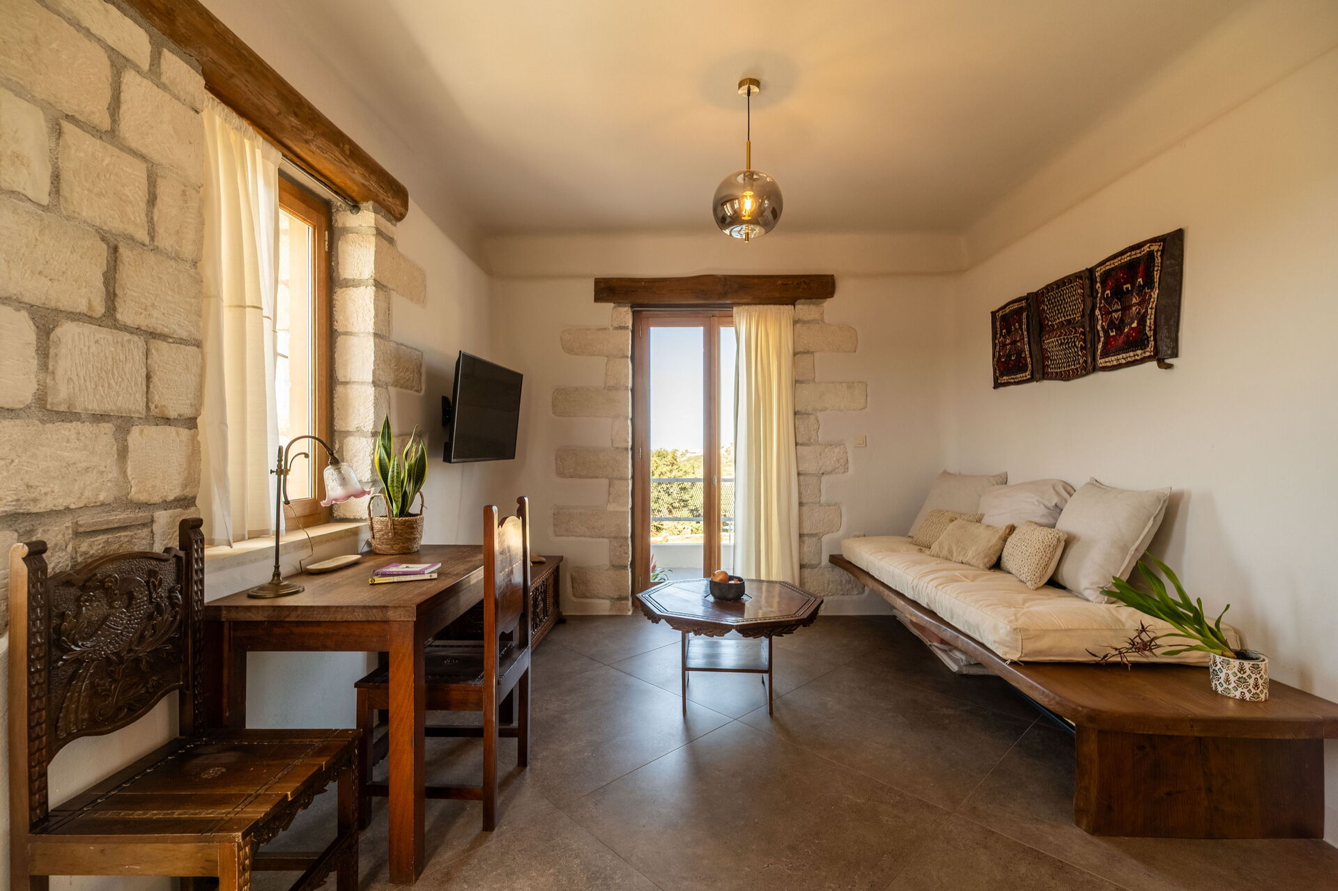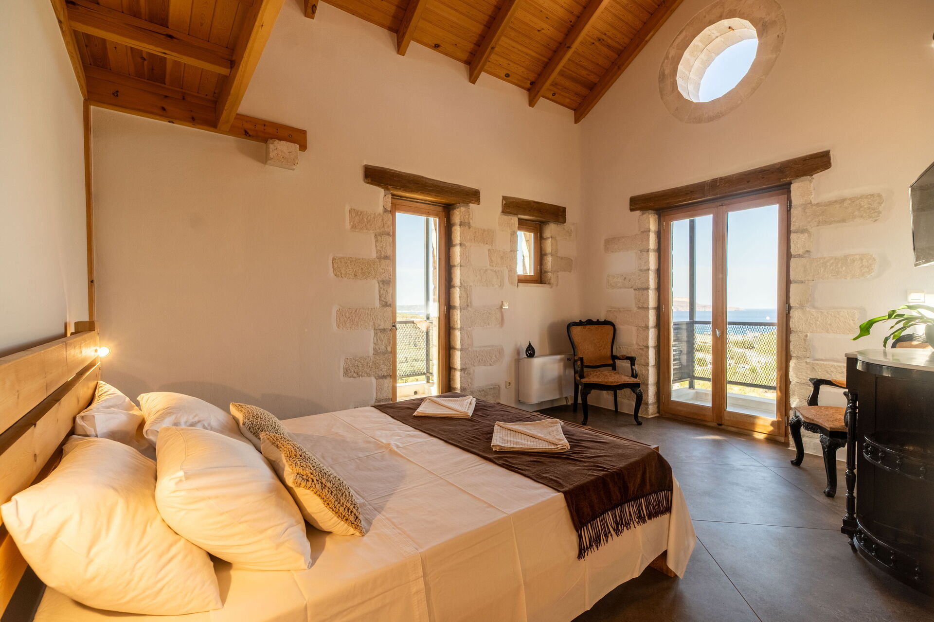 Im Außenbereich erwartet die Gäste ein möblierter Bereich mit Grill und Tisch für Mahlzeiten im Freien, ein privates Schwimmbad zum Abkühlen an heißen Sommertagen und zum Genießen der Ruhe und Stille der Landschaft. Ein herrlicher Panoramablick auf das kristallklare kretische Meer rundet das Angebot ab.