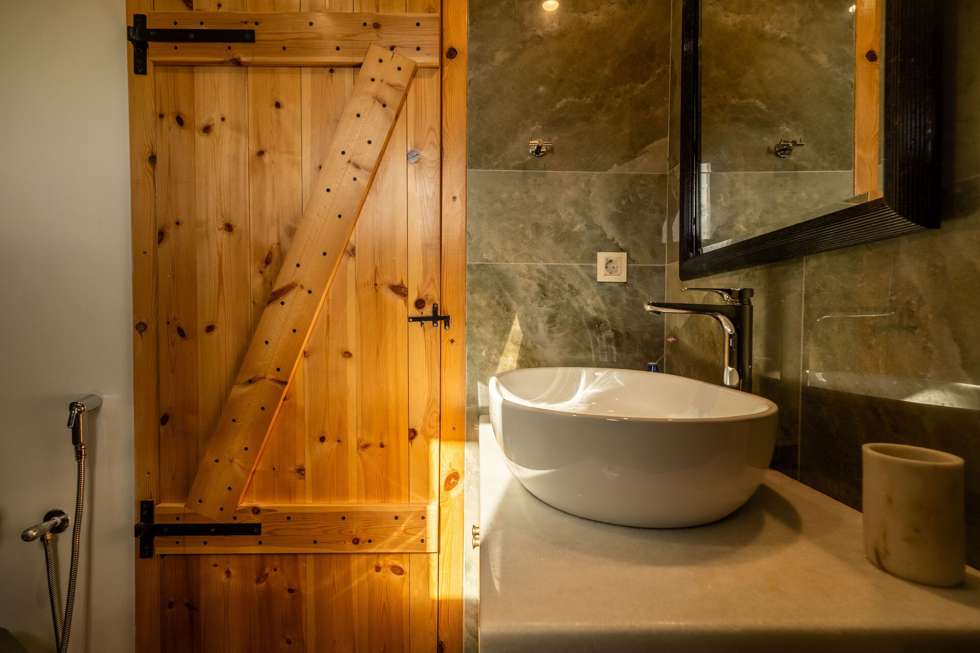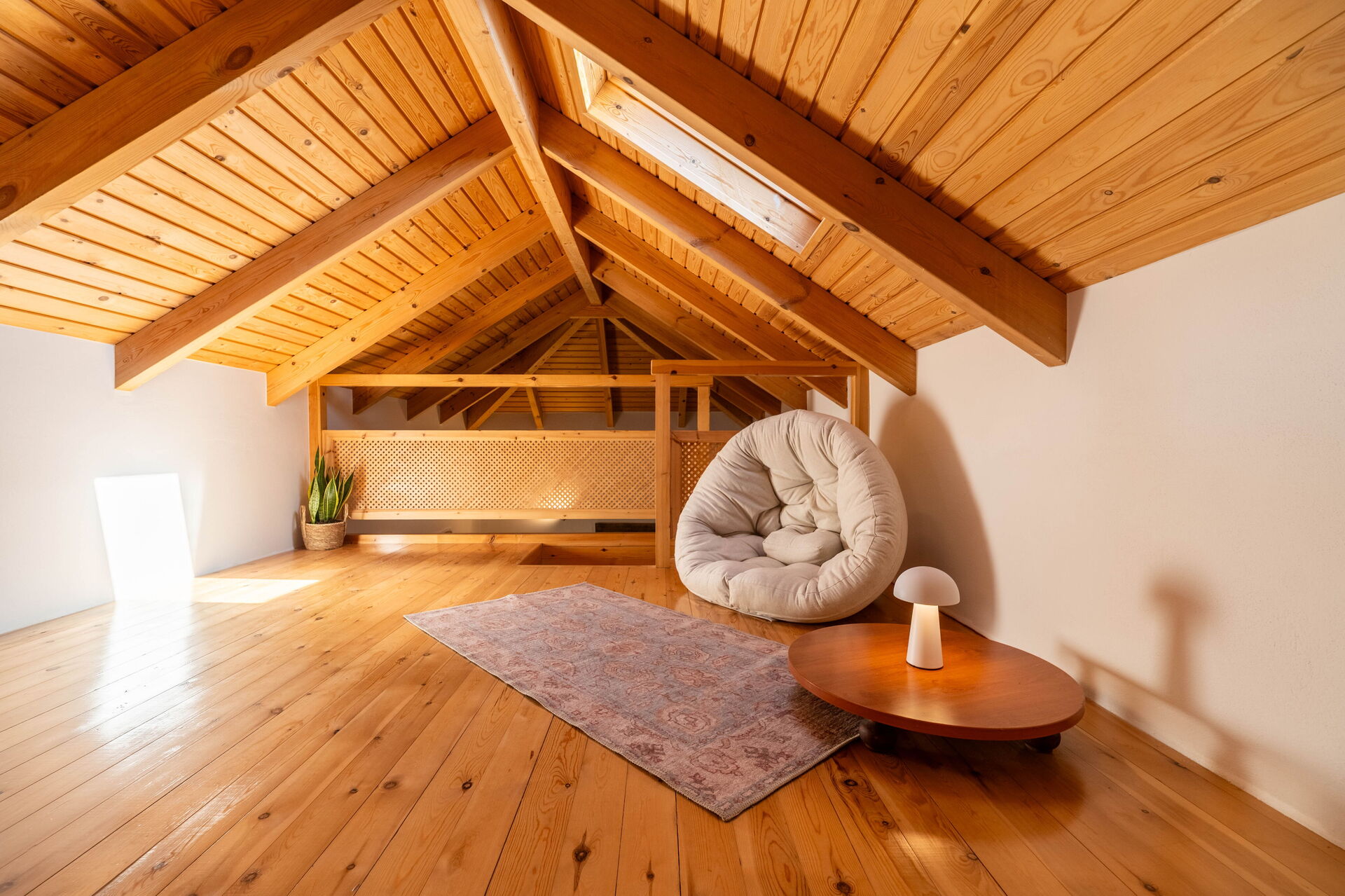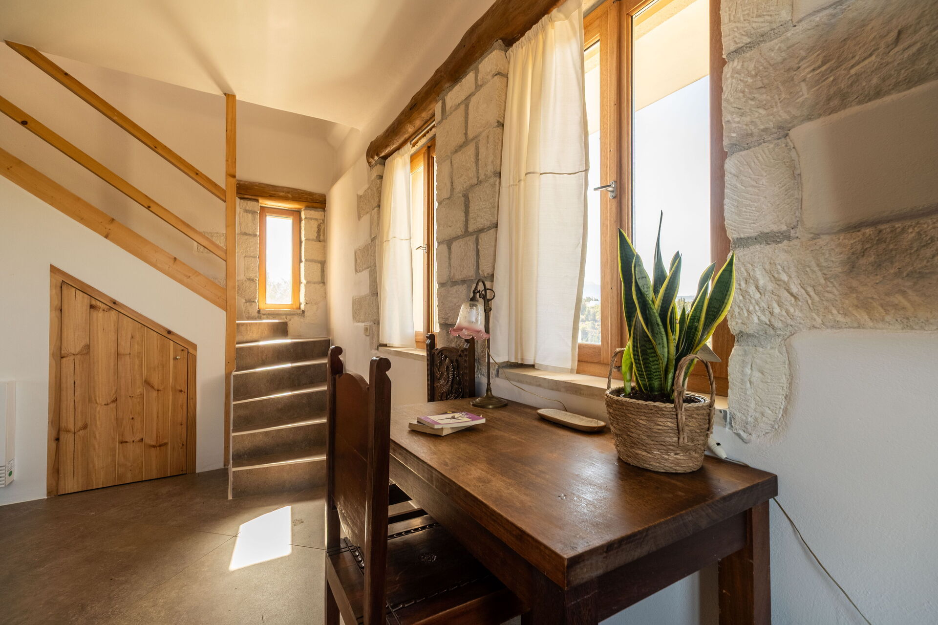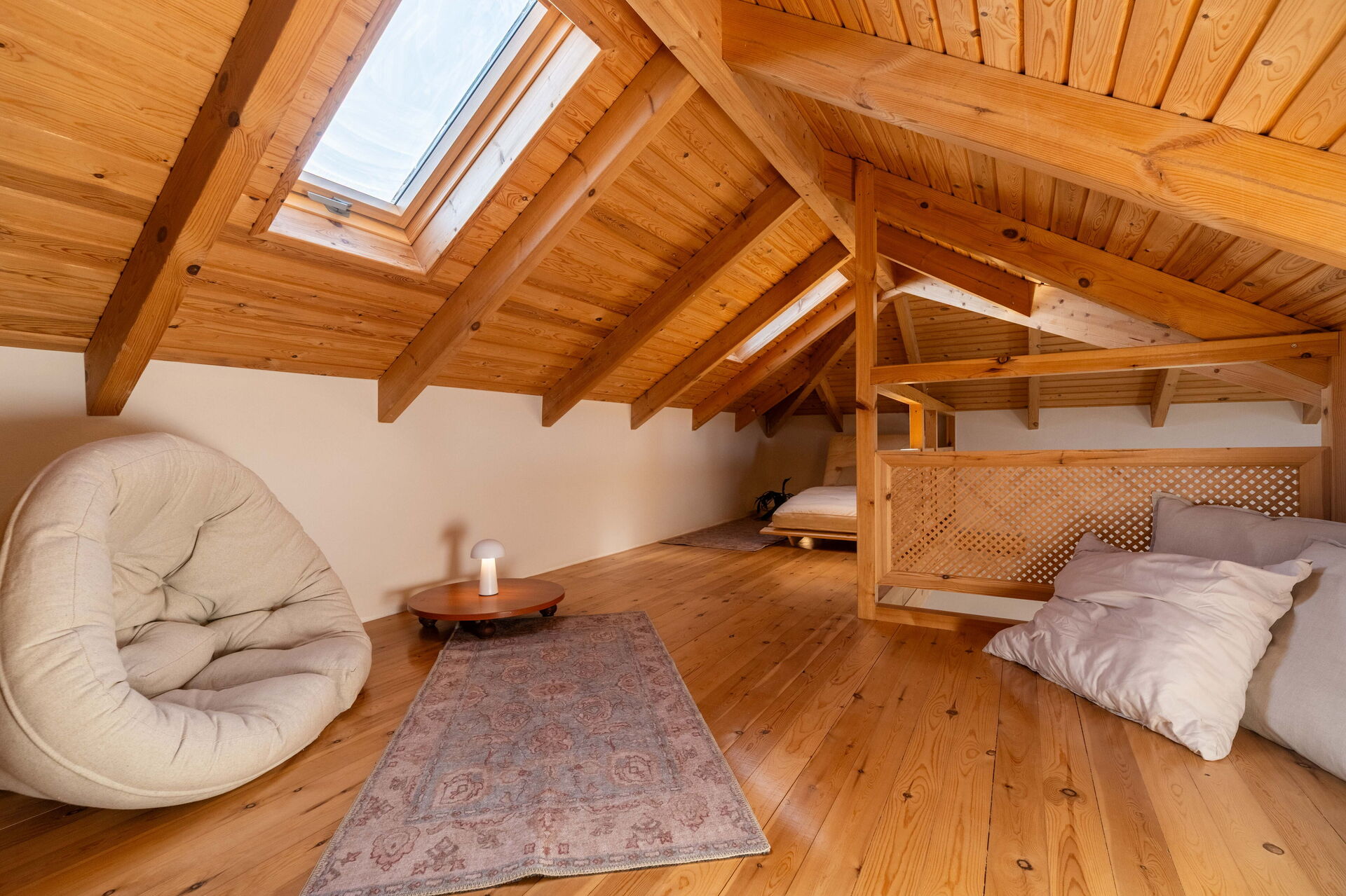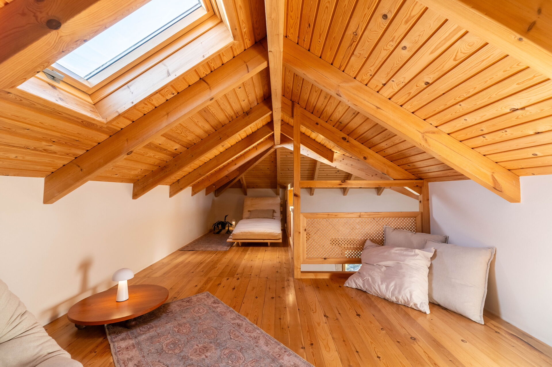 1.Stock: Doppelzimmer mit Zugang zu einer Galerie mit zwei Einzelbetten, Badezimmer mit Dusche.