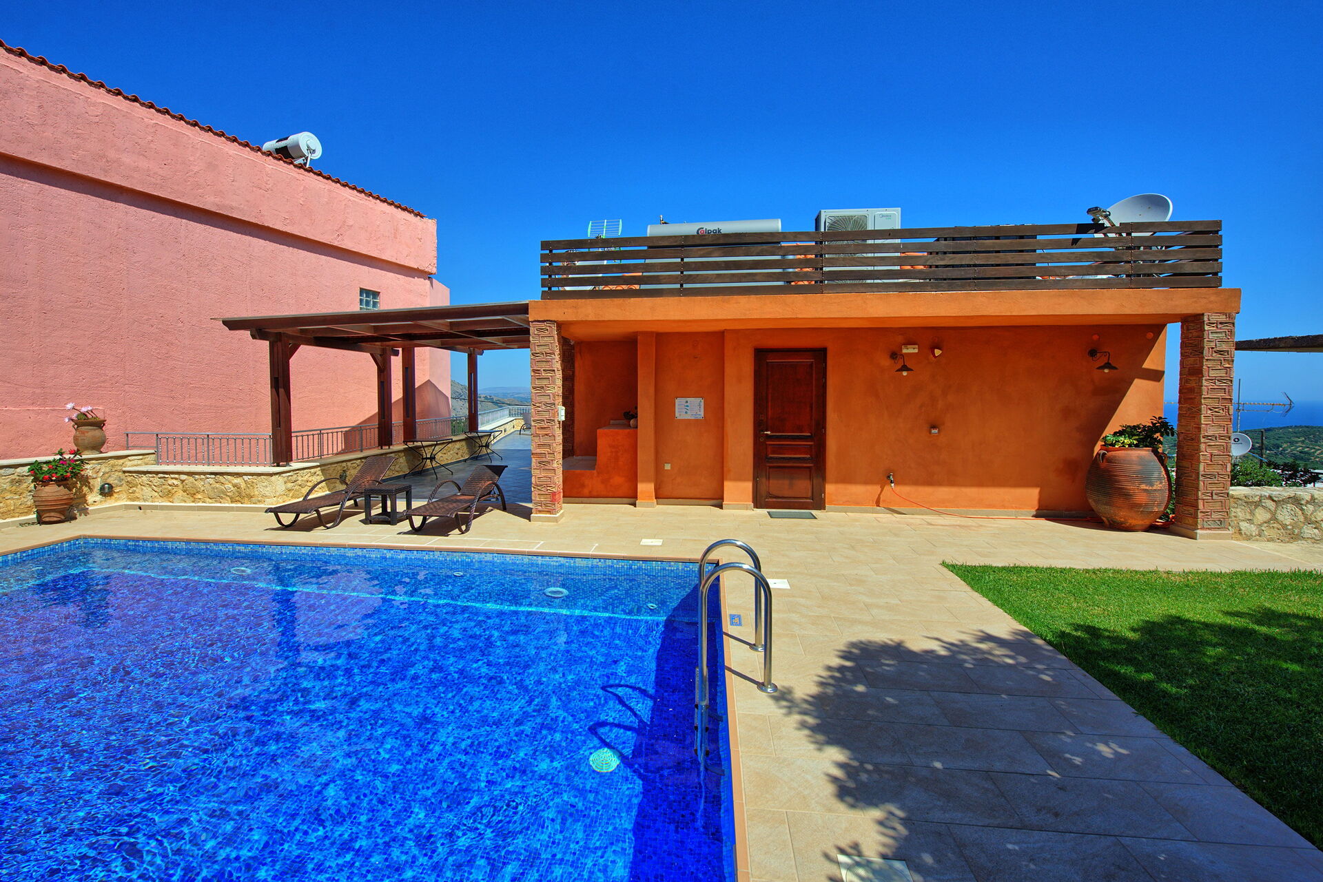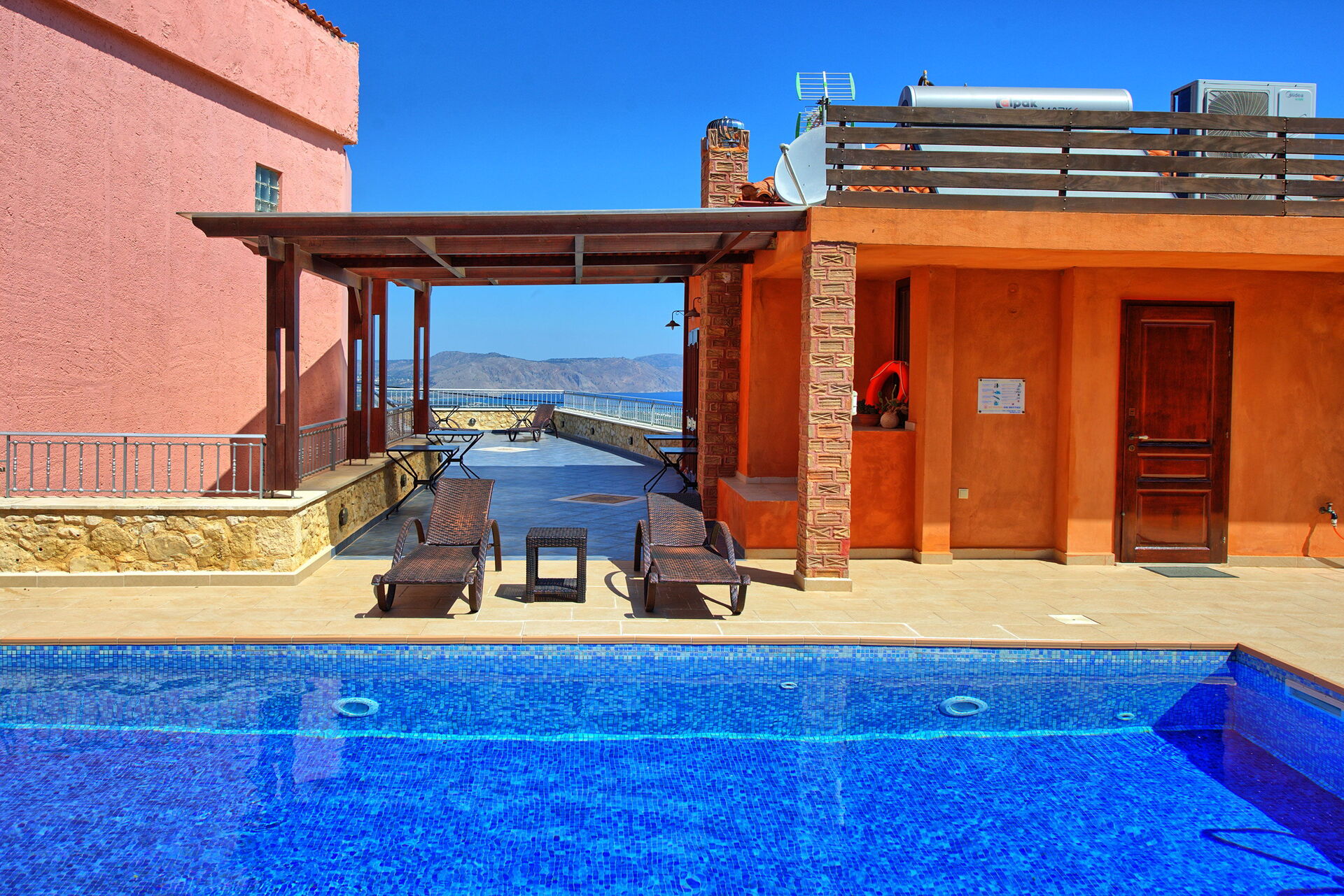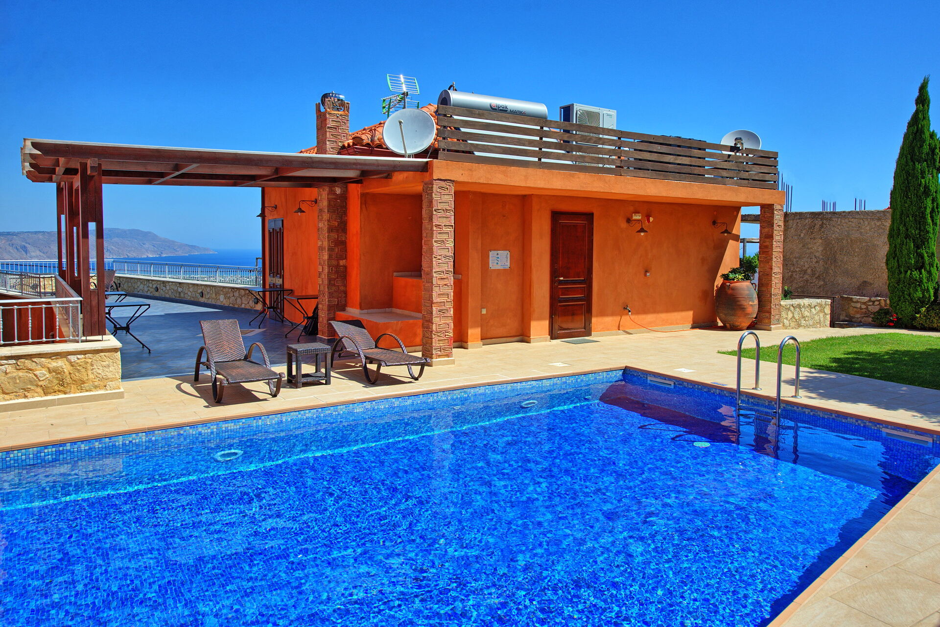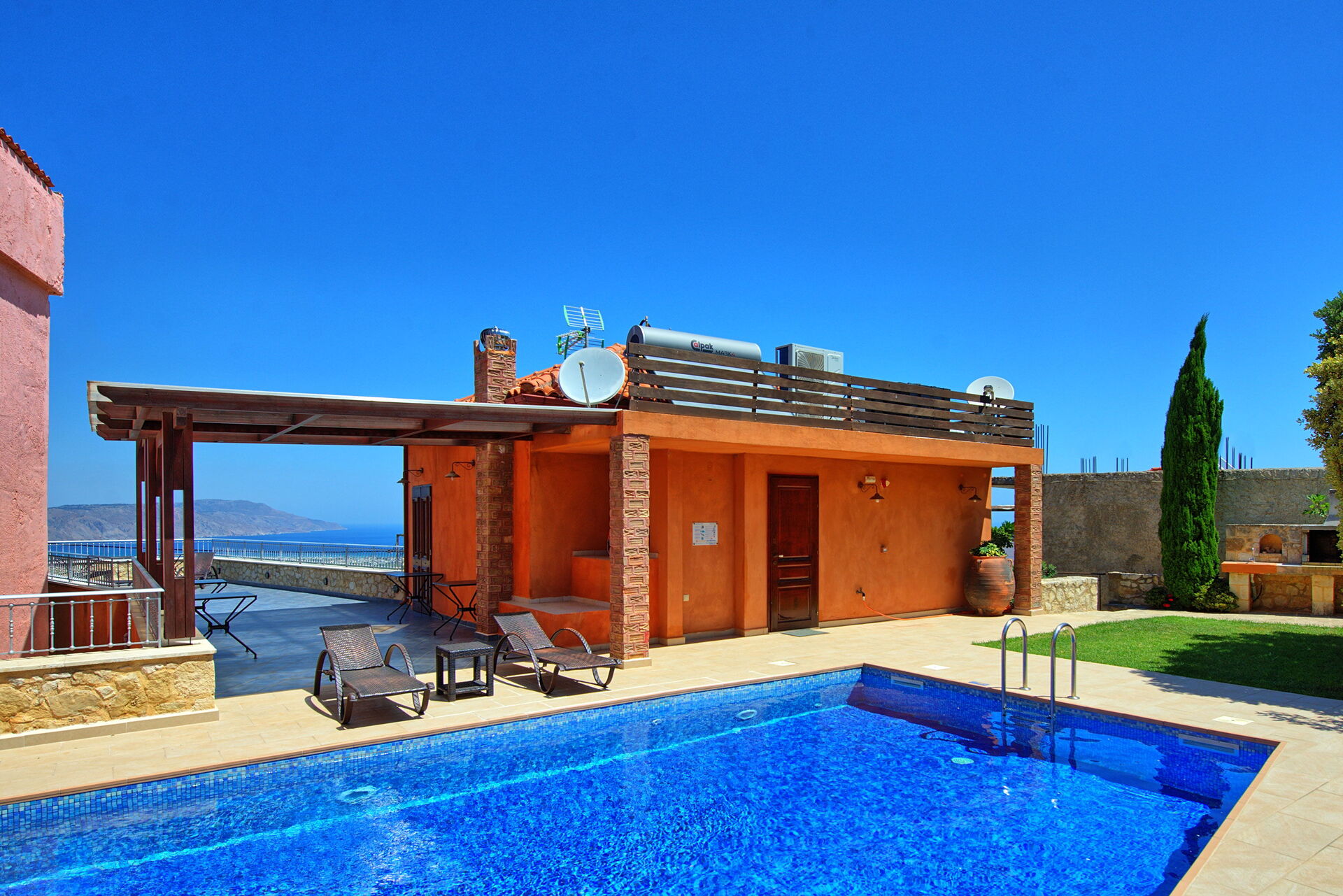 Very spacious villa, very clean and well presented. Fantastic views of sea and mountains, well equipped. Plenty of space for outdoor living, very clean pool. Owners very communicative. Could do with some more sharp knives for food preparation, and maybe some plastic glassware to take to the pool.