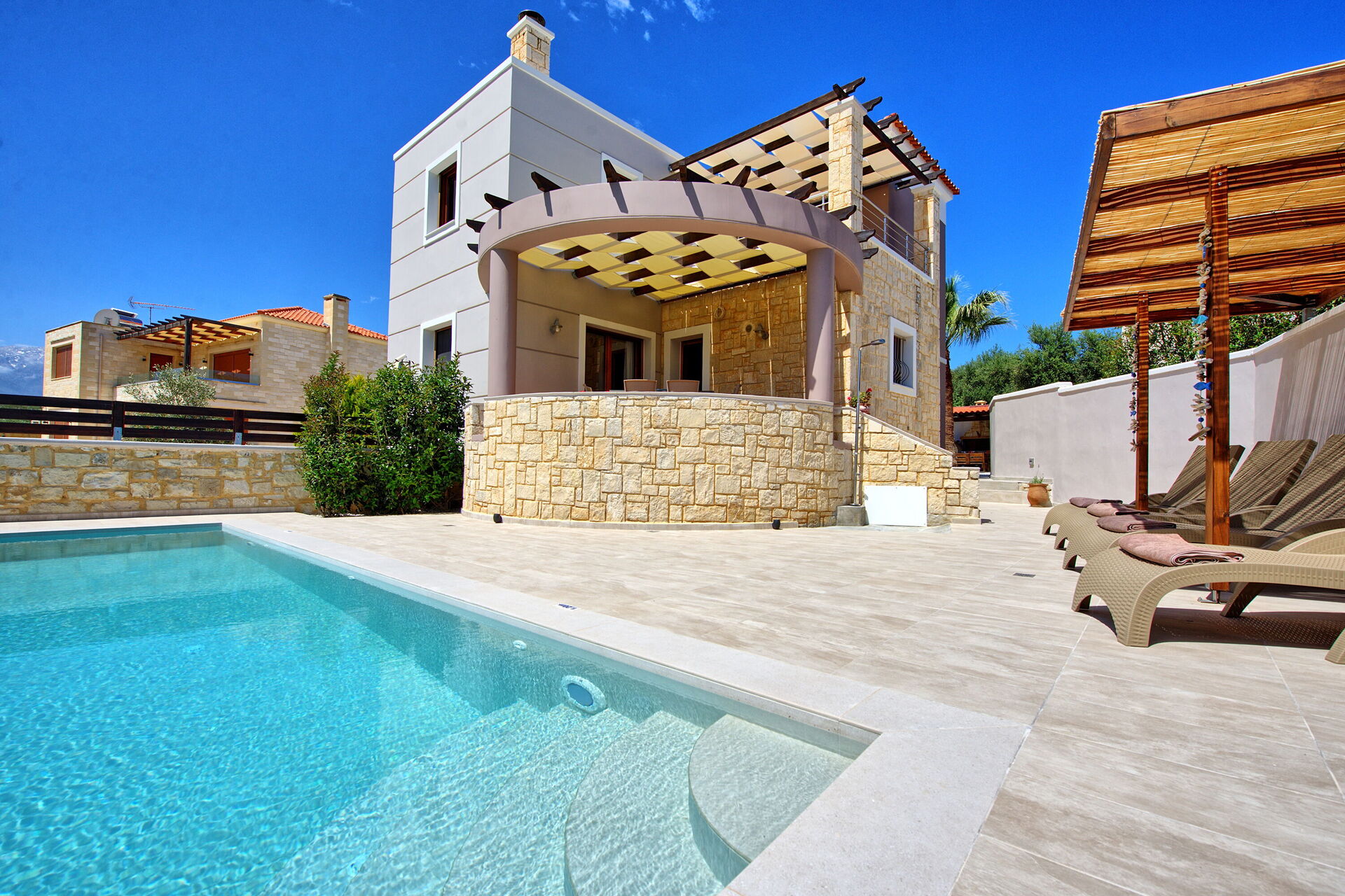 Die Villa liegt strategisch günstig zwischen den berühmten Badeorten Almyrida und Kalyves, zwei bezaubernden Küstenstädten, die für ihre Sandstrände und Strandclubs berühmt sind.