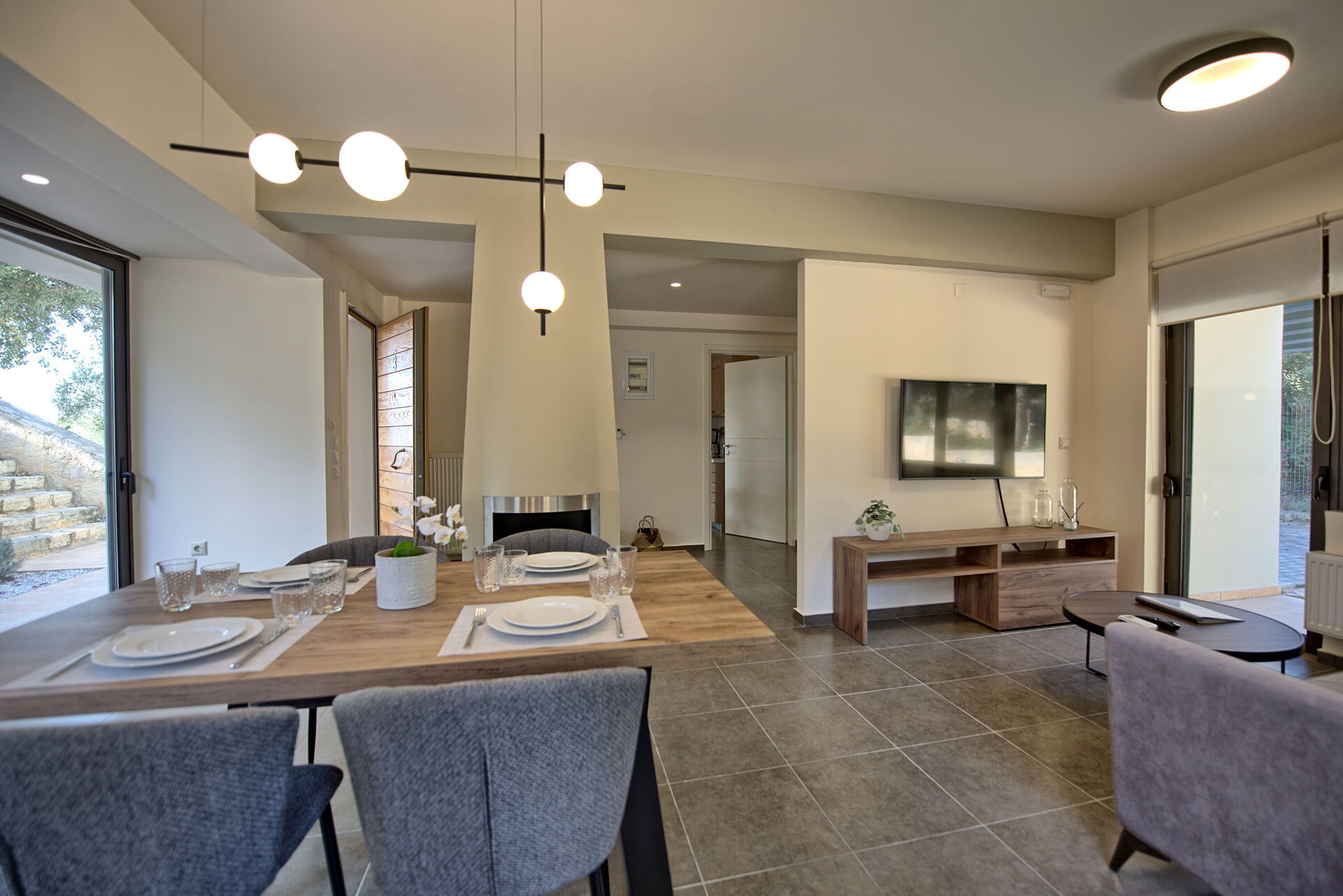 Villa Dioni verfügt über verschiedene Open-Air-Bereiche: am Eingang der Villa befindet sich ein überdachter Tisch mit Stühlen, im ersten Stock gibt es eine große Terrasse mit zusätzlichem Essbereich und schließlich eine charmante Dachterrasse mit Sonnenterrase (vom Zimmer aus zugänglich im obersten Stock). Der atemberaubende Ausblick vom Dach, auf die umliegende Landschaft und auf das Meer, bereichert den Urlaub.