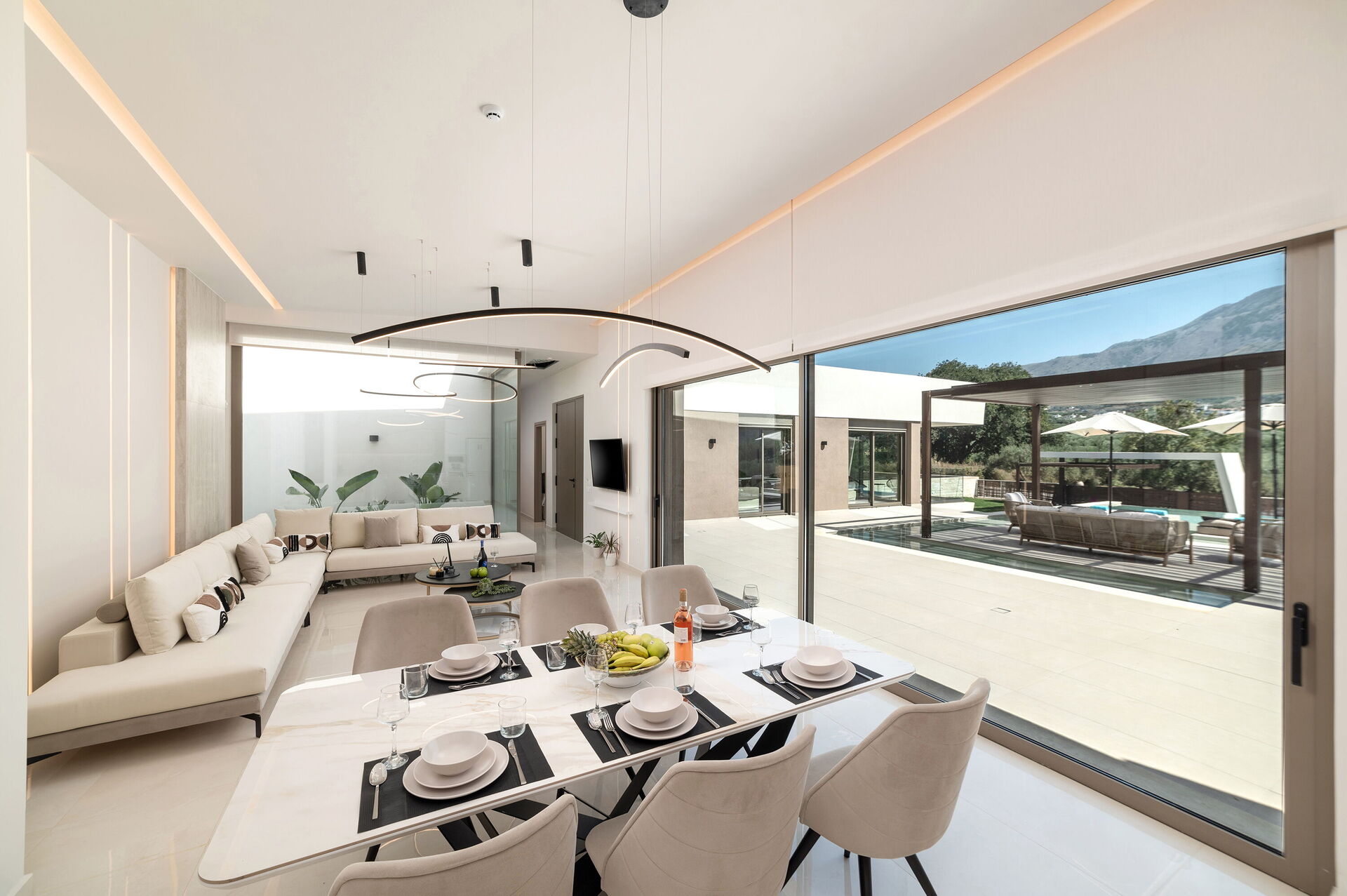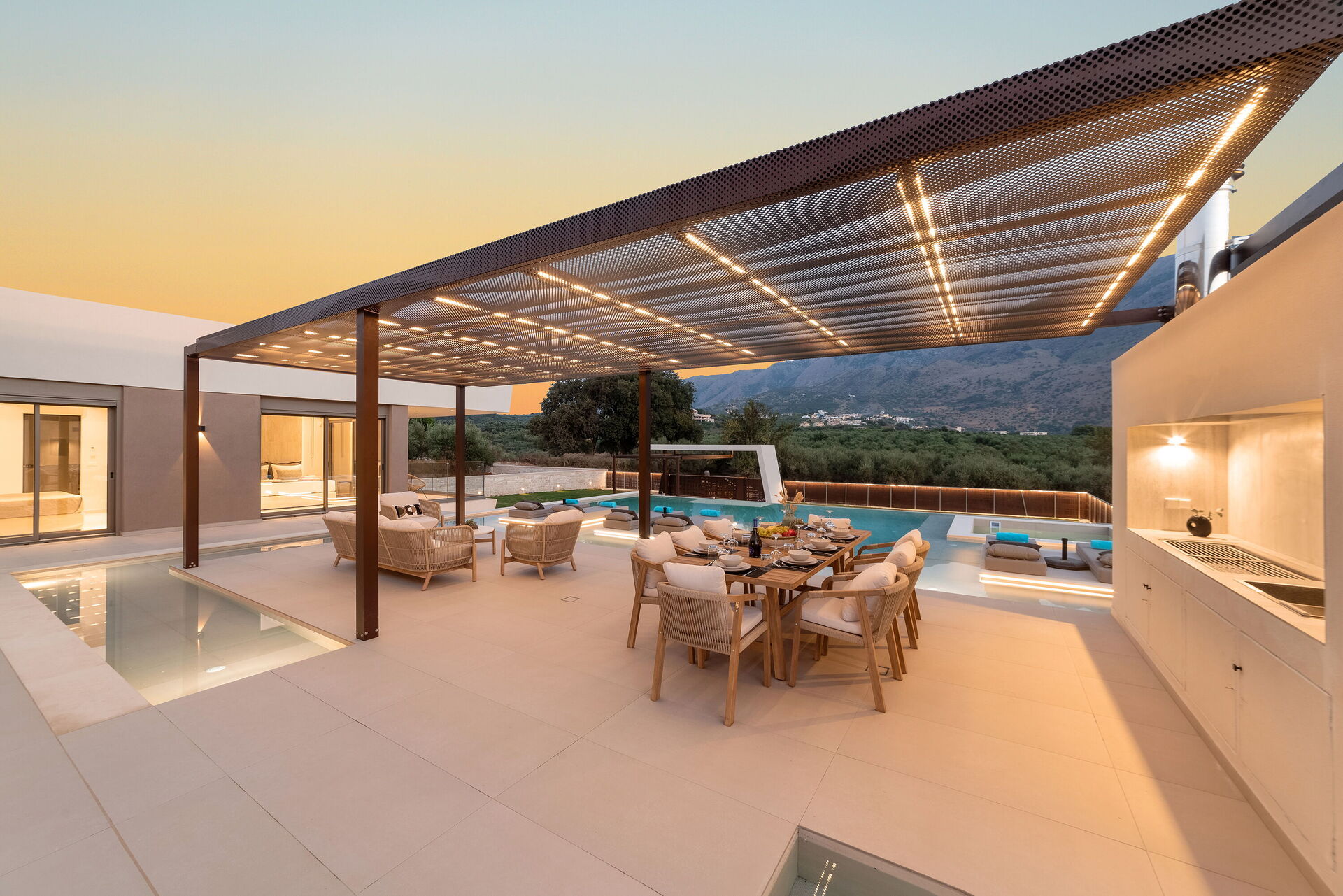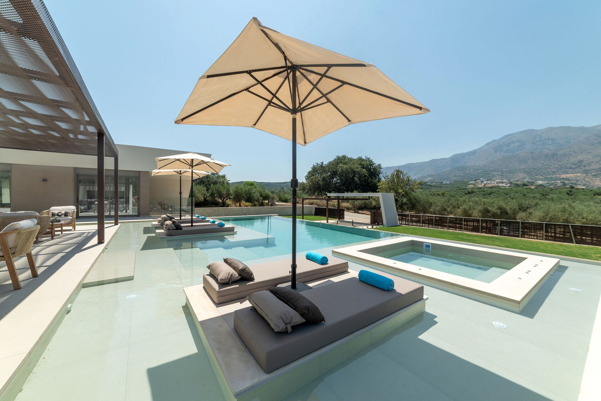 Diese sehr helle Luxusvilla ist ausgezeichnet durch schönes Design und Komfort: große Sorgfalt wurde auf die Auswahl der Einrichtung und die Aufteilung der Räume gelegt. Sowohl im Innenbereich als auch im Aussenbereich wurde alles darauf ausgelegt, den Gästen maximalen Komfort zu bieten. Dank seiner 4 Schlafzimmer bietet die Villa bequem Platz für bis zu 7/8 Personen. Im Aussenbereich befindet sich ein großer Bereich, der zum Kochen und Essen im Freien ausgestattet ist und es den Gästen ermöglicht, die schönen Sonnentage der Insel Kreta zu genießen. Ganz zu schweigen von dem schönen Schwimmbad (mit Hydromassagebereich), das den Gästen exklusiv zur Verfügung steht und Erfrischung und Spaß für alle bietet.