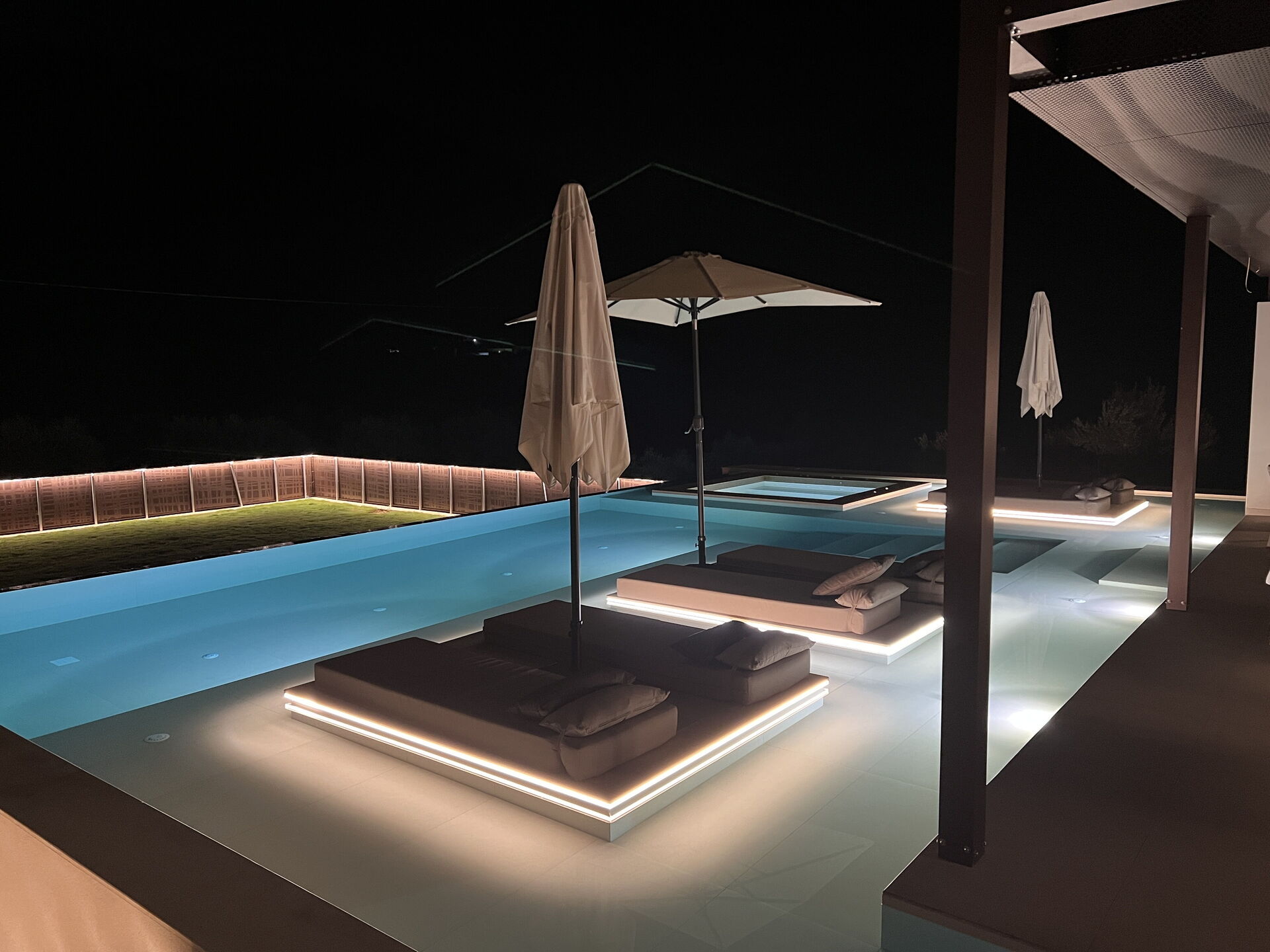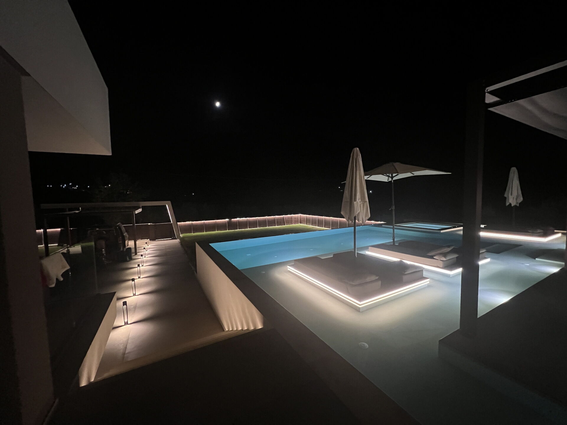 The Villa is n a beautiful setting of olive trees, with stunning views of the mountains. The Villa is very modern, was spotlessly clean and we felt the pool area in particular felt really luxurious- it’s easy to spend lazy days here listening to the crickets, the goat bells and the cockerel.