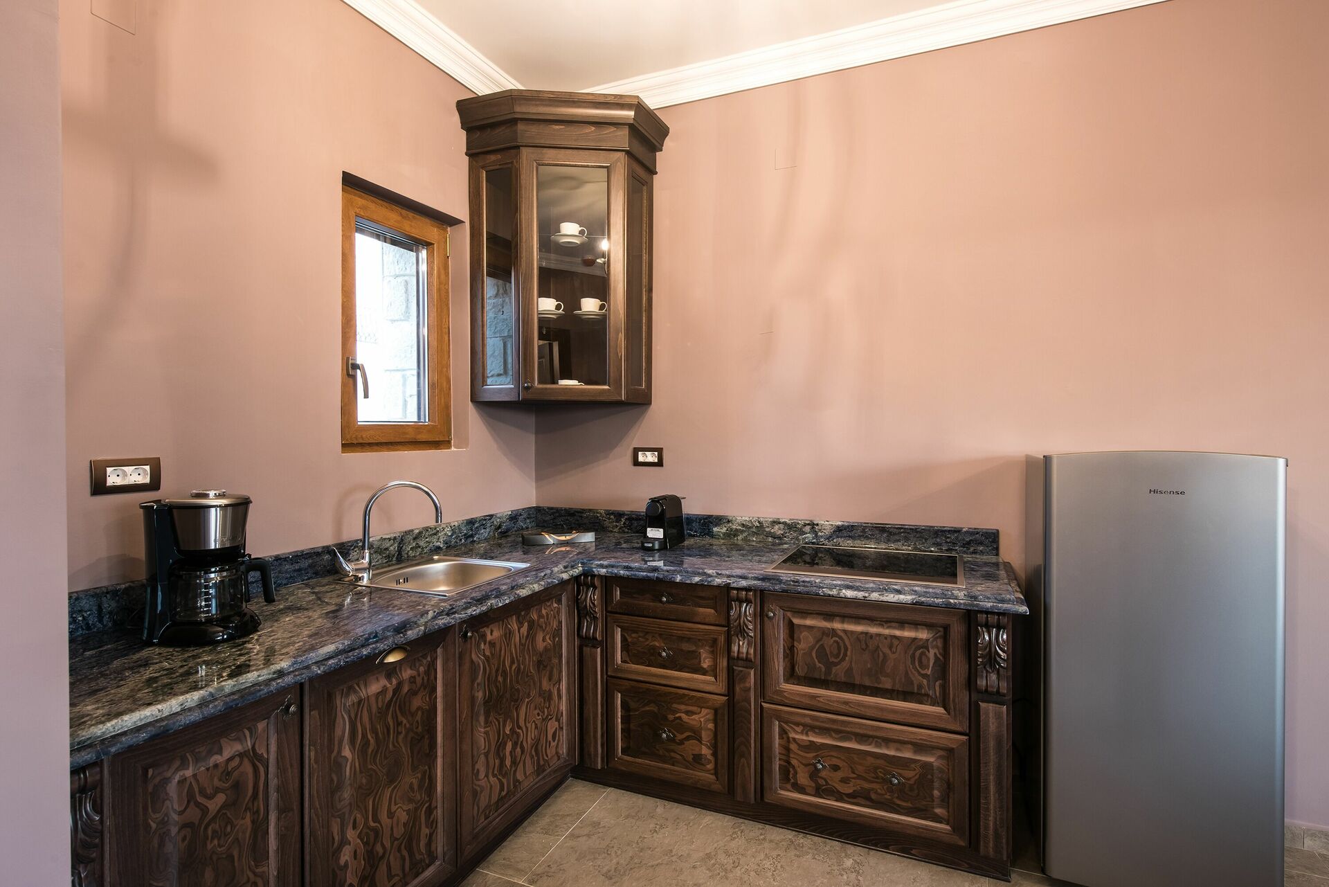Erdgeschoss: Eingang mit verzierter Marmortreppe, Wohnzimmer mit Zugang zur Veranda und Terrasse, Essbereich, gut ausgestattete Küche, 1 WC, Doppelzimmer mit Ehebett und privatem Bad mit Badewanne.