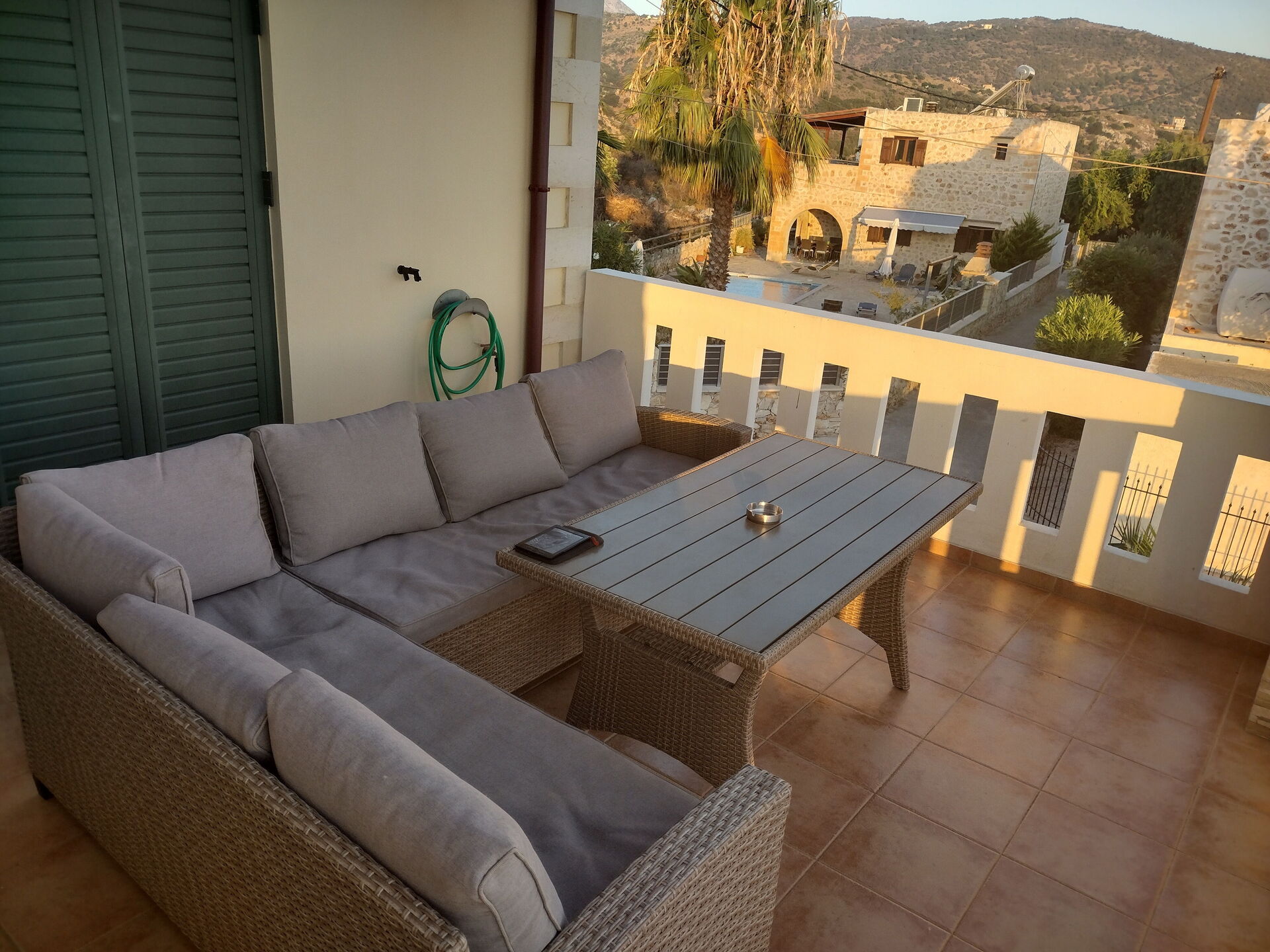 We thoroughly enjoyed our stay. Great villa which is well equipped and kept immaculate. The pool is a great size and the outside areas offer variety. The BBQ was good to use as well . The villa is located in the country side with a few other villas nearby so is very peaceful with great views. It has easy access to Chania and Rethymno via the main road. Supermarket nearby in Kalyves. Neon Khorion is just down the hill and has a great taverna and a small supermarket.