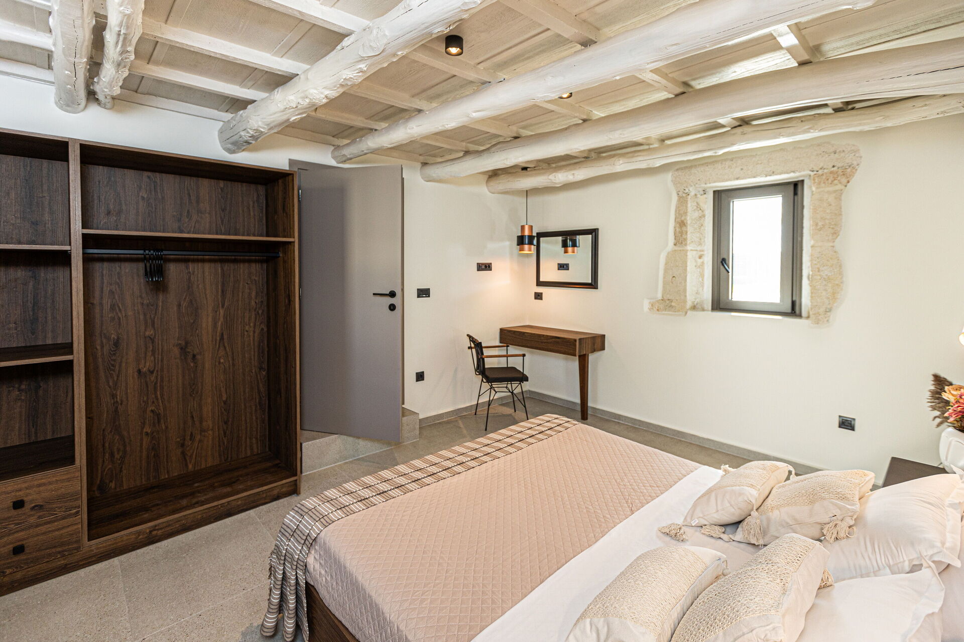 Zwischengeschoss (über eine elegante Holztreppe erreichbar): Doppelzimmer (Klimaanlage) mit Zugang zu einer Panoramaterrasse mit Meerblick.