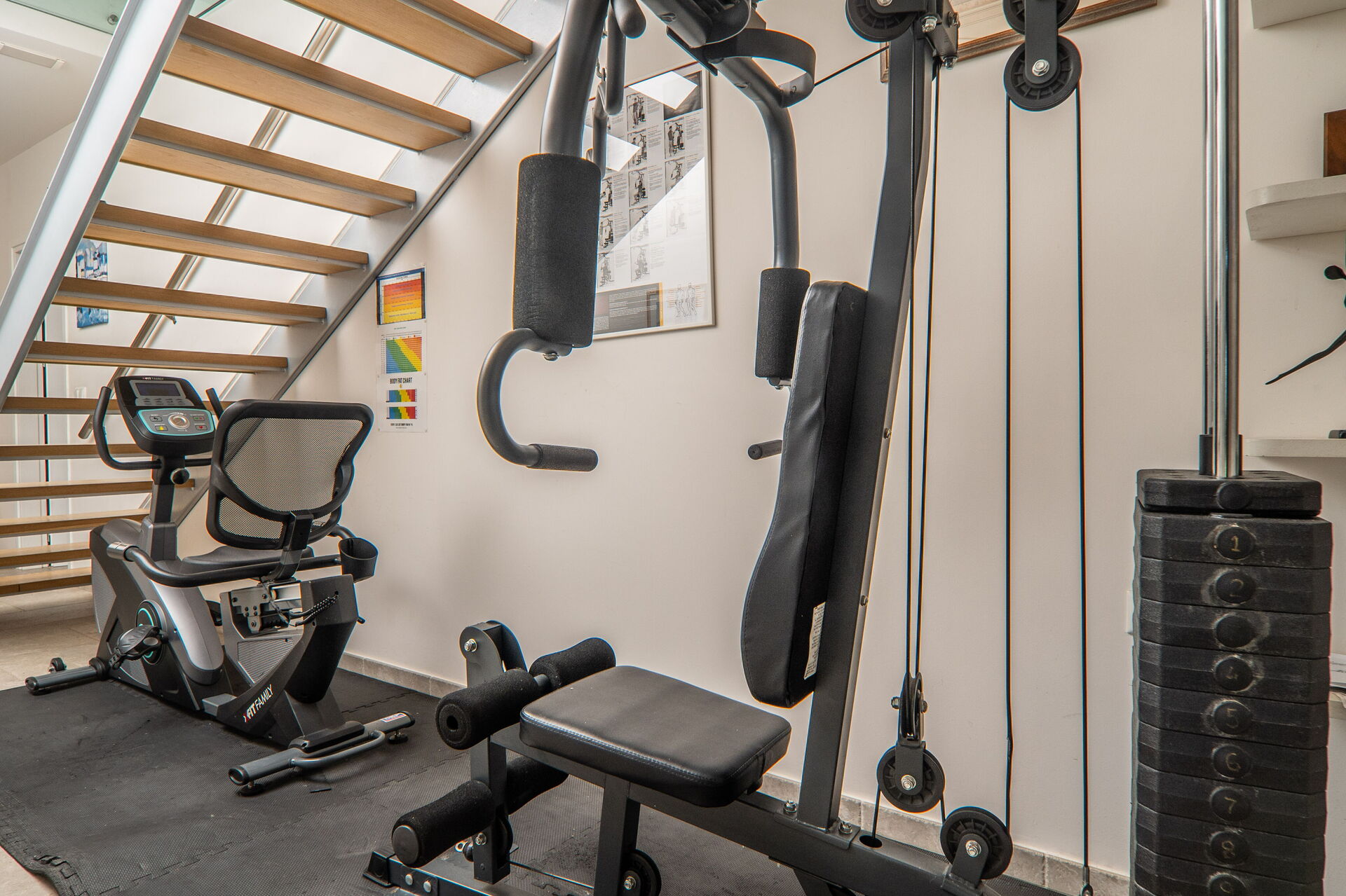 Untergeschoss: 1 Doppelzimmer, 1 Badezimmer mit Dusche und Badewanne, 2 Doppelzimmer mit jeweils privatem Bad mit Dusche, Waschküche (Waschmaschine und Trockner), Raum mit Heimtrainer und Krafttrainingsgerät.