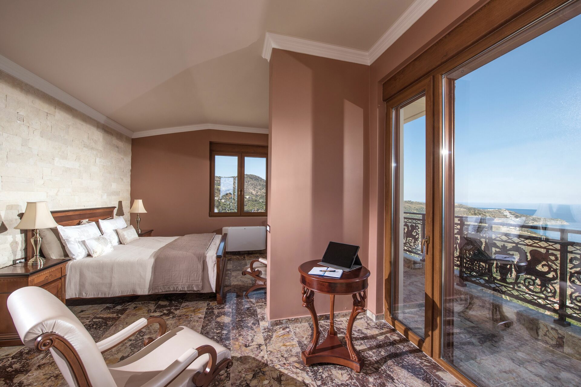 Zweiter Stock: Hauptsuite mit Kingsize-Doppelbett und privatem Balkon mit Panoramablick auf das Meer, Bad mit Dusche.