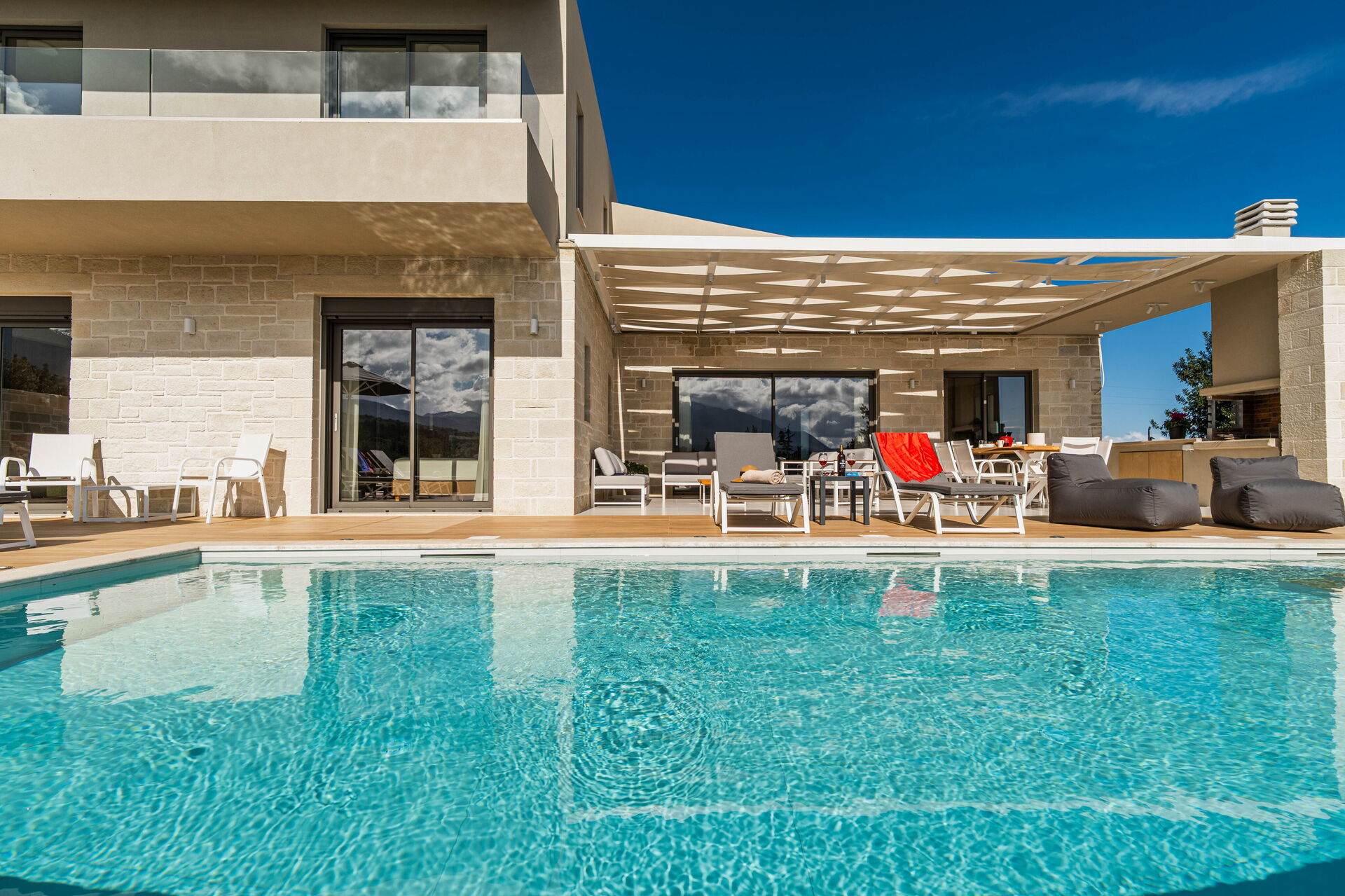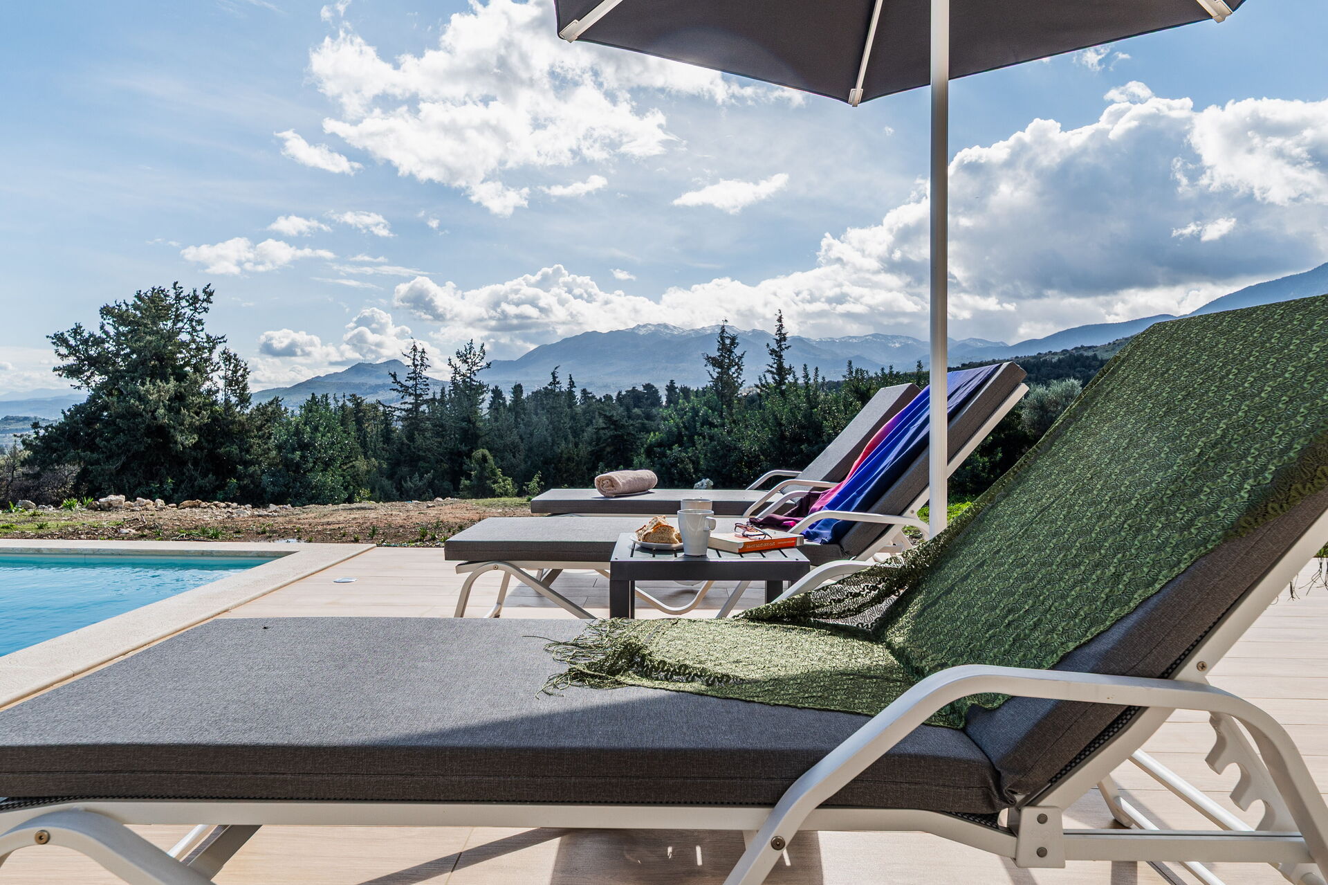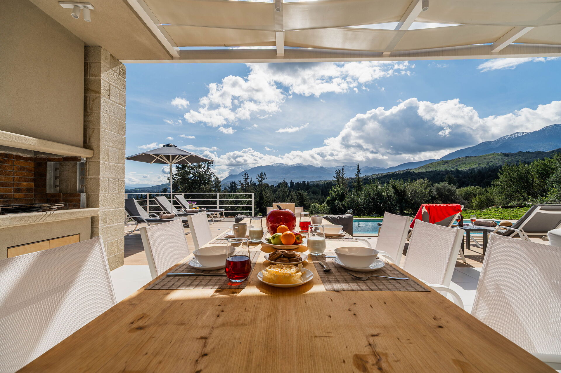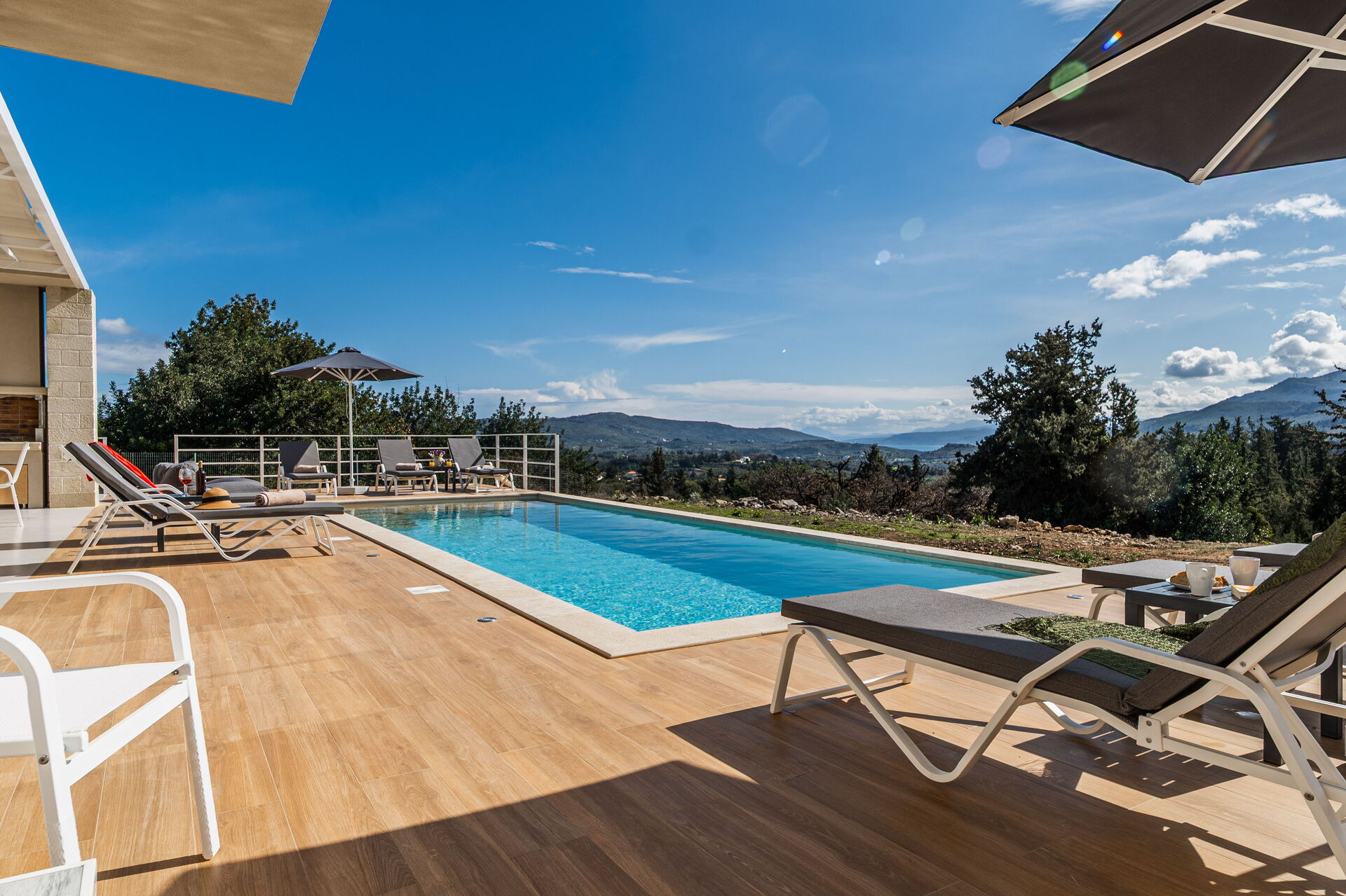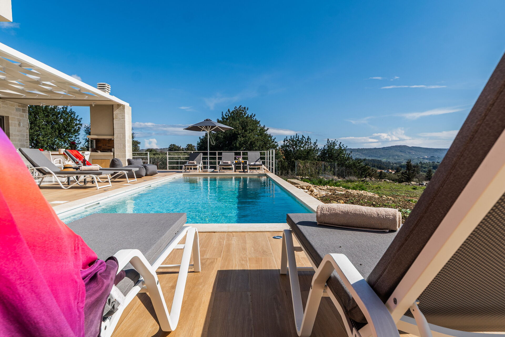 We thoroughly enjoyed our stay at the villa. It was luxurious, spacious, and clean, with every comfort. Beautiful views of the mountains and the sea, under the covered patio with a barbecue, lounge set, and dining table. There's a lovely pool that can be heated. Finally, a super friendly host.