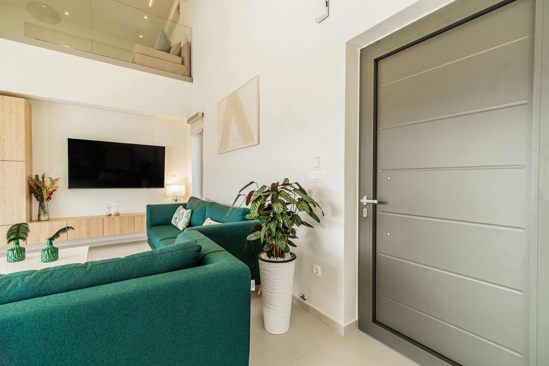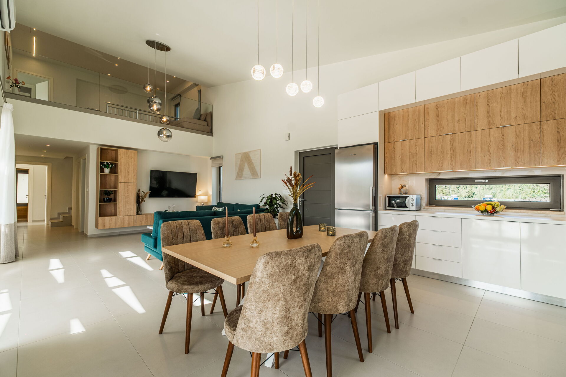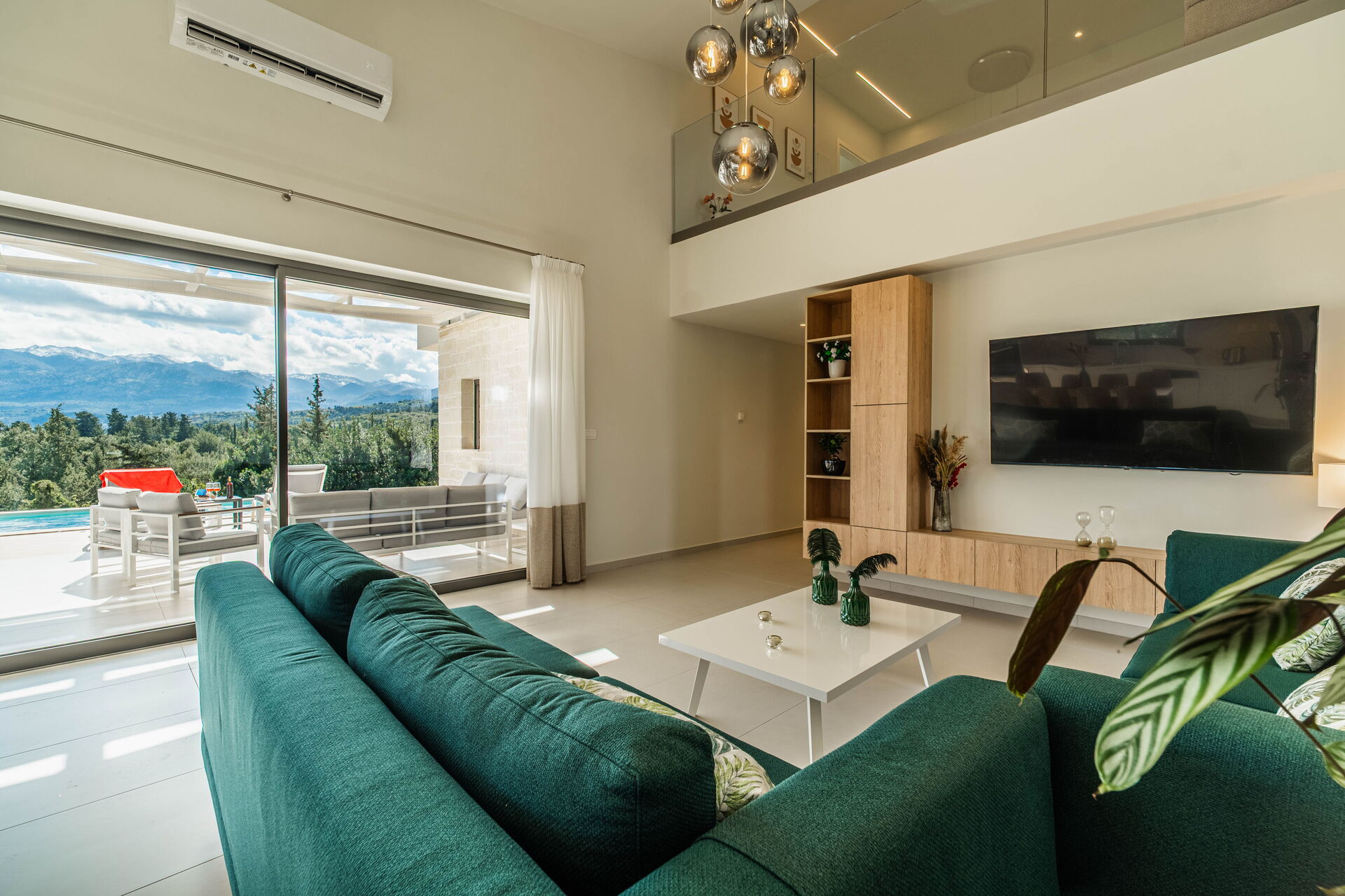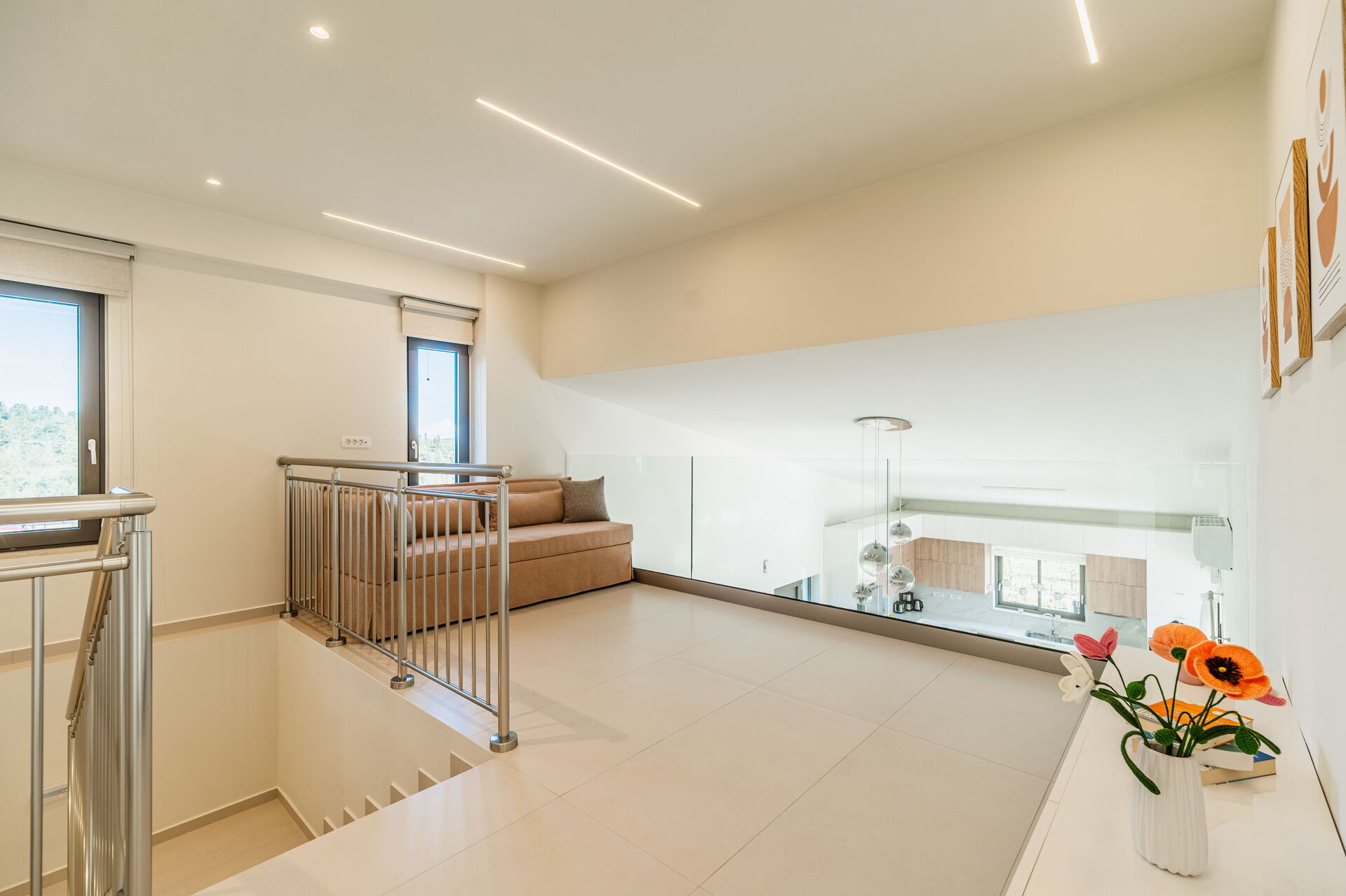 Erster Stock: Doppelschlafsofa im Wohnbereich mit Blick auf die darunter liegende Etage, 2 Doppelzimmer, beide mit privatem Bad mit Dusche und Zugang zu einem gemeinsamen Panoramabalkon.