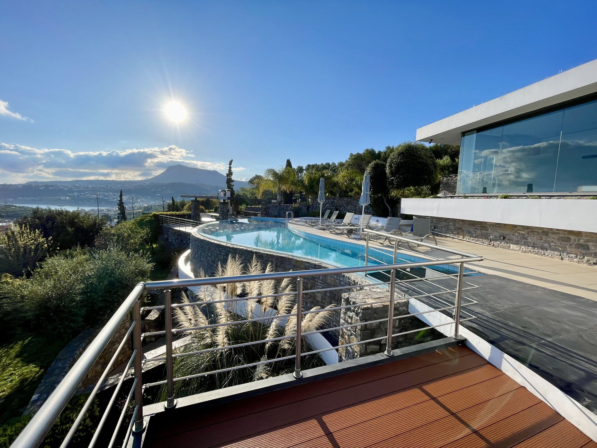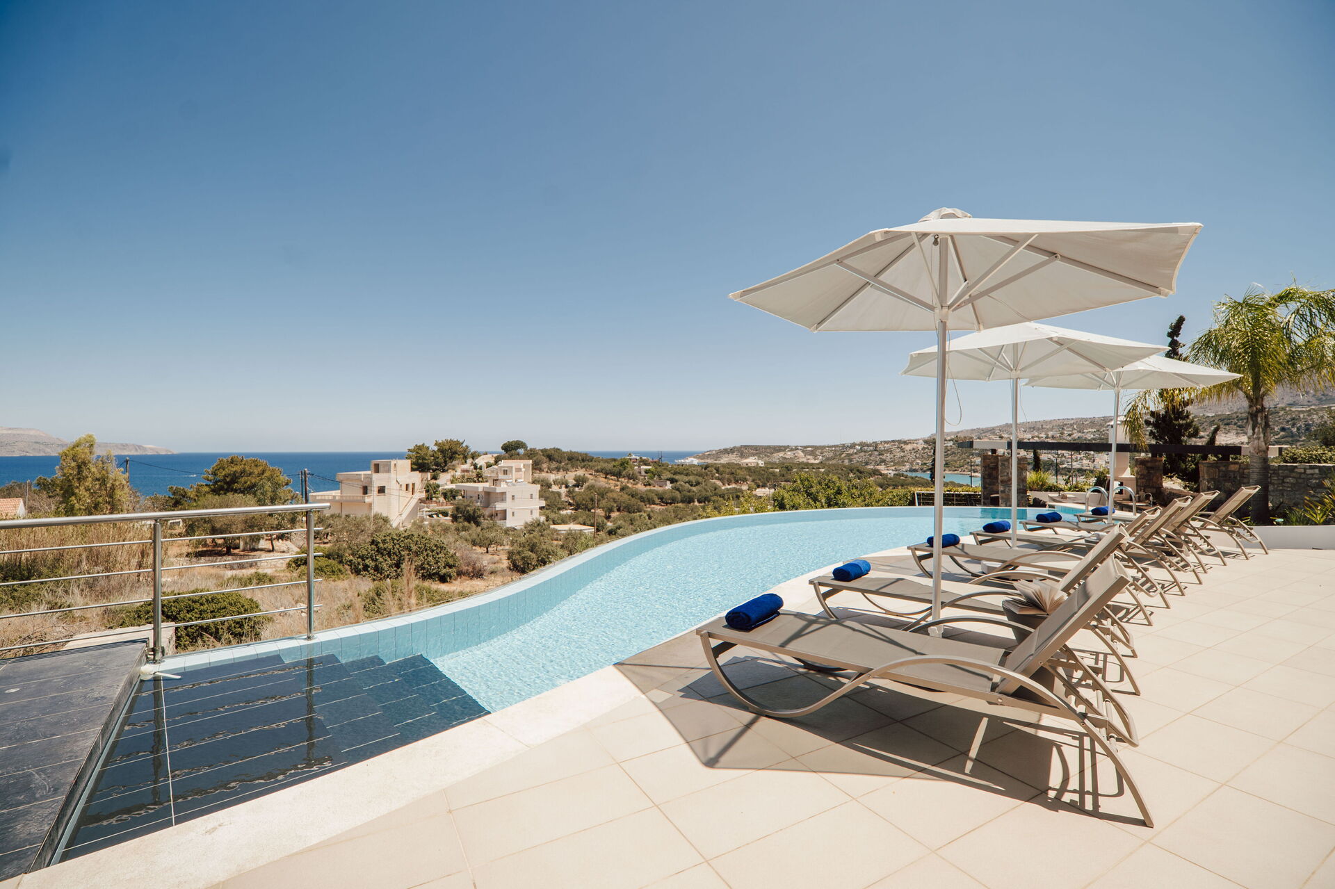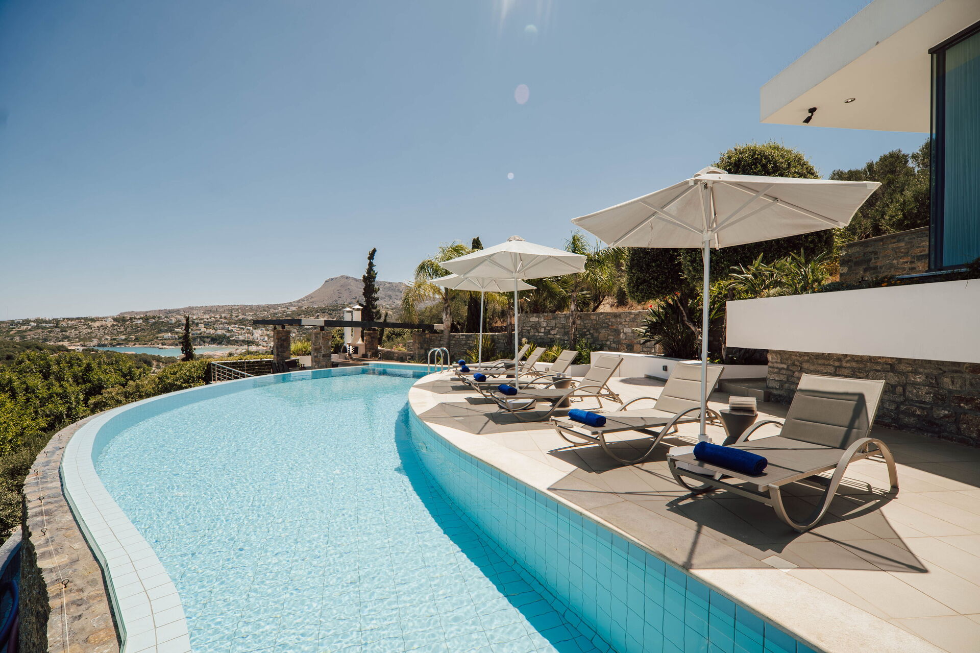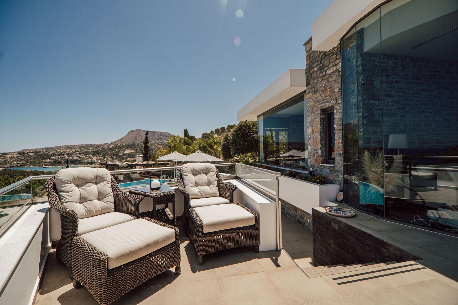 Im Außenbereich gibt es herrliche Panoramaterrassen mit Sonnenliegen, auf denen man sich von der Küstenbrise umschmeicheln lassen und die atemberaubende Aussicht auf die Bucht von Souda und das kristallklare Meer Kretas genießen kann.