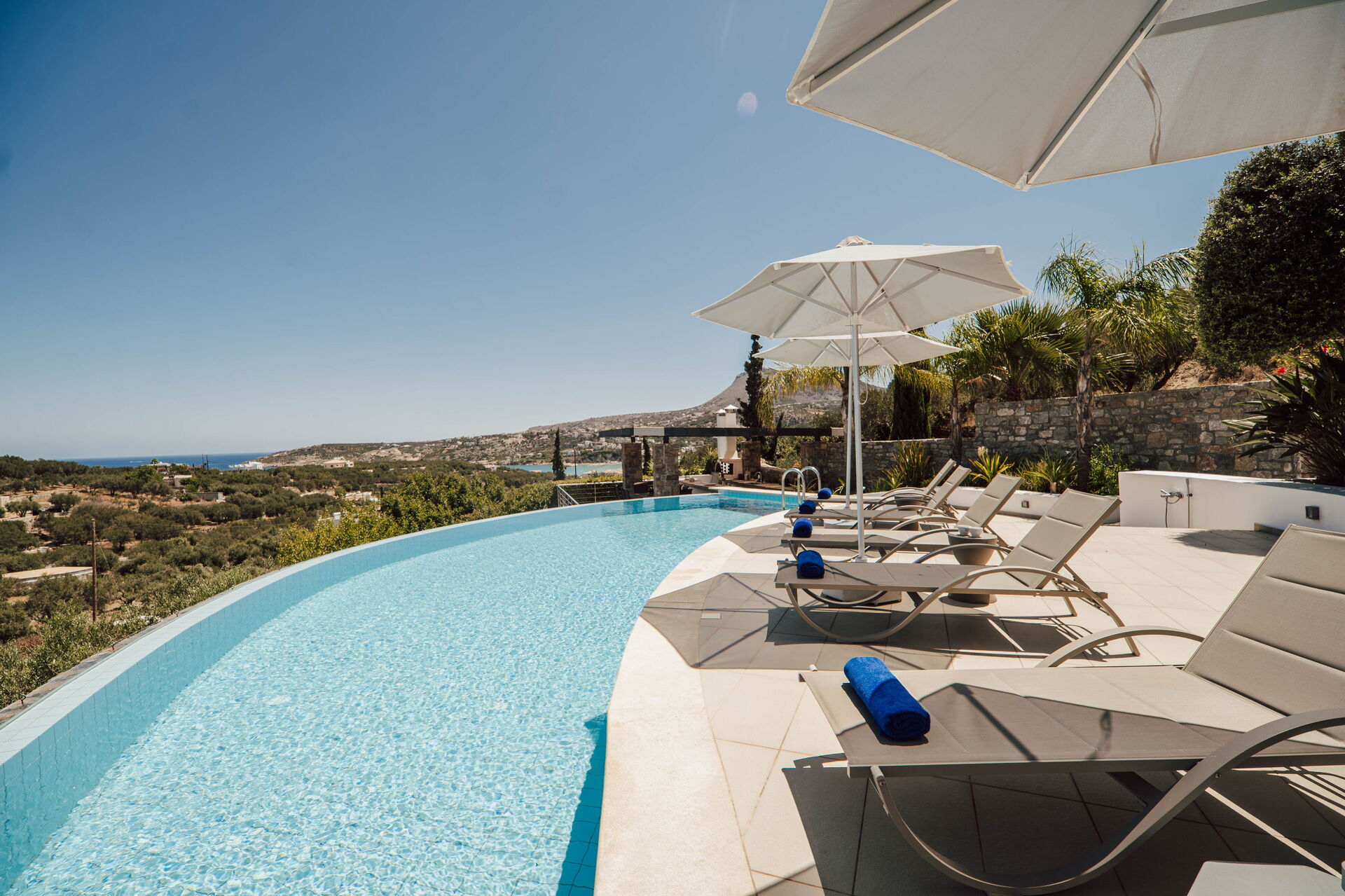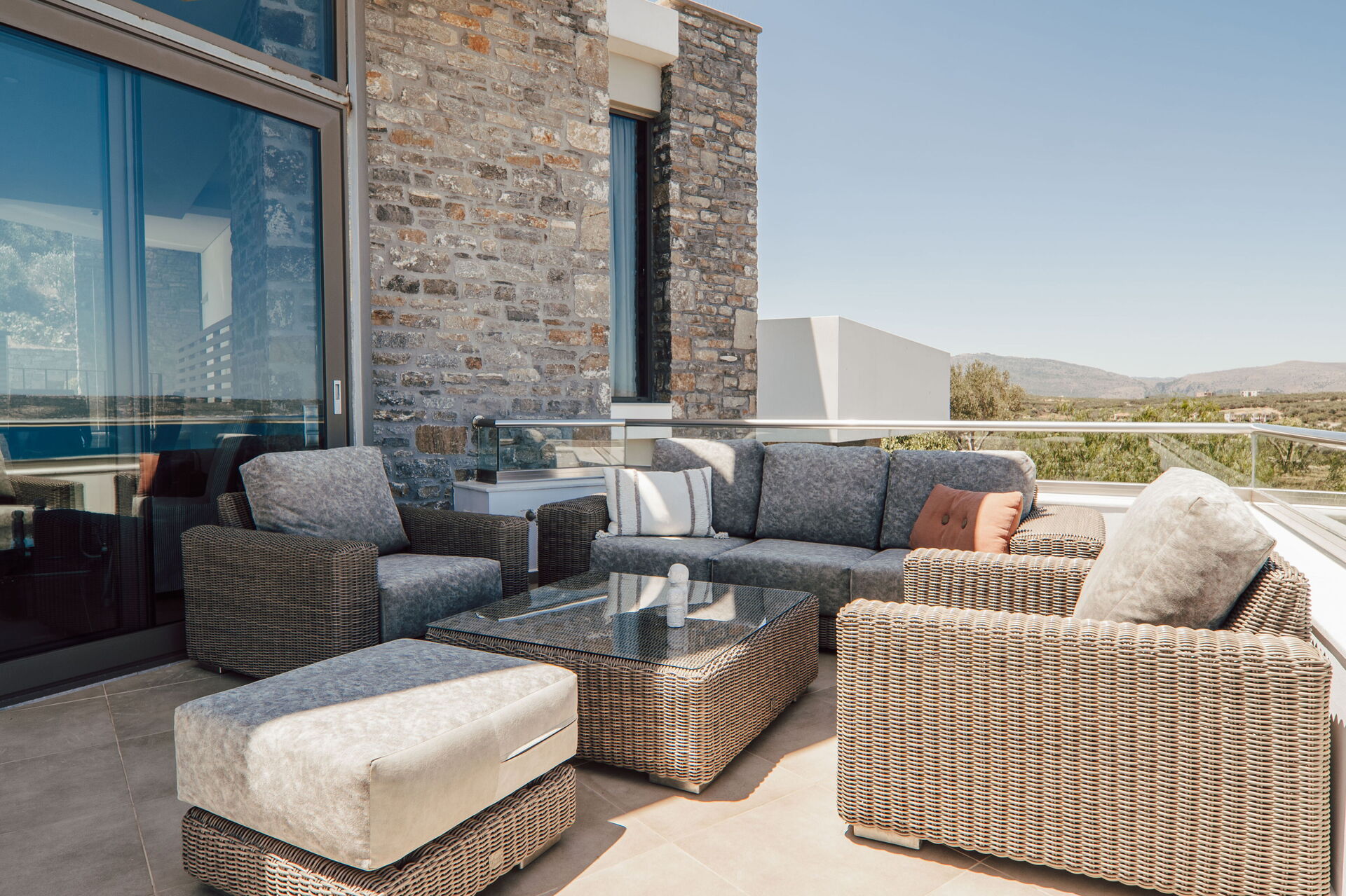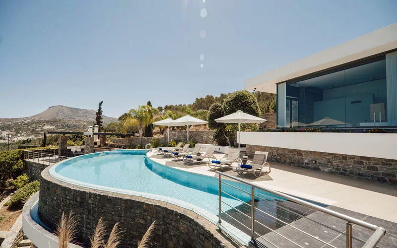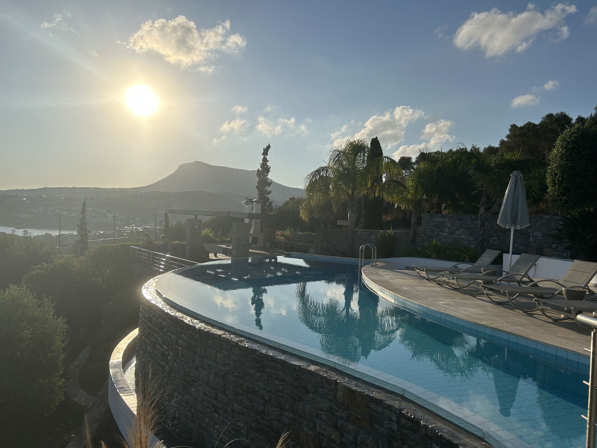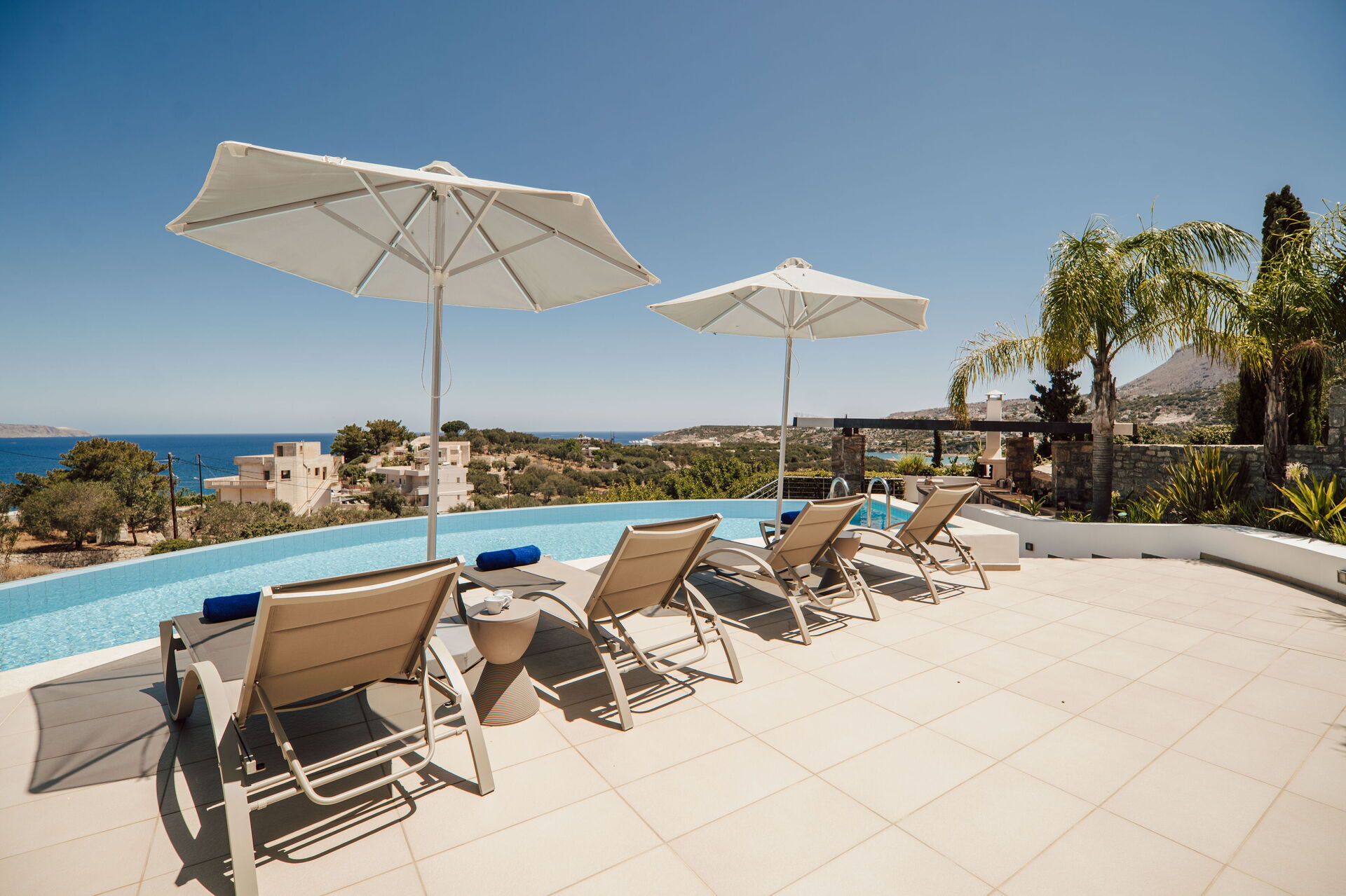 Im Außenbereich gibt es herrliche Panoramaterrassen mit Sonnenliegen, auf denen man sich von der Küstenbrise umschmeicheln lassen und die atemberaubende Aussicht auf die Bucht von Souda und das kristallklare Meer Kretas genießen kann.