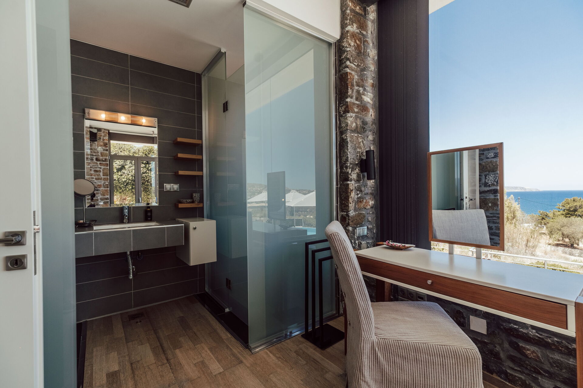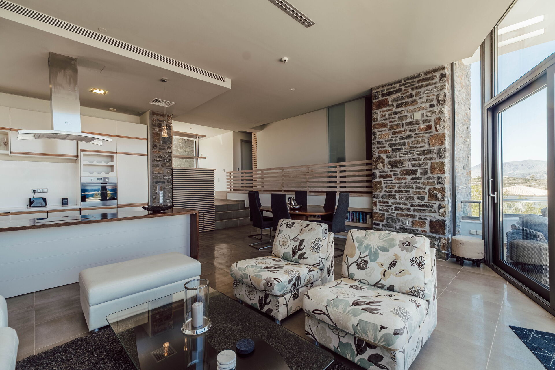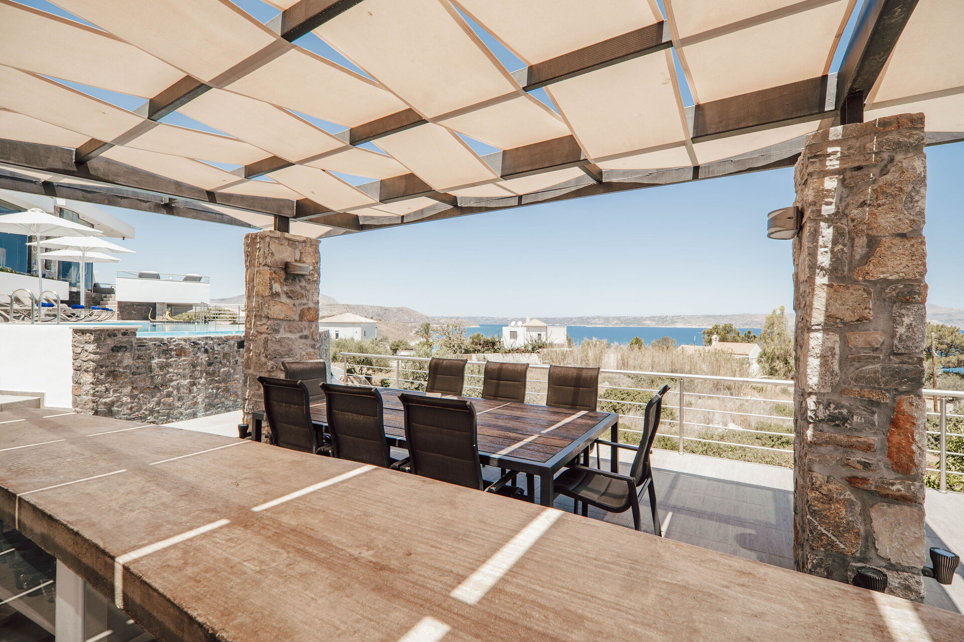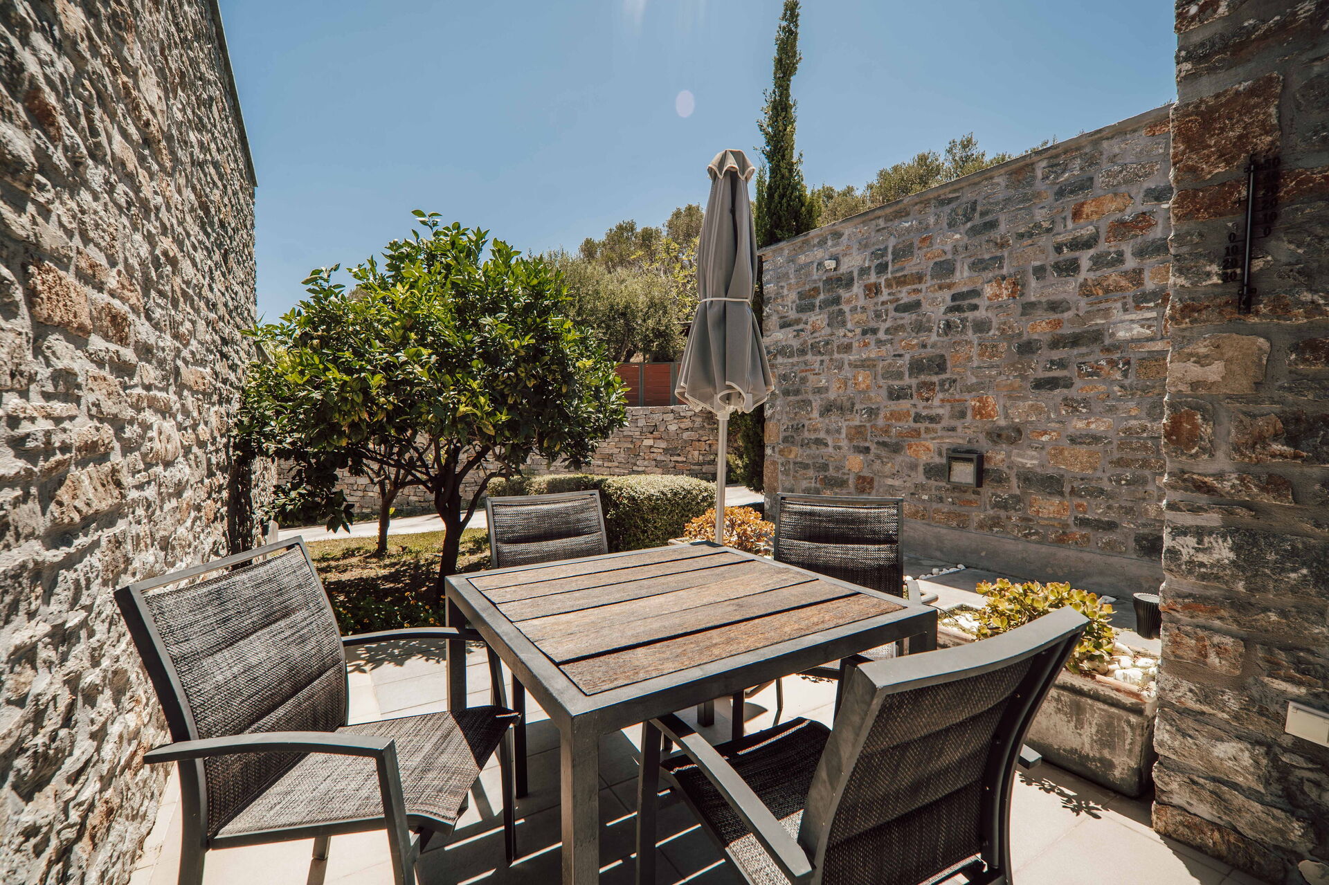 Im Außenbereich gibt es herrliche Panoramaterrassen mit Sonnenliegen, auf denen man sich von der Küstenbrise umschmeicheln lassen und die atemberaubende Aussicht auf die Bucht von Souda und das kristallklare Meer Kretas genießen kann.