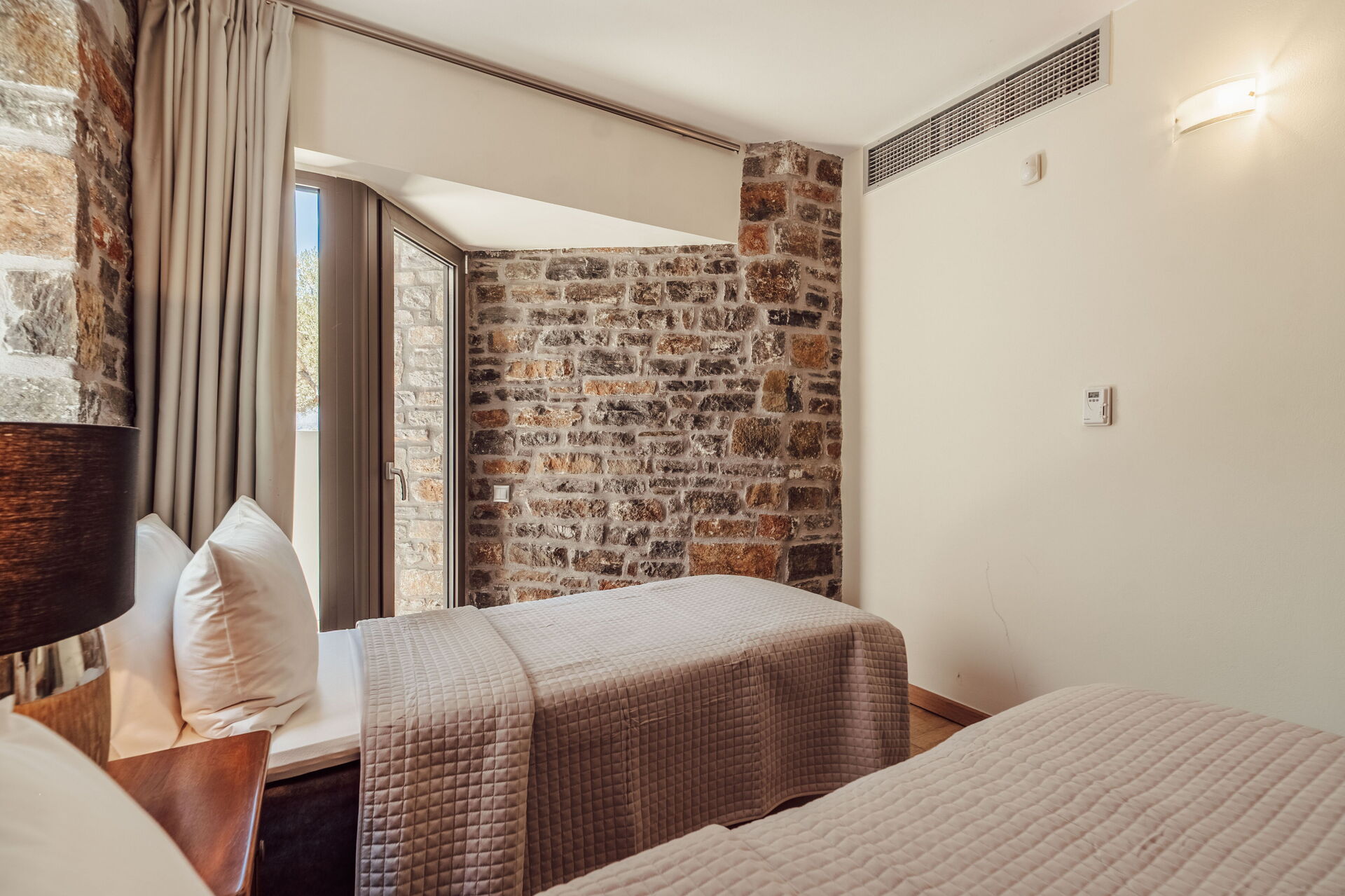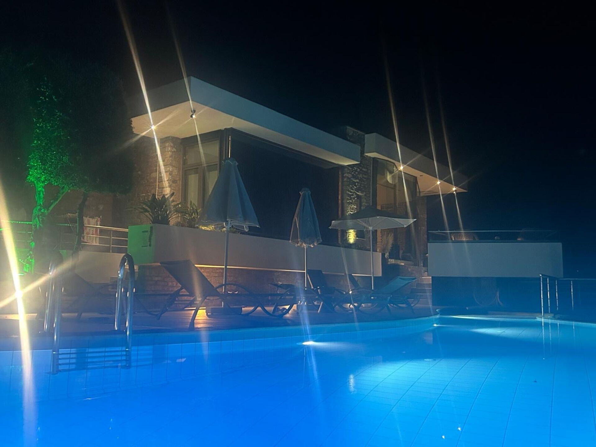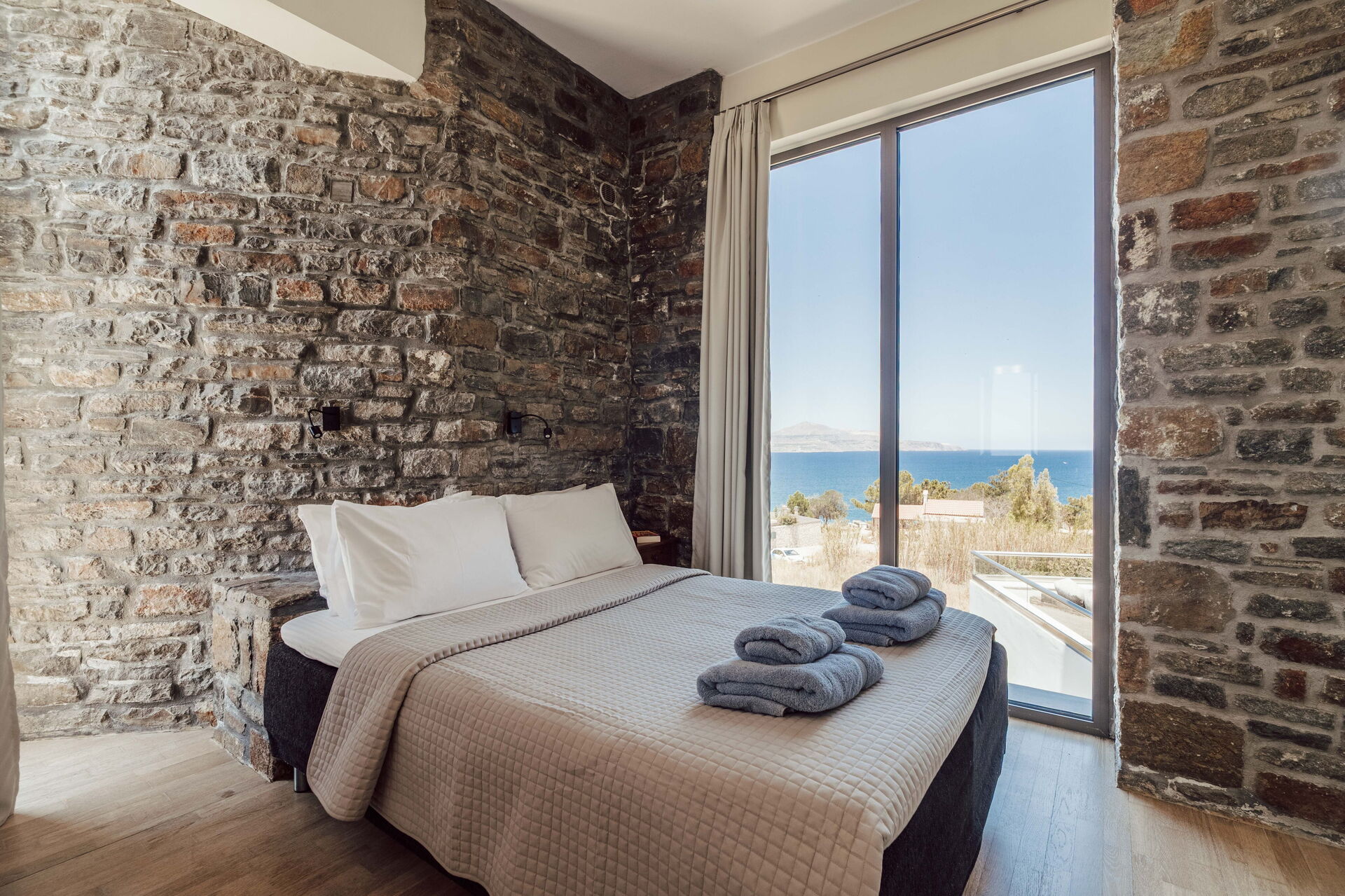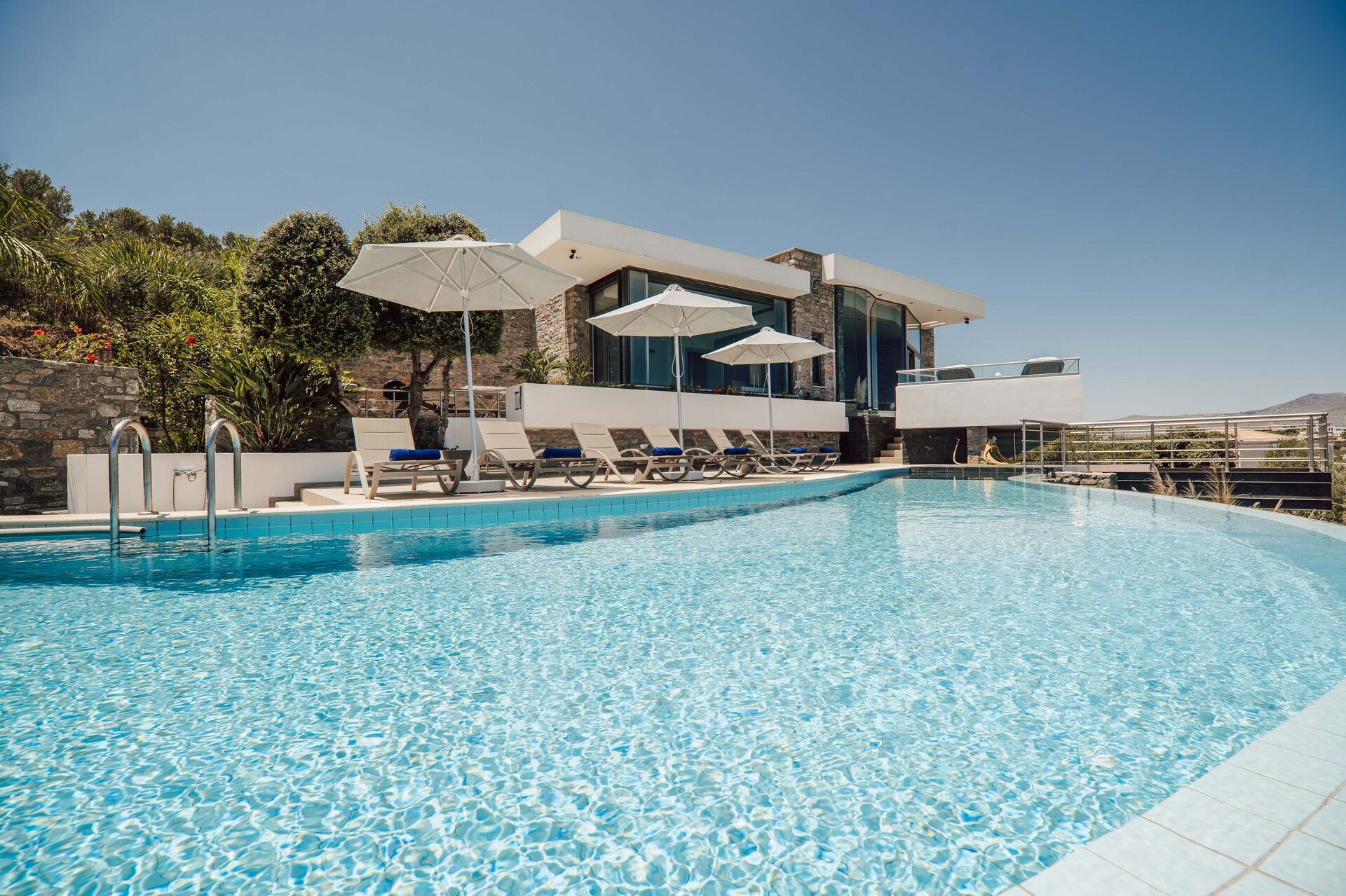 Im Außenbereich gibt es herrliche Panoramaterrassen mit Sonnenliegen, auf denen man sich von der Küstenbrise umschmeicheln lassen und die atemberaubende Aussicht auf die Bucht von Souda und das kristallklare Meer Kretas genießen kann.