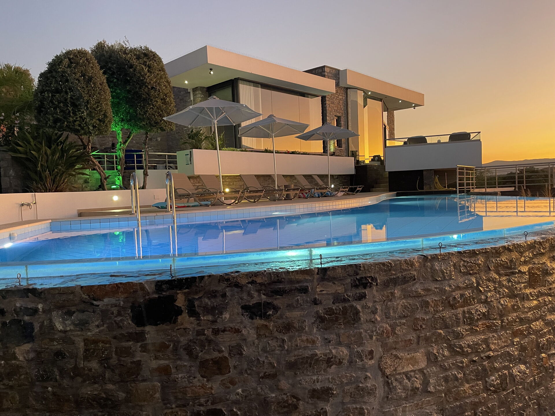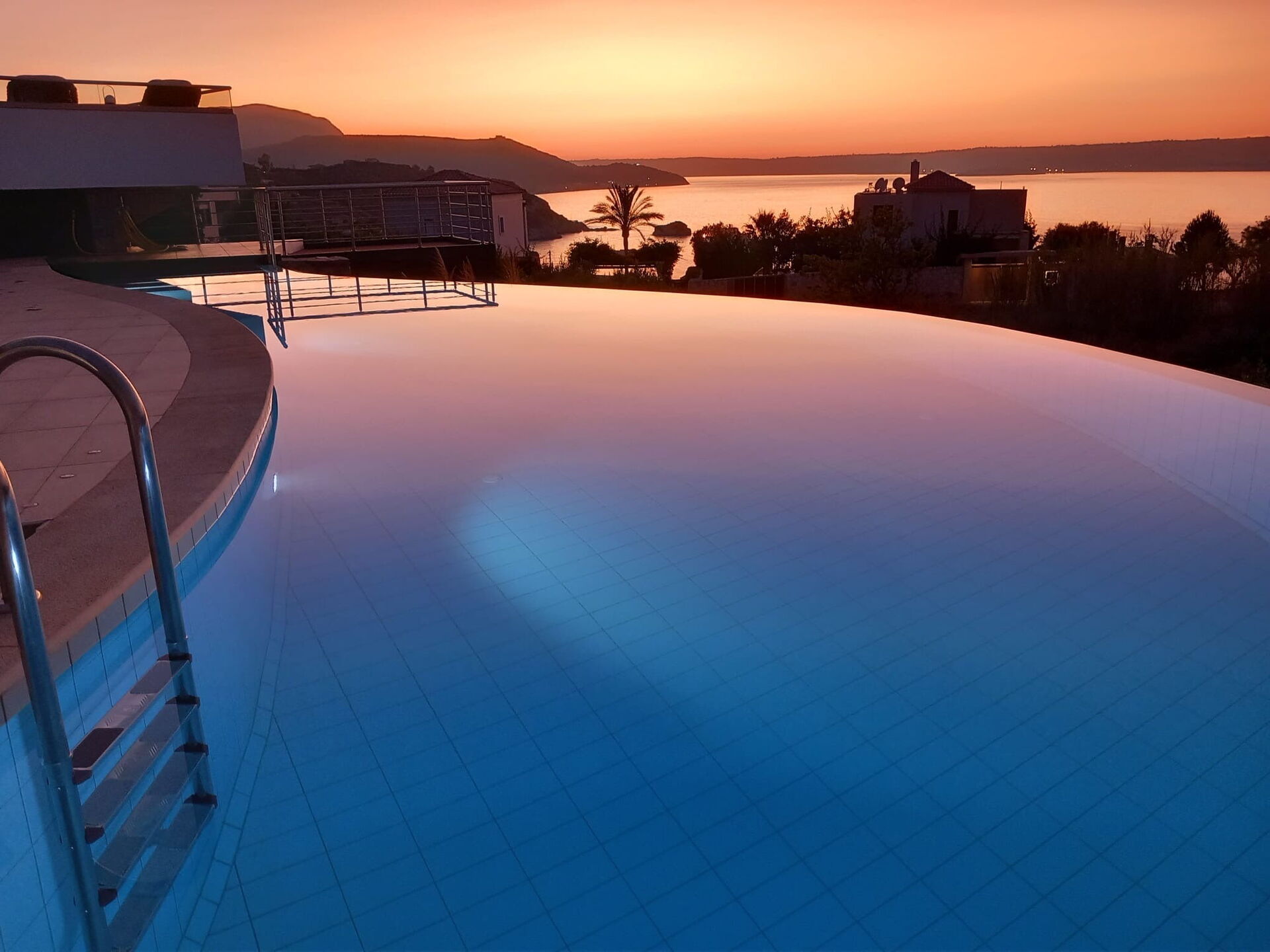 Das große private Schwimmbad, das auf Anfrage beheizt werden kann, ist nachts wunderschön beleuchtet, bietet dank seines unregelmäßigen Designs absolute Privatsphäre und ist der perfekte Ort, um ein erfrischendes Bad oder einen Drink zu genießen und dabei den Sonnenuntergang über dem Meer zu beobachten.