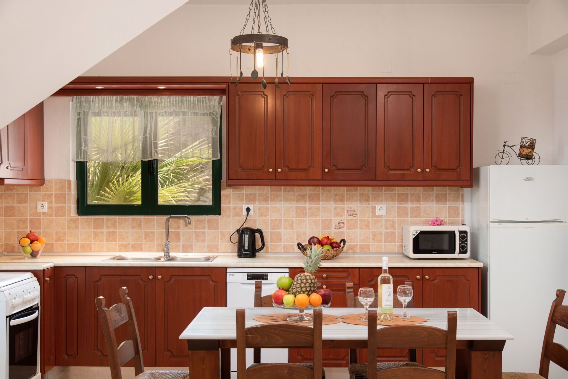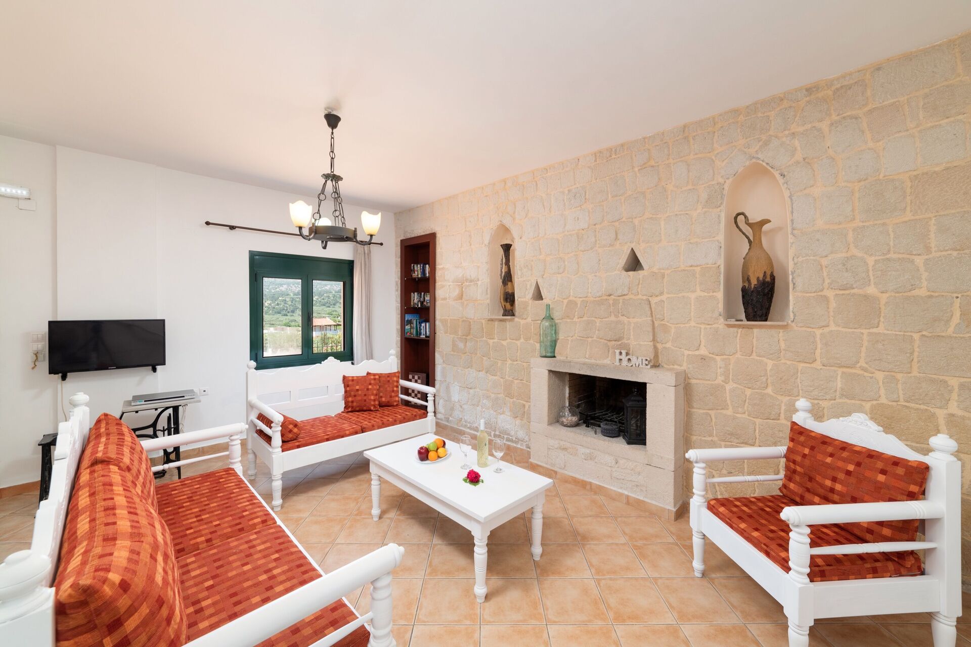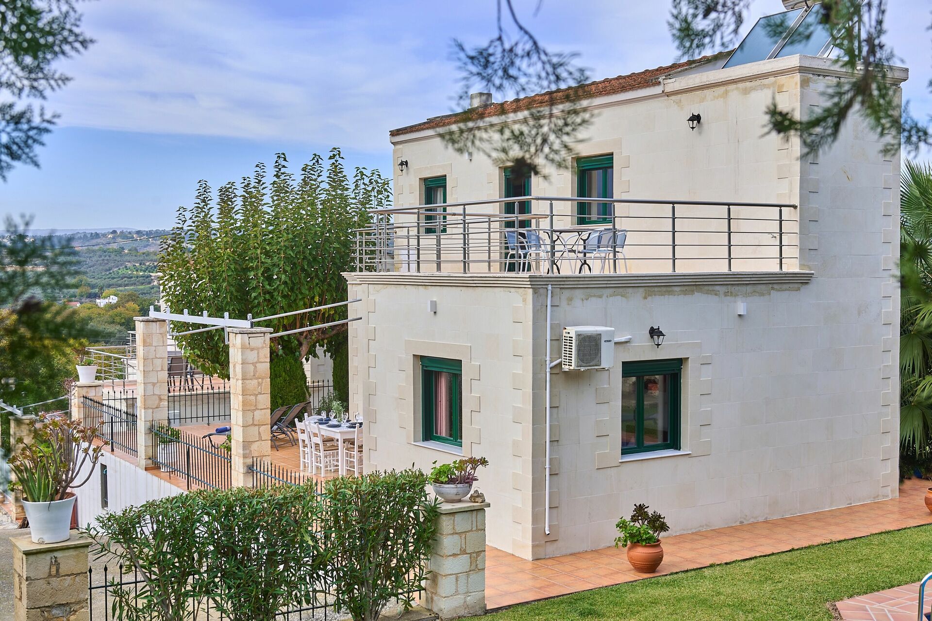 Die Villa ist sehr komfortabel und ideal für einen Urlaub mit der Familie oder Freunden.Im Innenbereich erstreckt sich die Villa auf zwei Etagen. Die Räume sind klimatisiert und geschmack- und stilvoll mit lokalen Materialien und traditionellen kretischen Elementen eingerichtet.