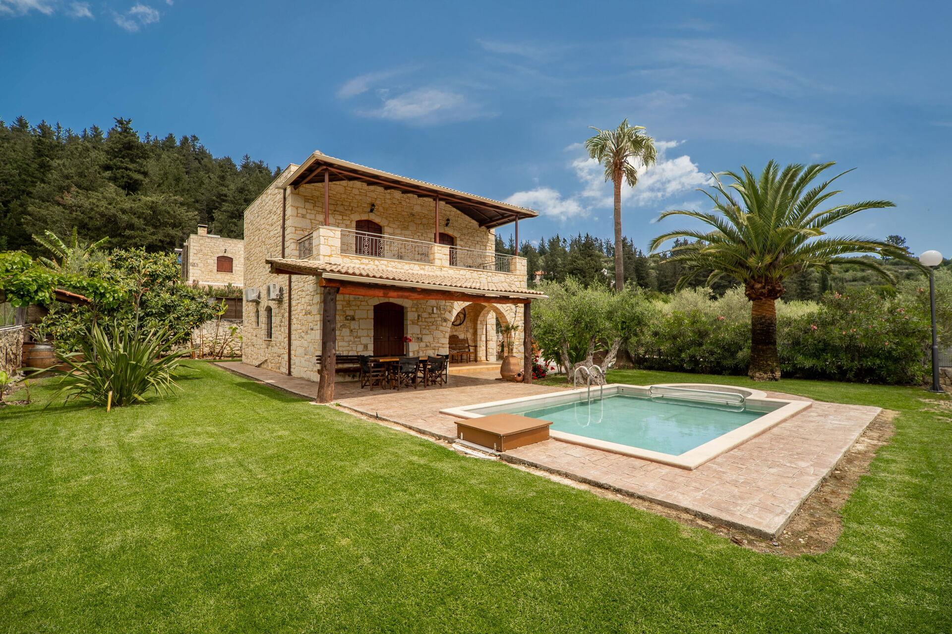 Mit 3 Schlafzimmern, 2 Bädern, Klimaanlage und wunderschön eingerichtetem privaten Außenbereichen ist diese Villa mit privatem Schwimmbad auf Kreta das perfekte Ferienhaus für eine Familie oder eine Gruppe von Freunden, die Entspannung in idyllischer Umgebung suchen.
