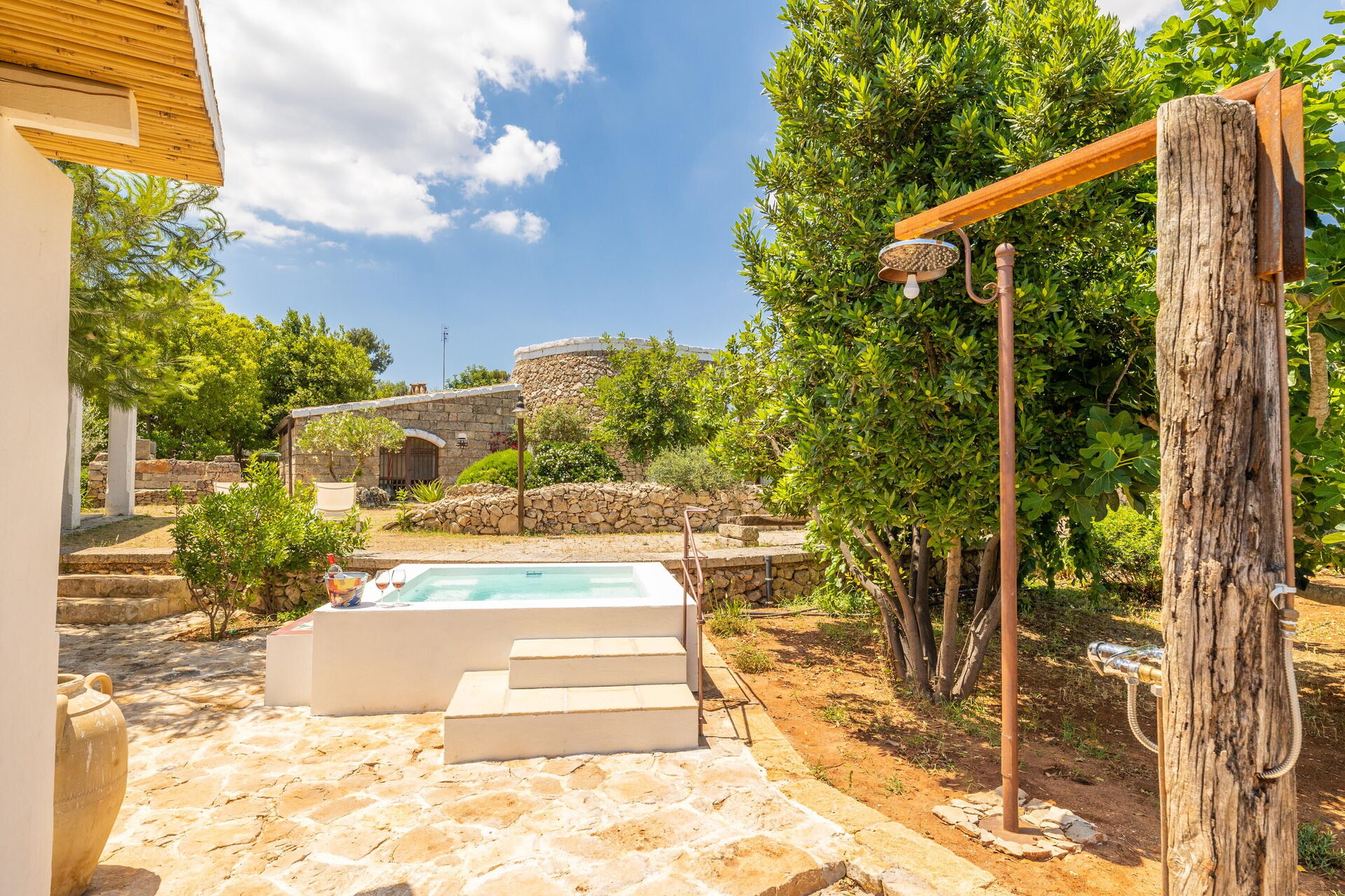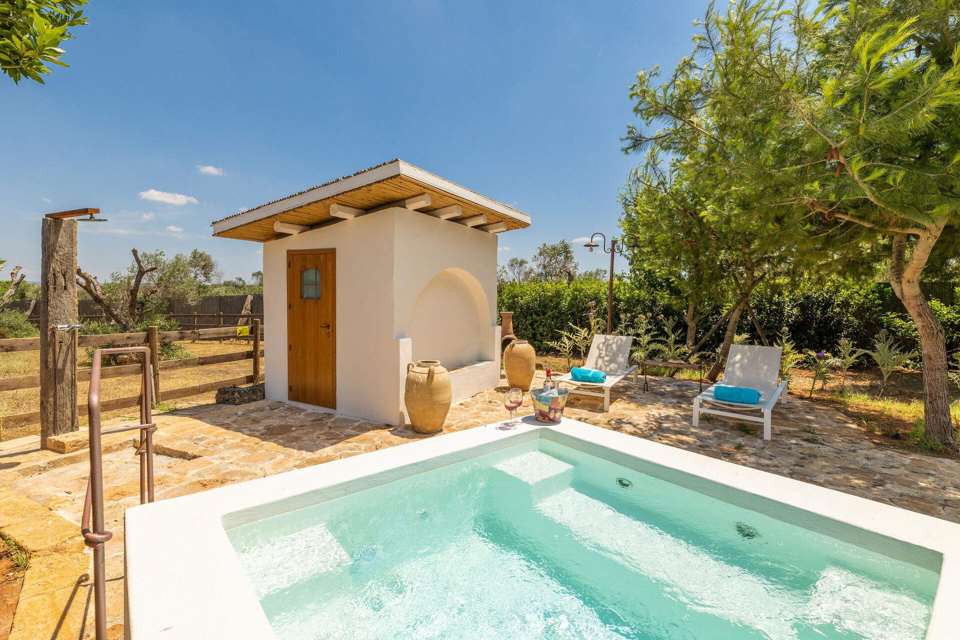 Im Aussenbereich befindet sich ein weiteres WC und ein weiteres Badzimmer mit Dusche. Whirlpool für den privaten Gebrauch.