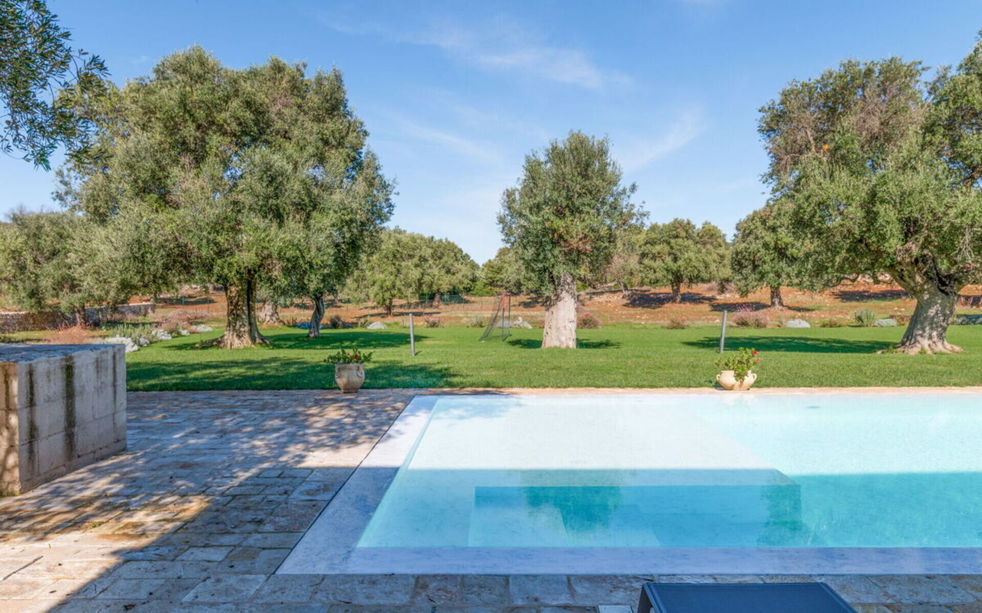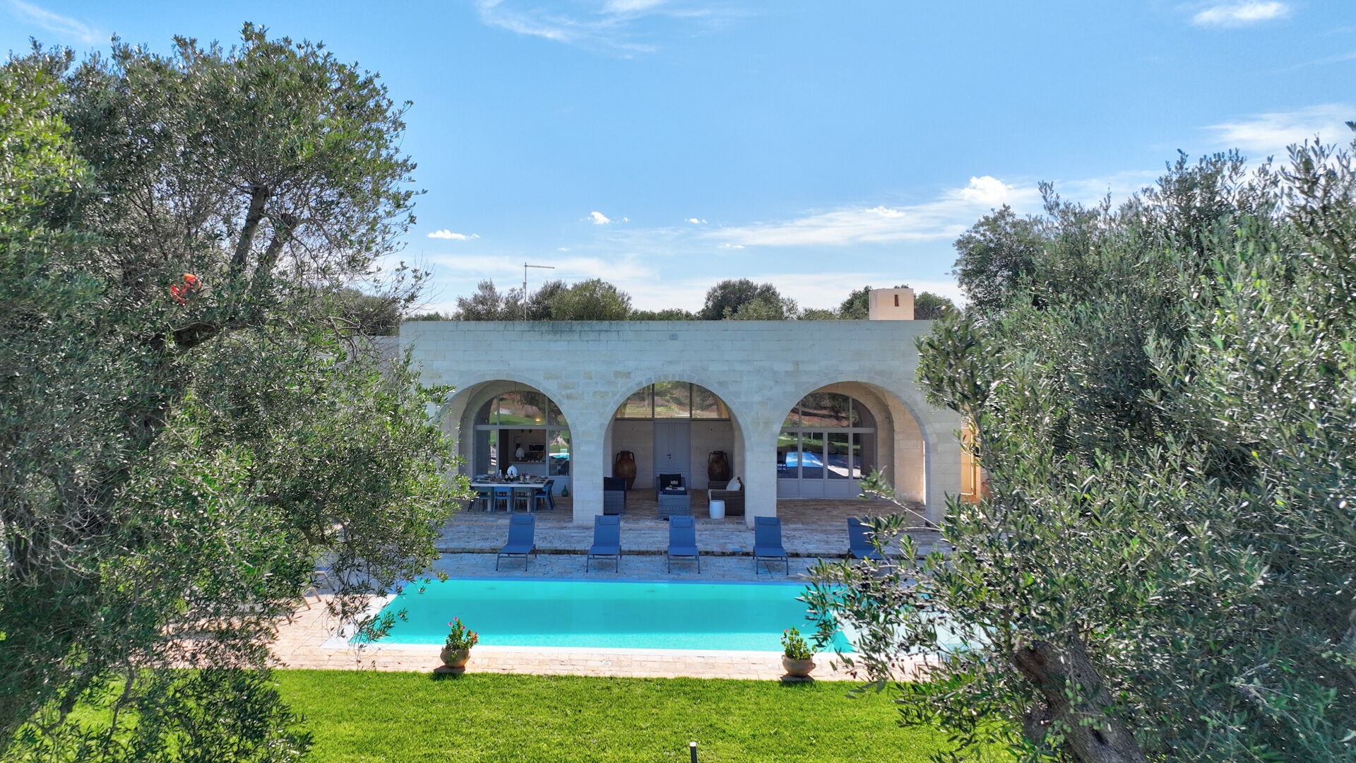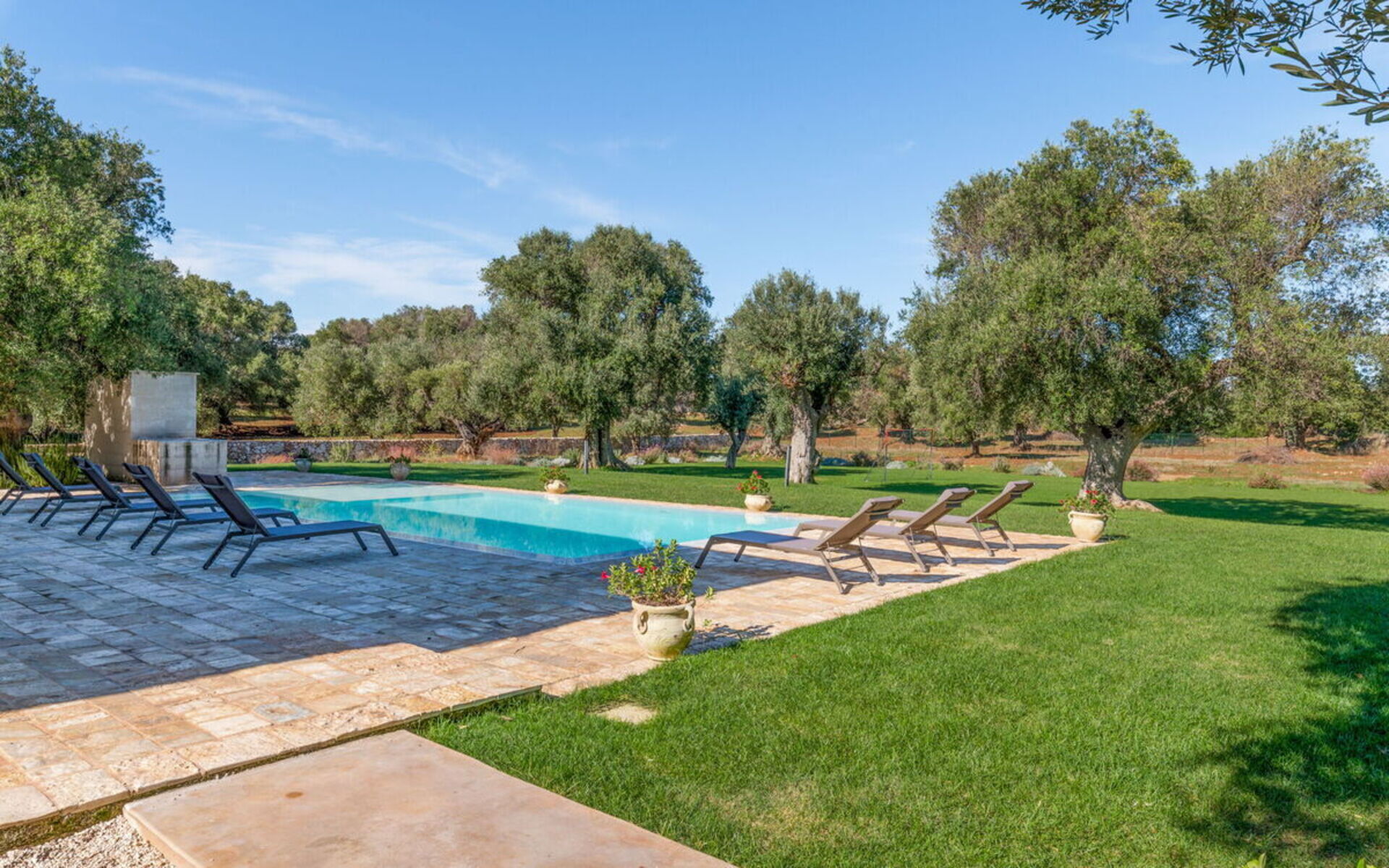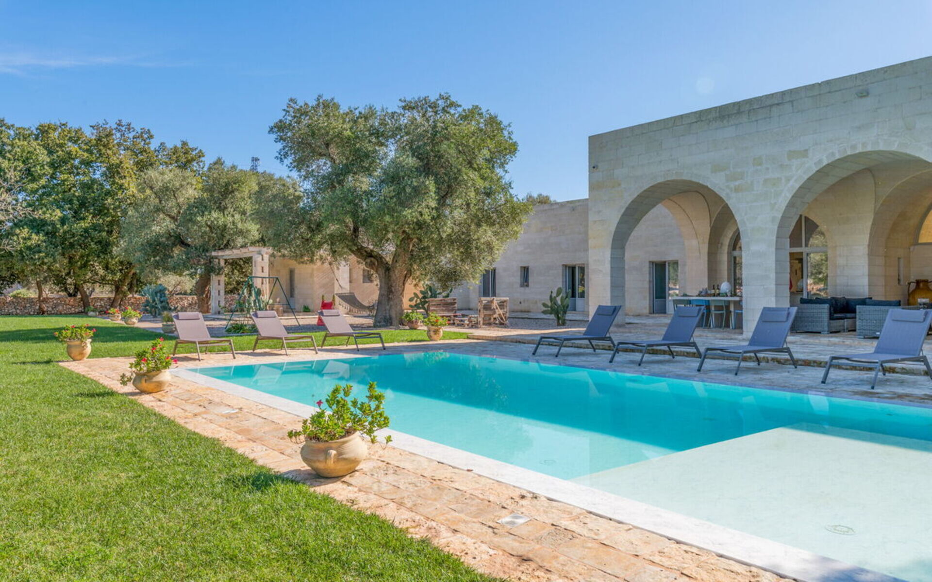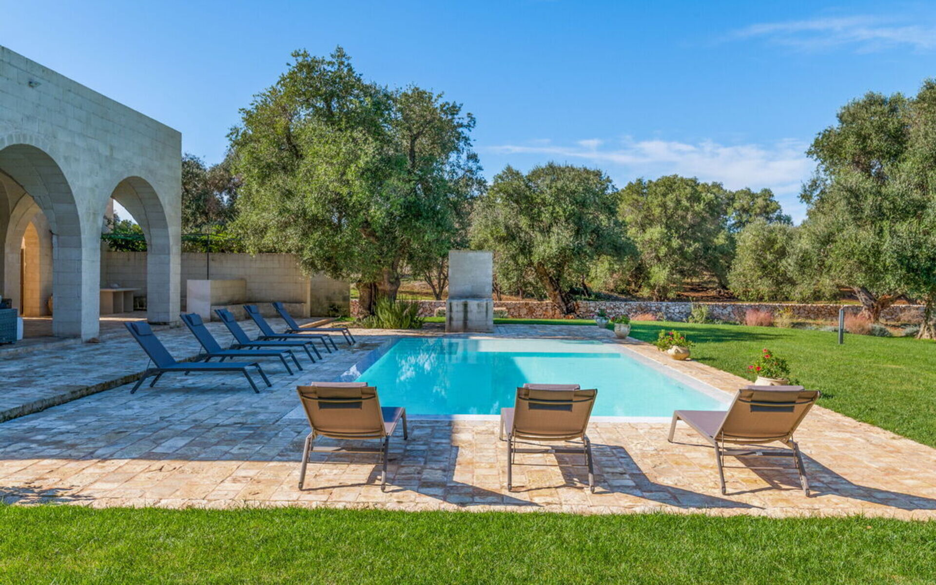 Im großen Garten mit jahrhundertealten Olivenbäumen kann man am Infinity-Schwimmbad entspannen oder dank der eleganten Loggia mit Blick auf das Schwimmbad und dem nahe gelegenen Grillplatz gesellige Momente genießen.