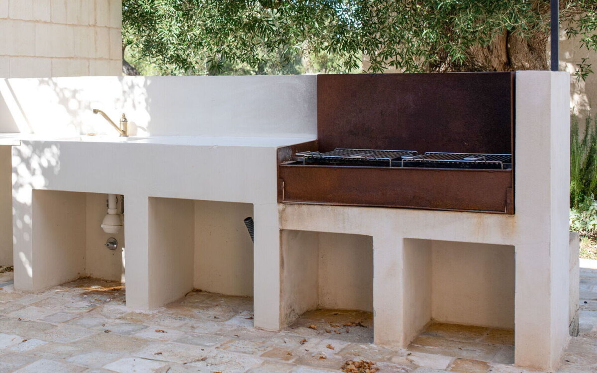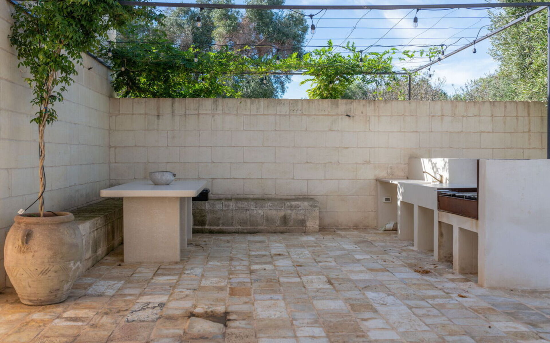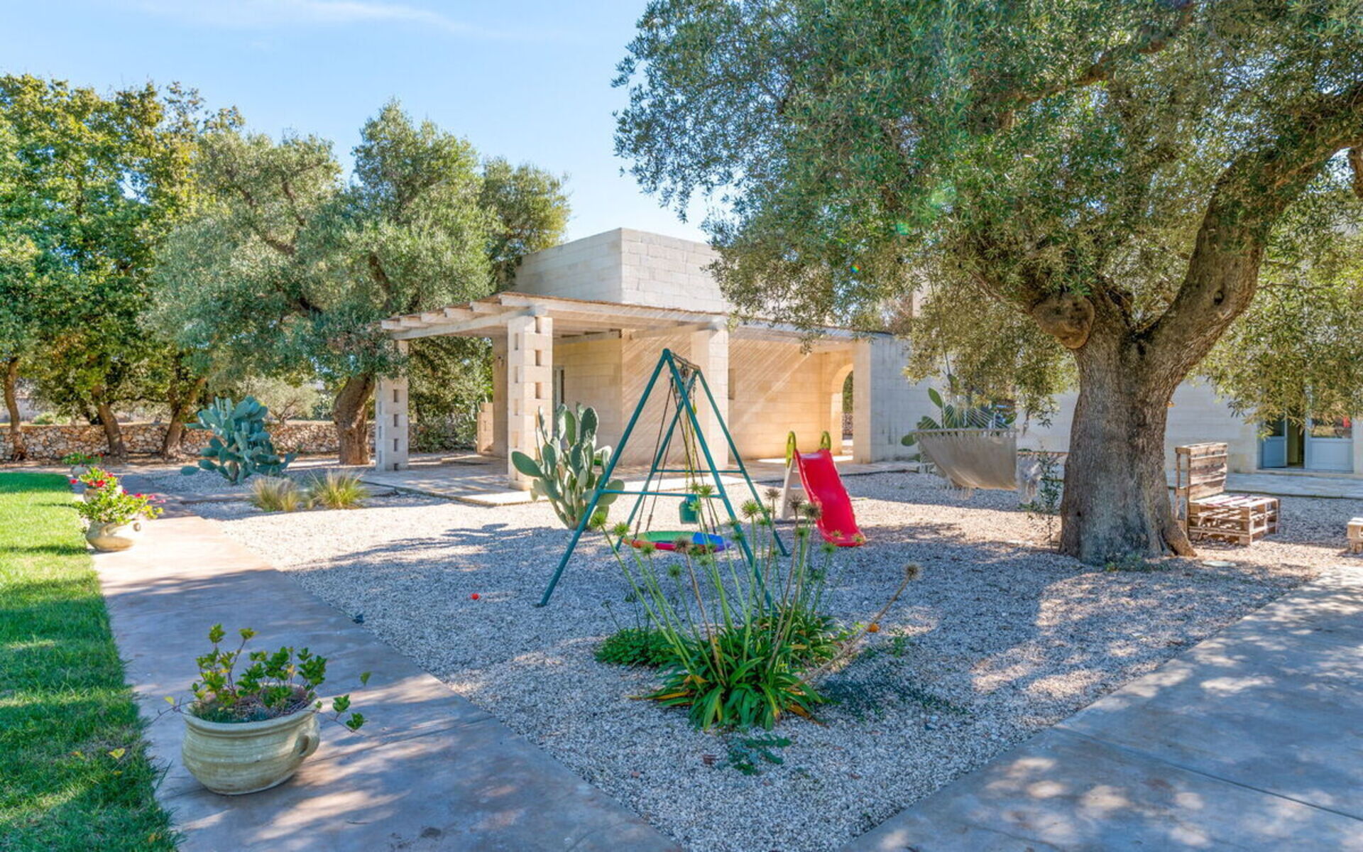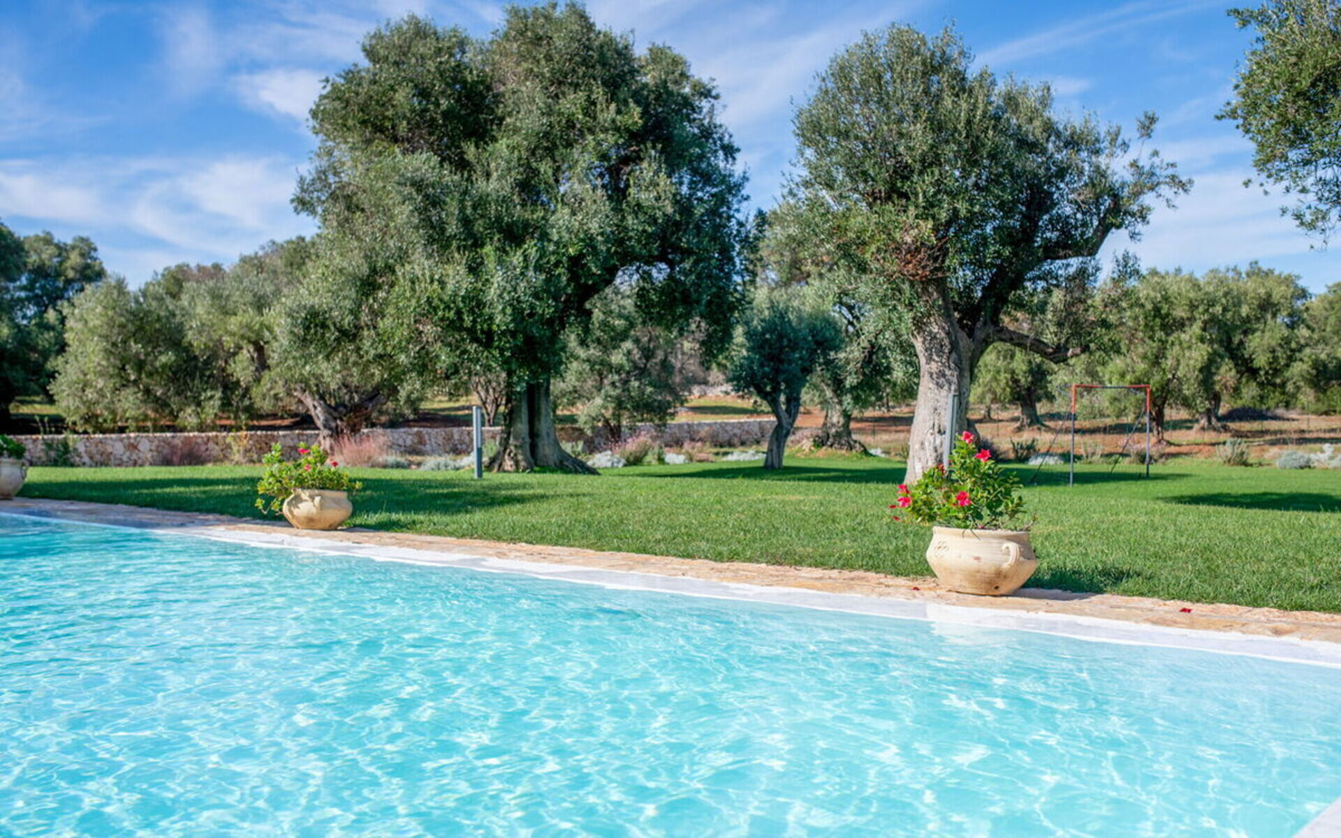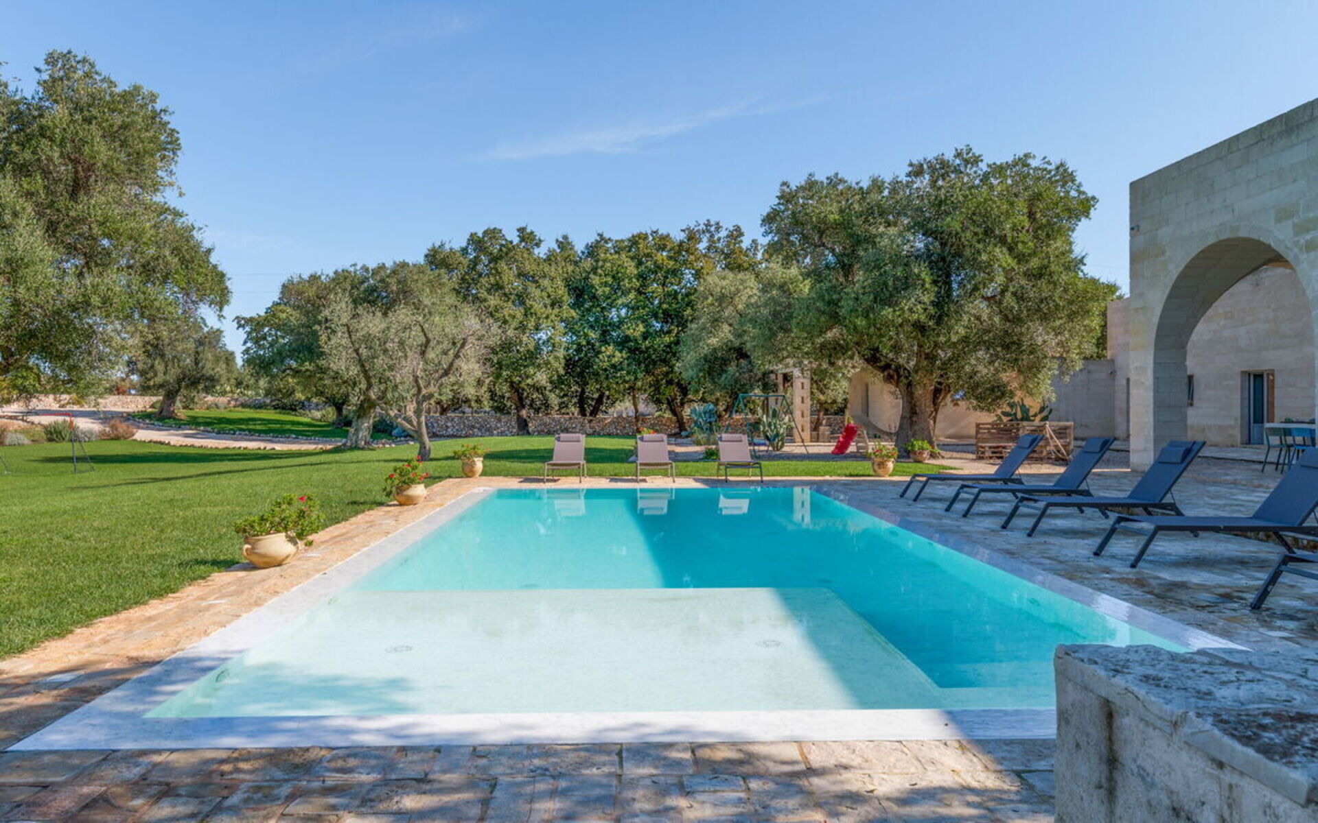 Im großen Garten mit jahrhundertealten Olivenbäumen kann man am Infinity-Schwimmbad entspannen oder dank der eleganten Loggia mit Blick auf das Schwimmbad und dem nahe gelegenen Grillplatz gesellige Momente genießen.