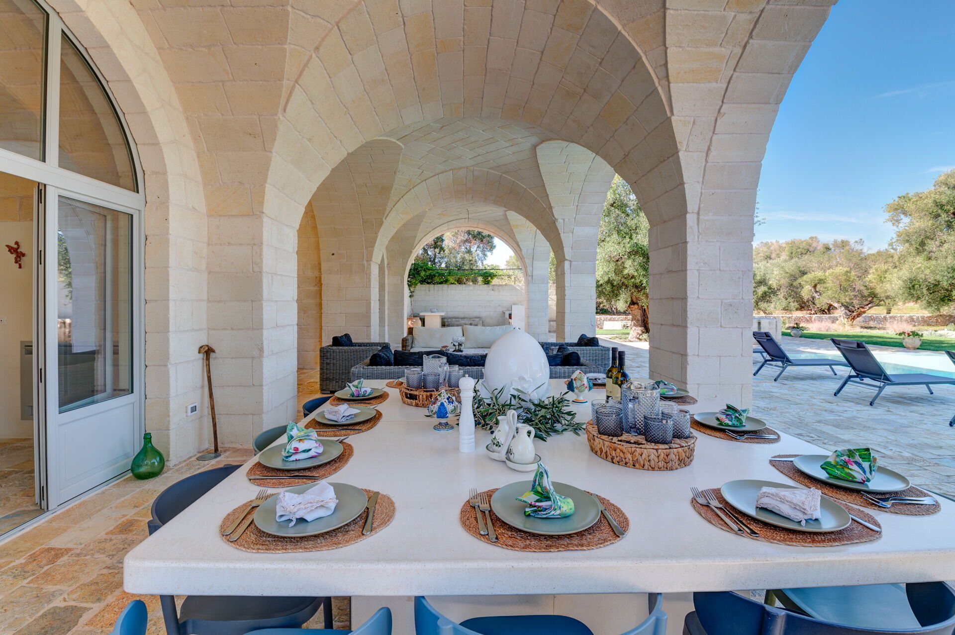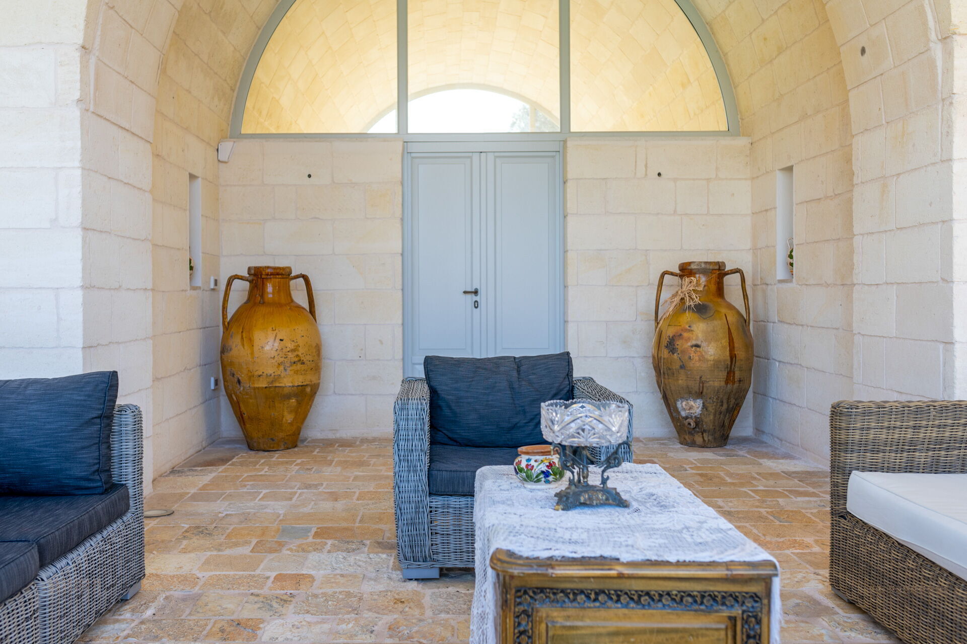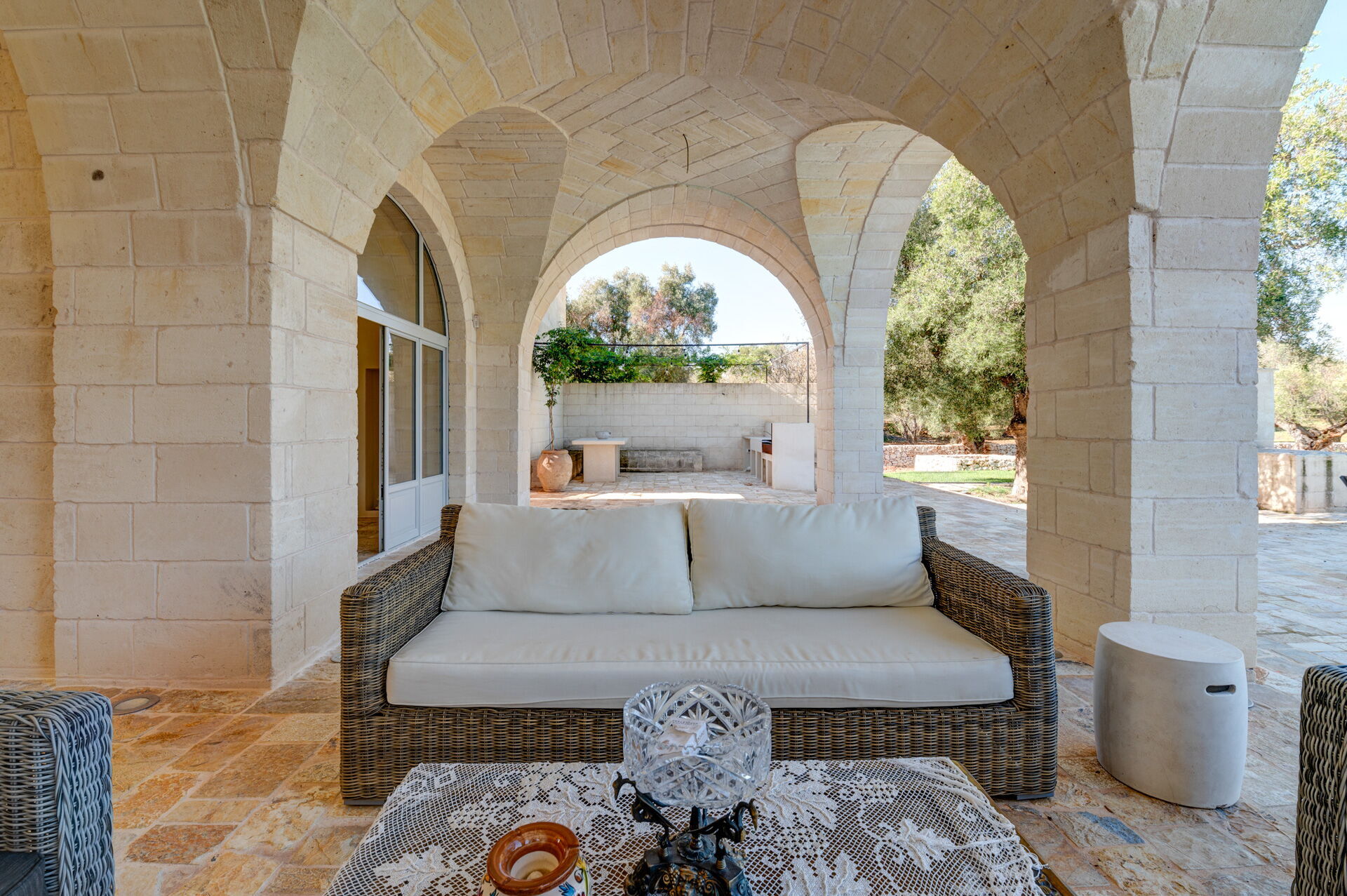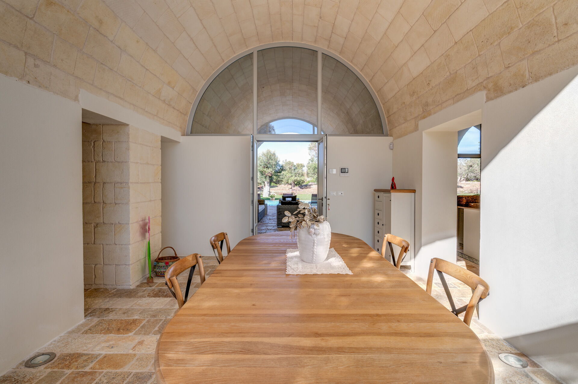 Der Innenbereich der Villa zeichnet sich durch edle Einrichtung und Helligkeit aus, aufgrund der großen Fenster aus, die perfekt mit der traditionellen architektonischen Struktur des Salento (gewölbte Decken, Steinmauern und weiße Wände) harmonieren.