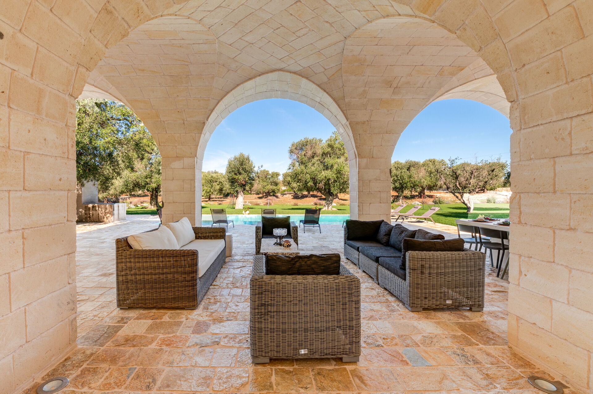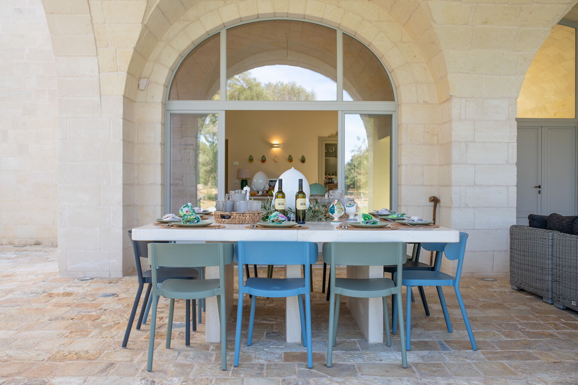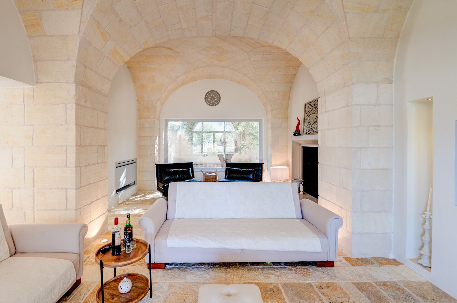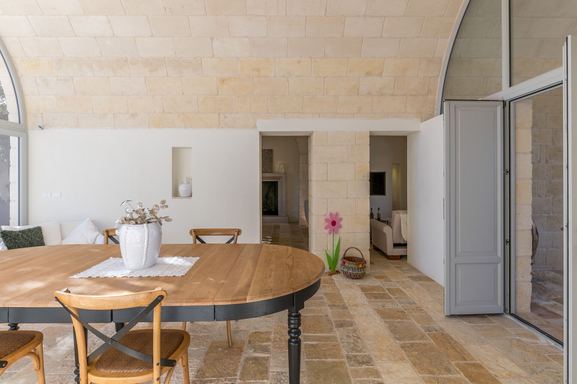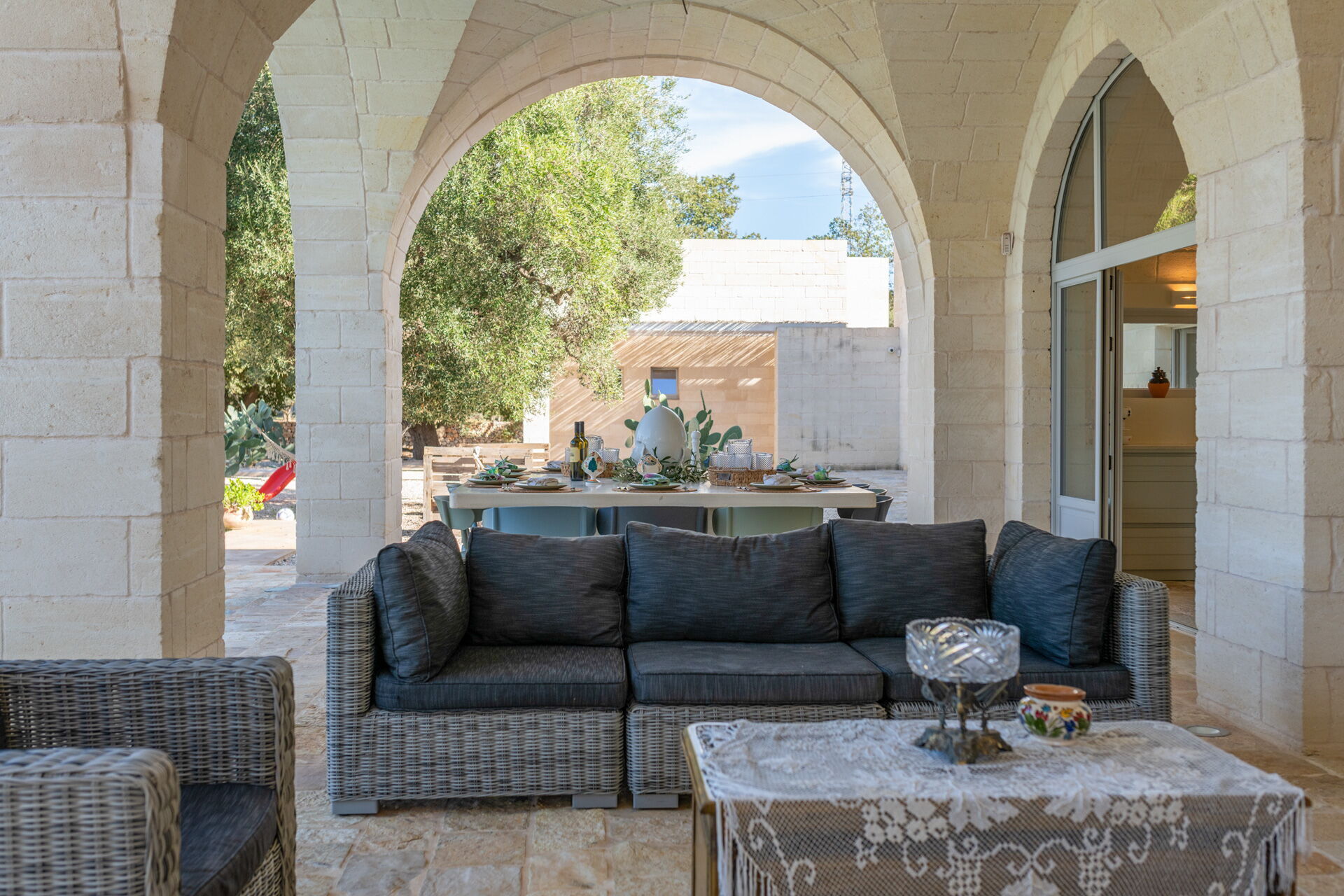 Der Innenbereich der Villa zeichnet sich durch edle Einrichtung und Helligkeit aus, aufgrund der großen Fenster aus, die perfekt mit der traditionellen architektonischen Struktur des Salento (gewölbte Decken, Steinmauern und weiße Wände) harmonieren.